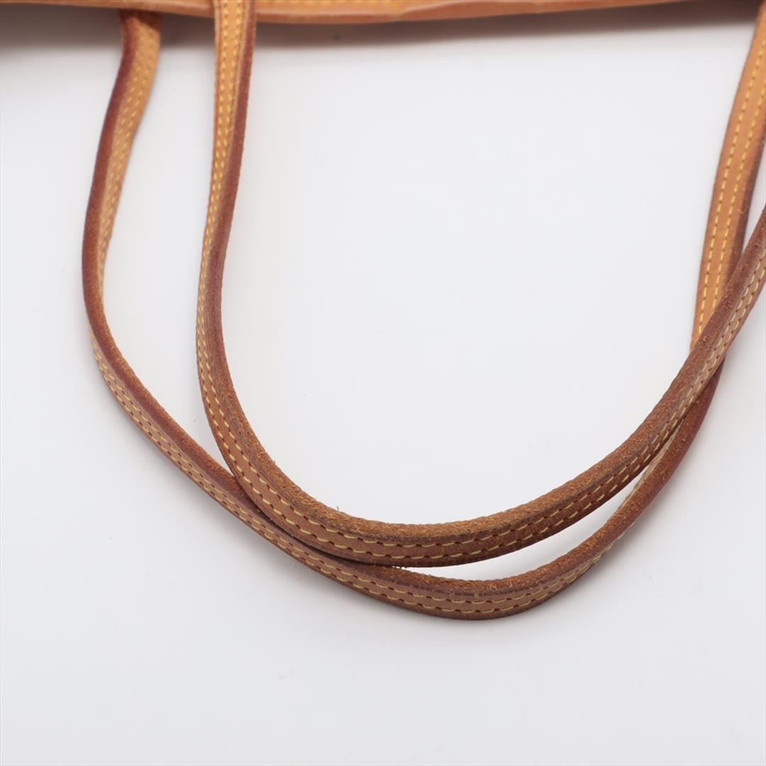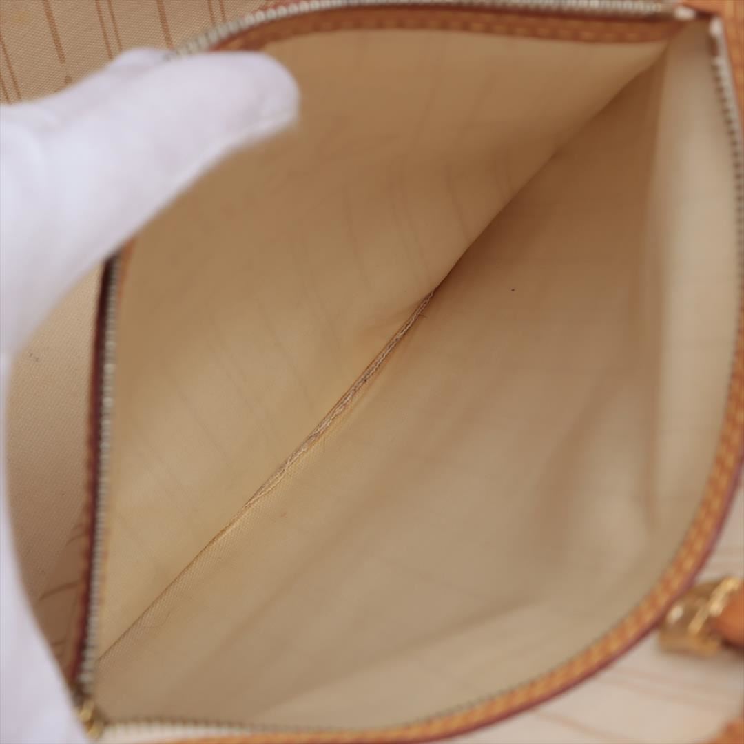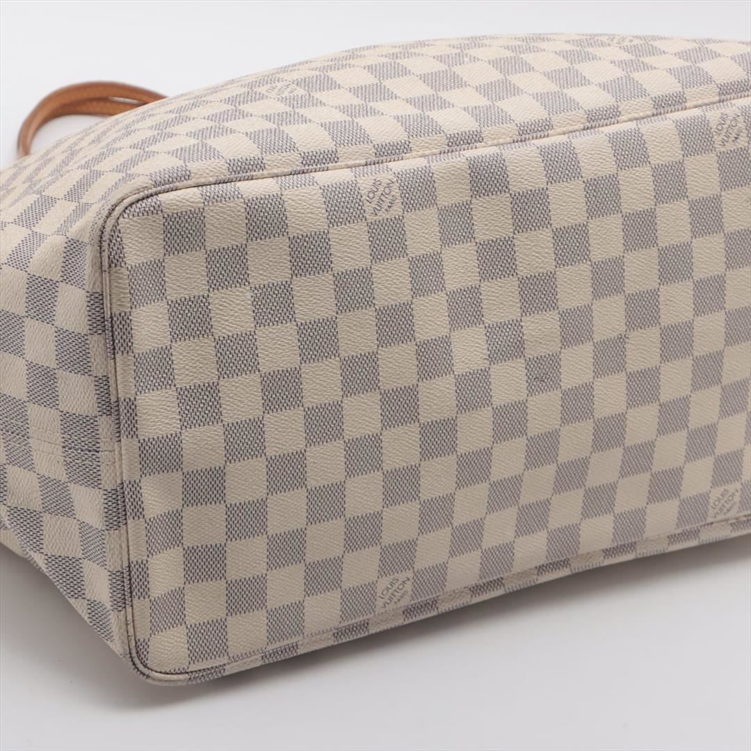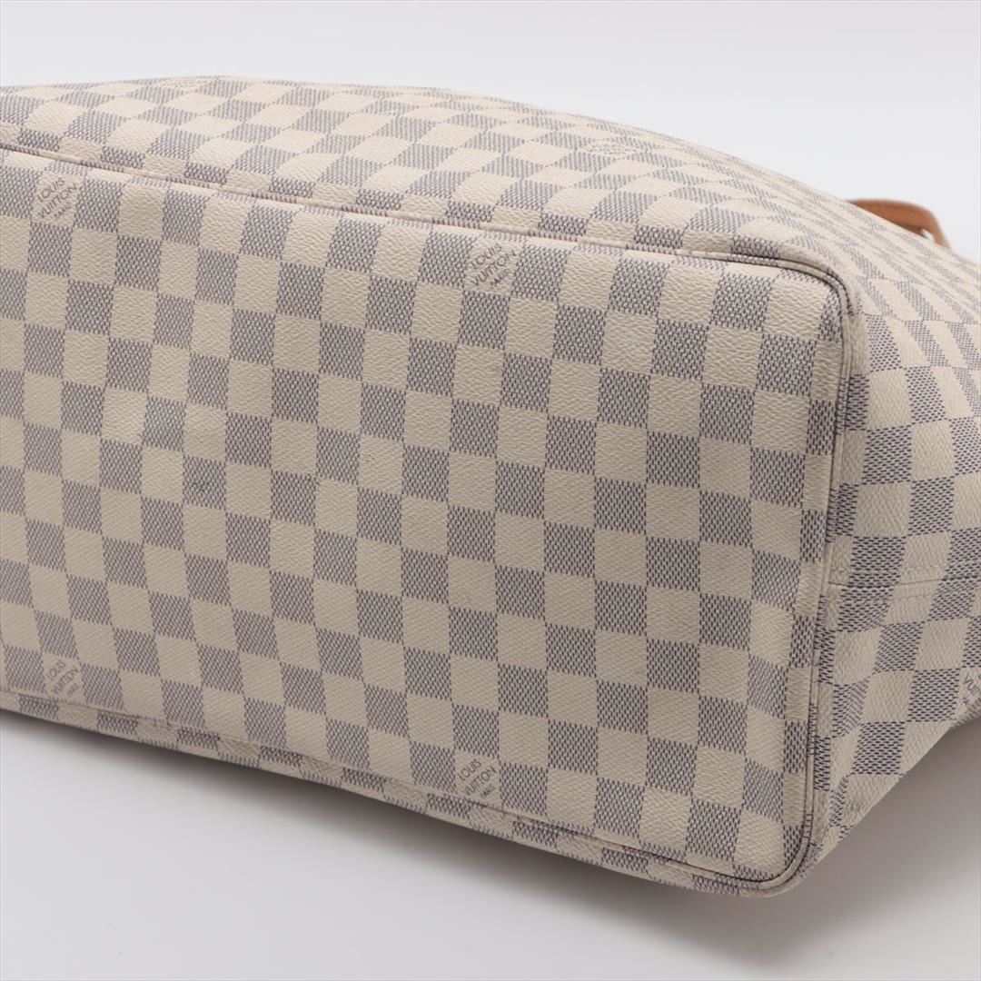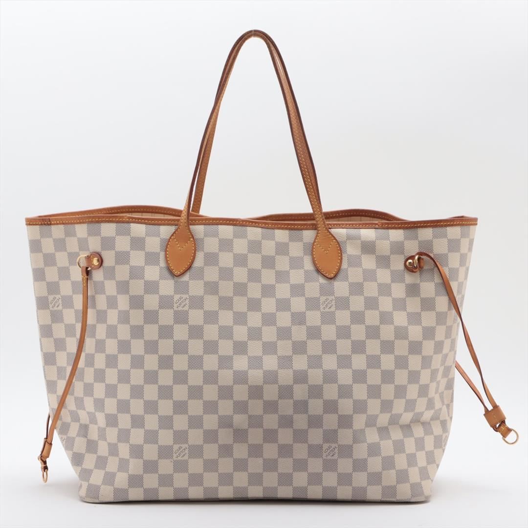 Ivory and blue Damier Azur coated canvas Louis Vuitton Neverfull GM with gold-tone hardware, tan vachetta leather accents, dual flat shoulder straps, tan and creme striped canvas lining, single zip pocket at interior wall, lobster clasp closure at top and