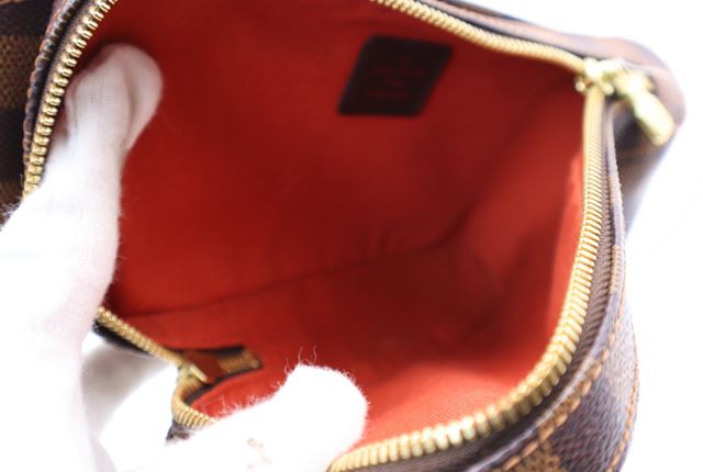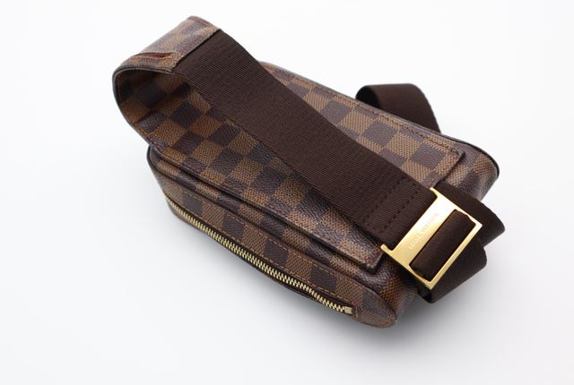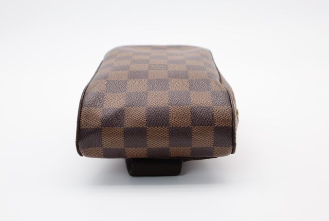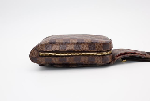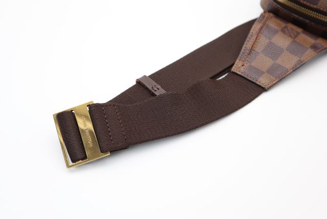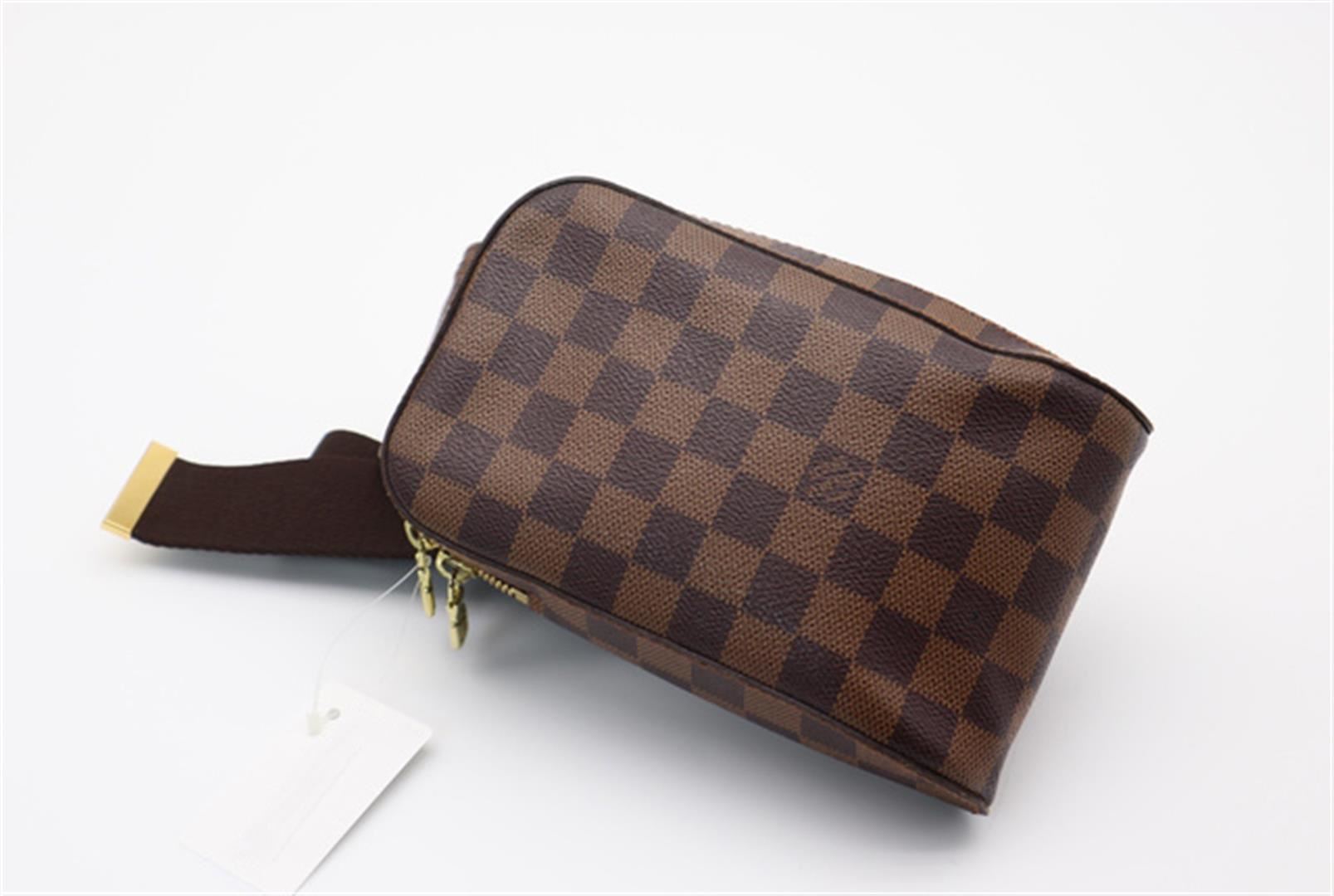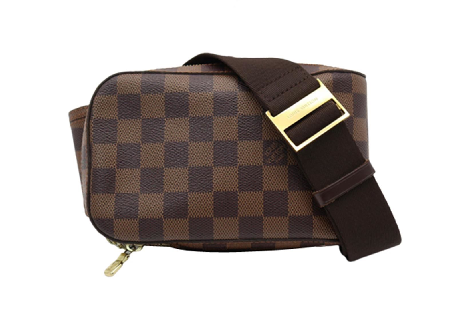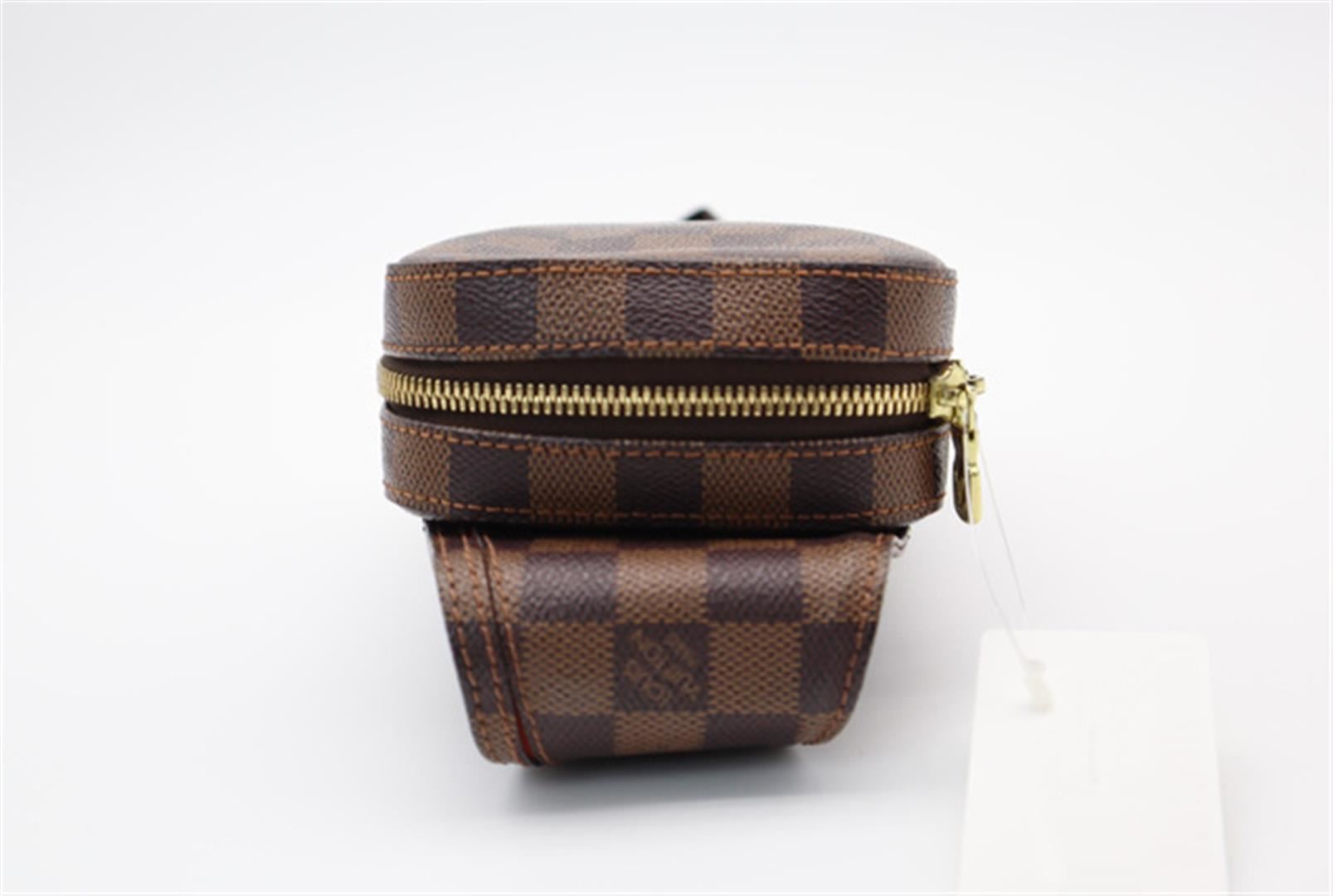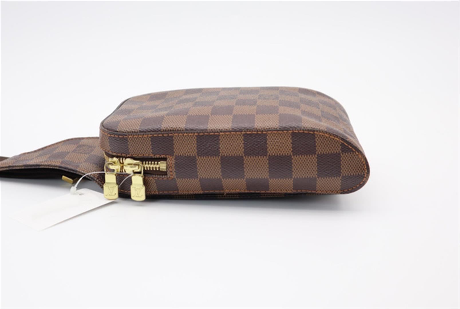 Brown Damier Ebene coated canvas Louis Vuitton Geronimos waist bag with gold-tone hardware, single adjustable waist strap with buckle closure, single pocket at exterior with snap closure, red canvas lining and zip around closure. 7.5"x1.75"x5.75"xBag D