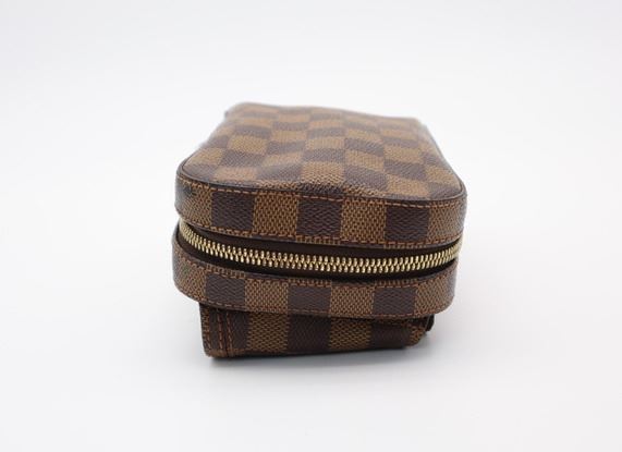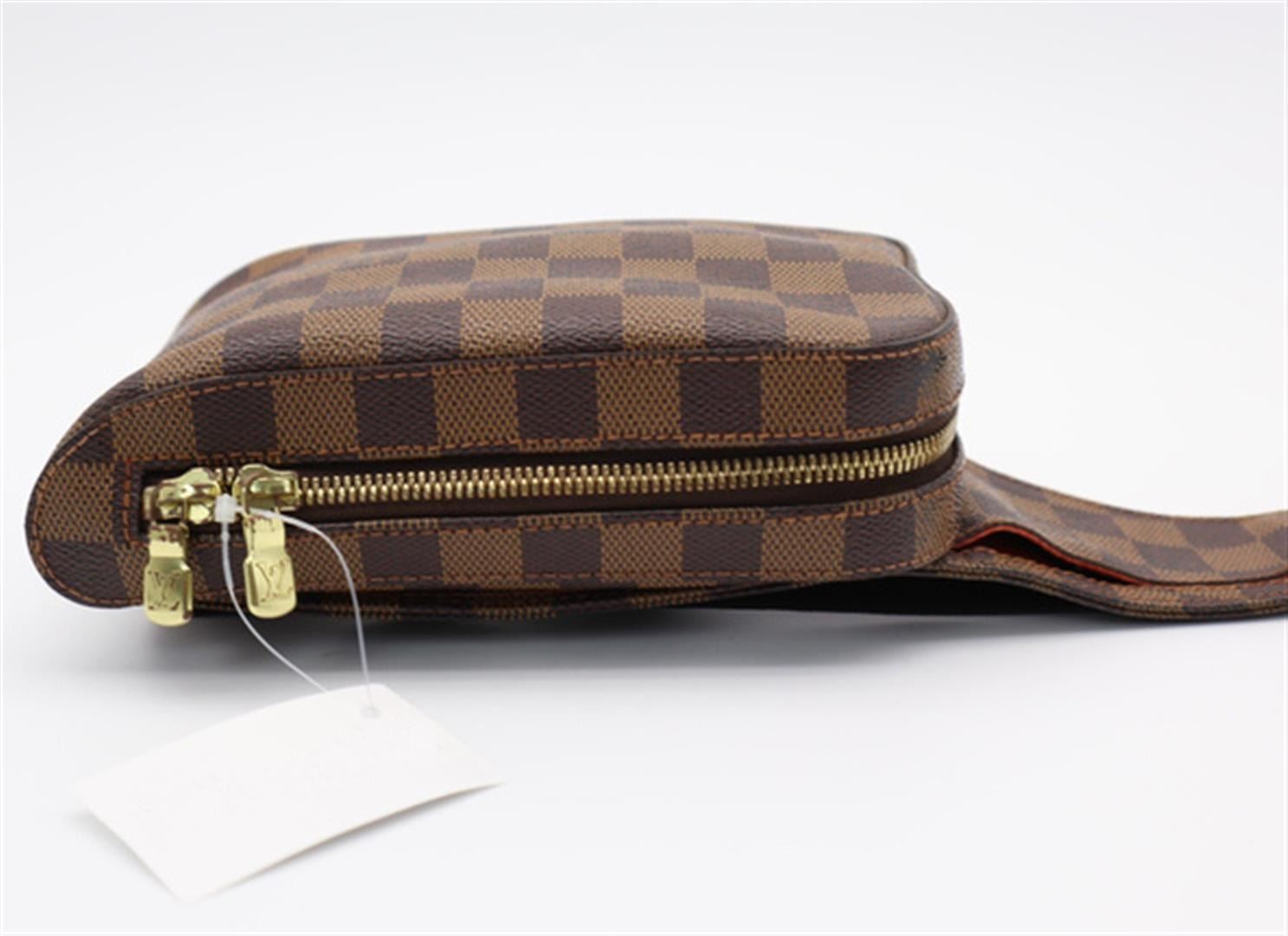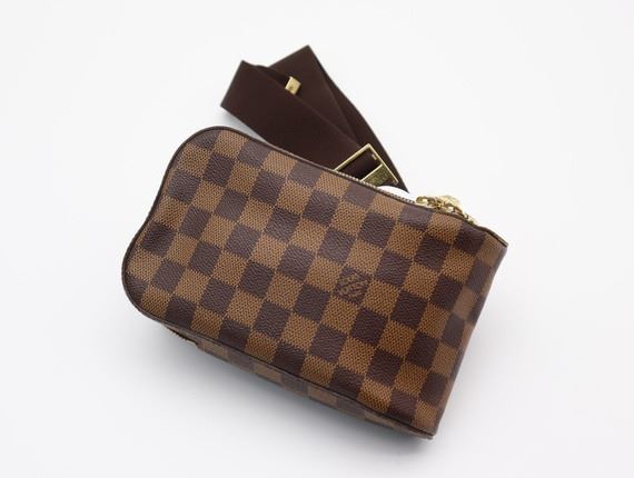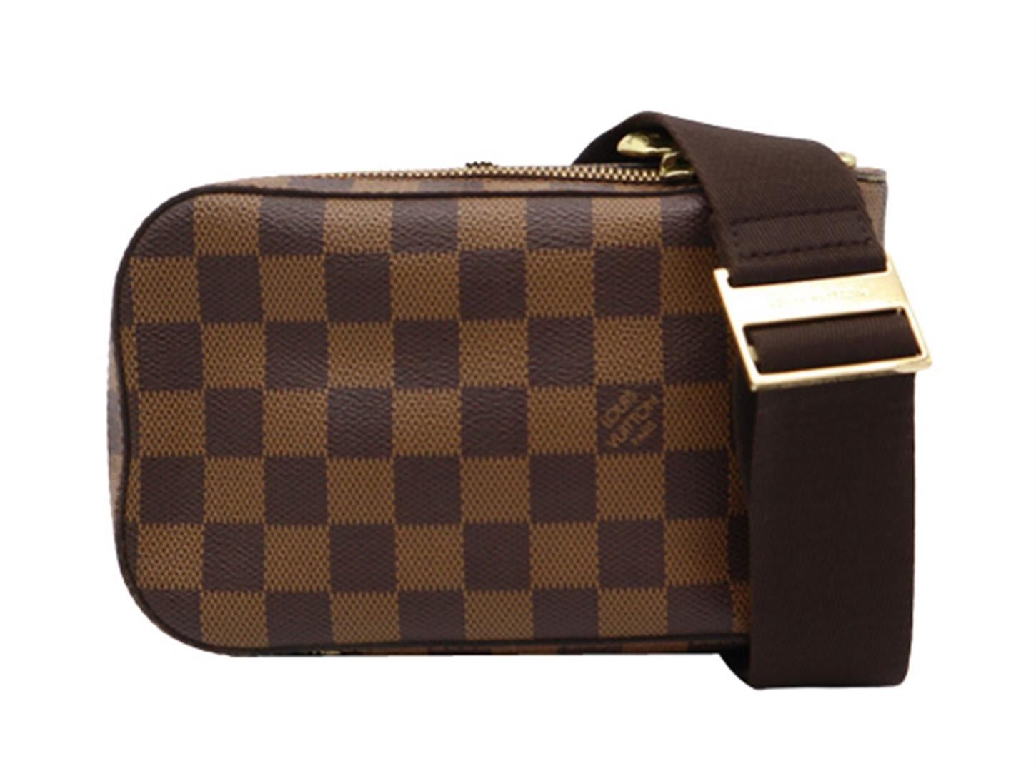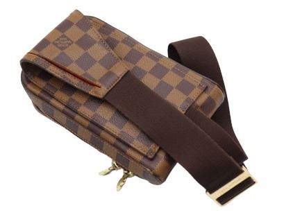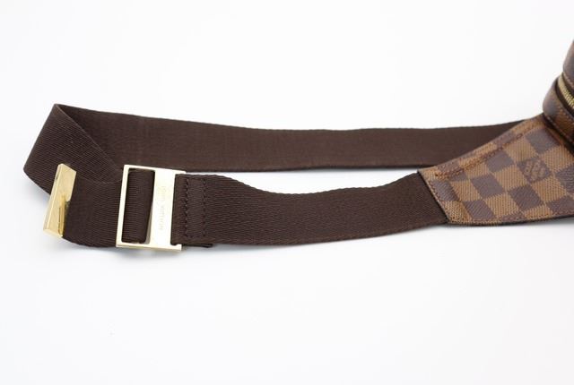 Brown Damier Ebene coated canvas Louis Vuitton Geronimos waist bag with gold-tone hardware, single adjustable waist strap with buckle closure, single pocket at exterior with snap closure, red canvas lining and zip around closure. 7.5"x1.75"x5.75"xBag D