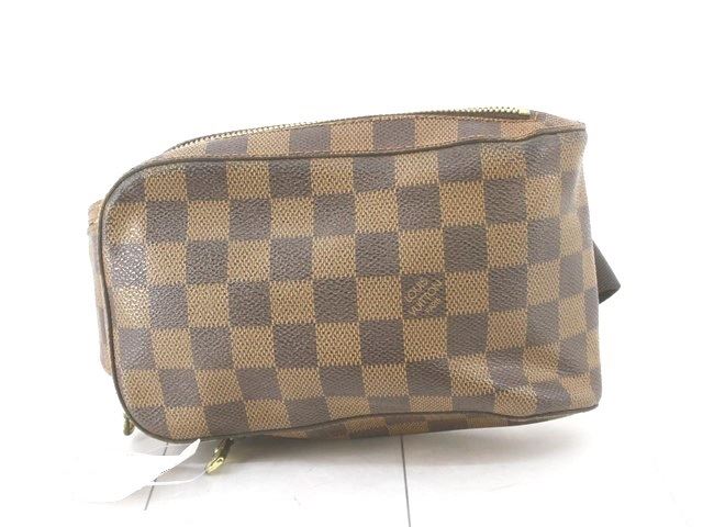One Louis Vuitton Damier Ebene Canvas Geronimos Waist Bag. Item is sold AS-IS. All available information is listed in the description and shown in the photo. Brown Damier Ebene coated canvas Louis Vuitton Geronimos waist bag with gold-tone hardware, single adjustable waist strap with buckle closure, single pocket at exterior with snap closure, red canvas lining and zip around closure. .