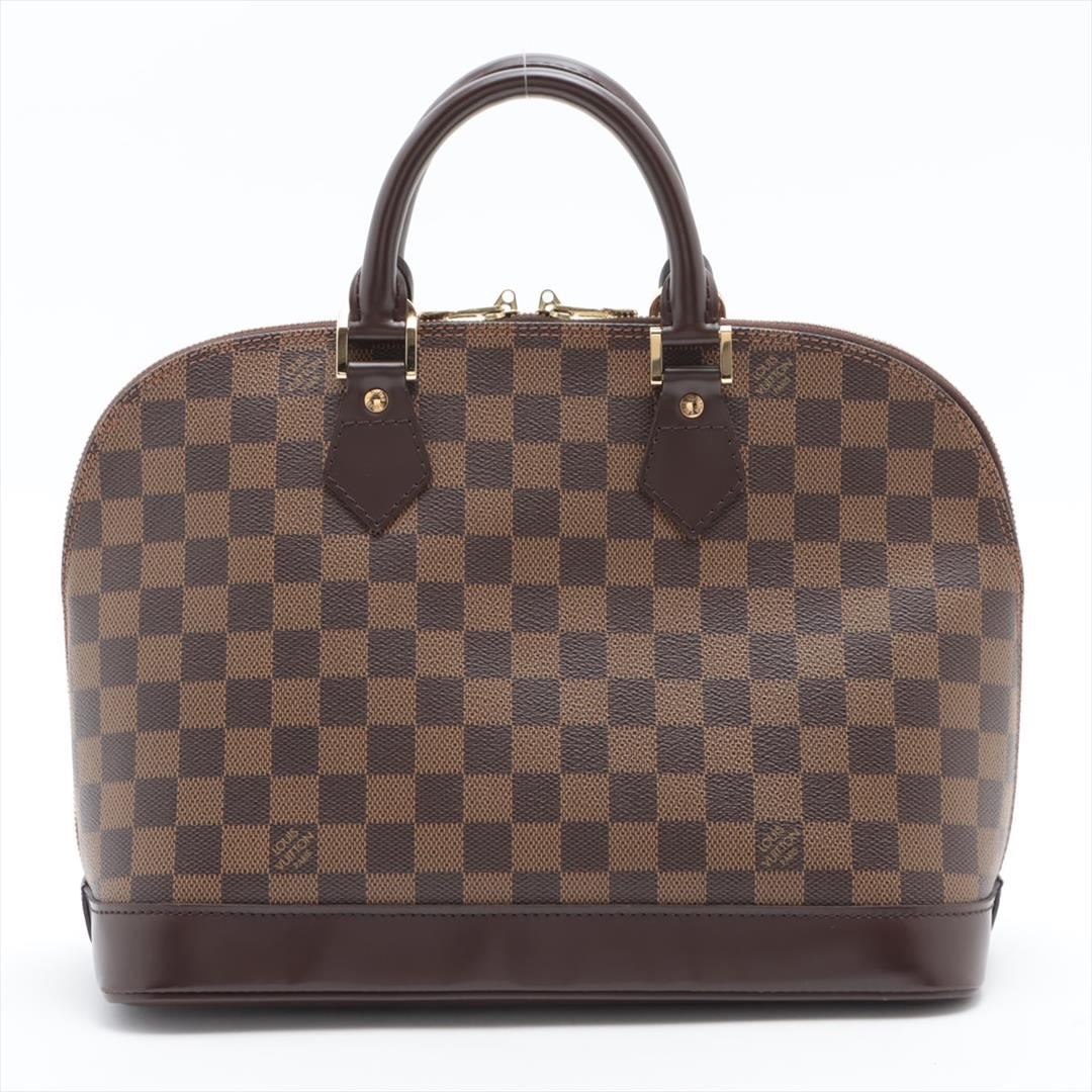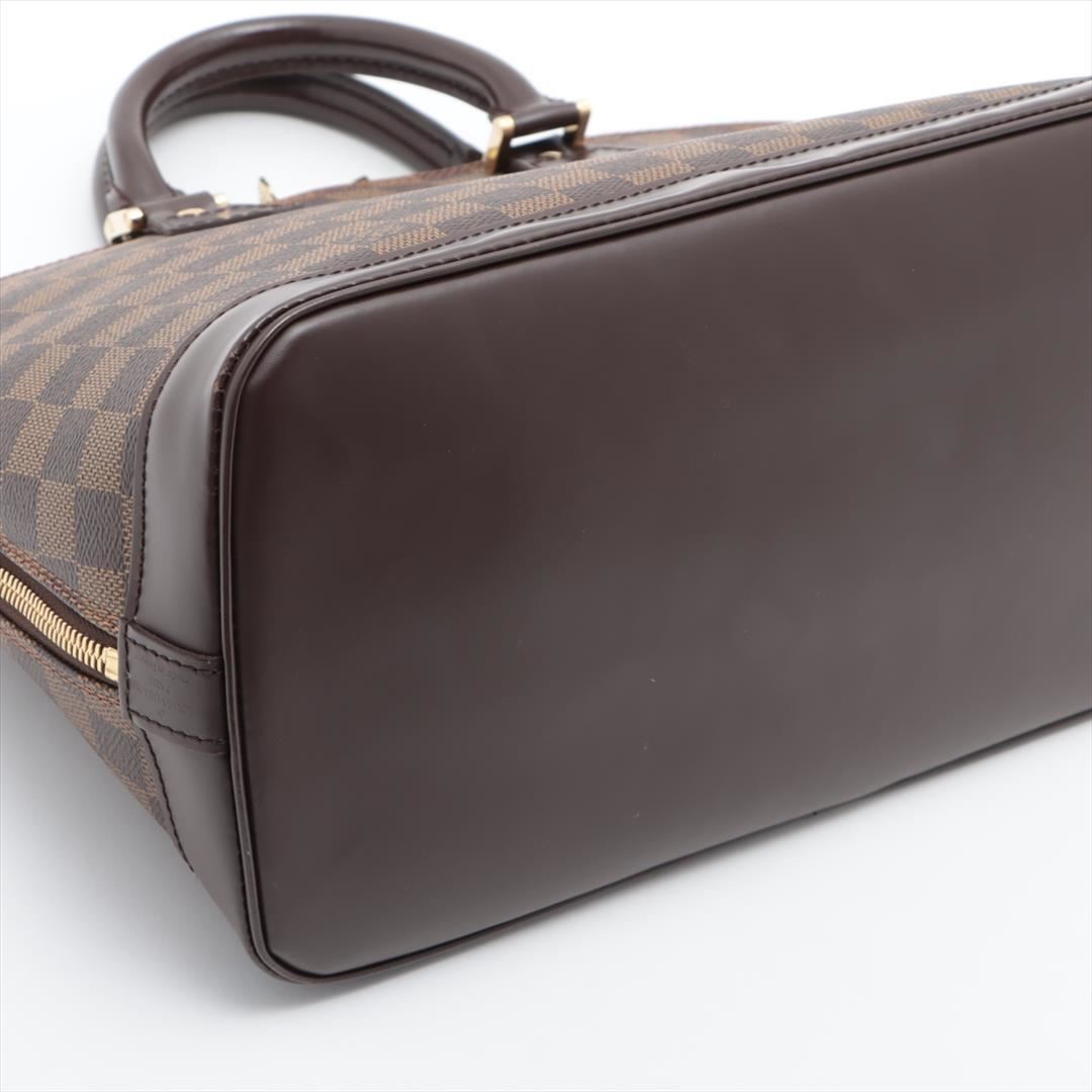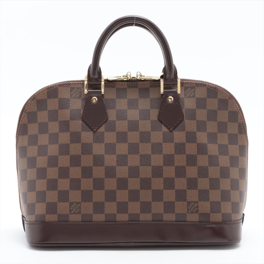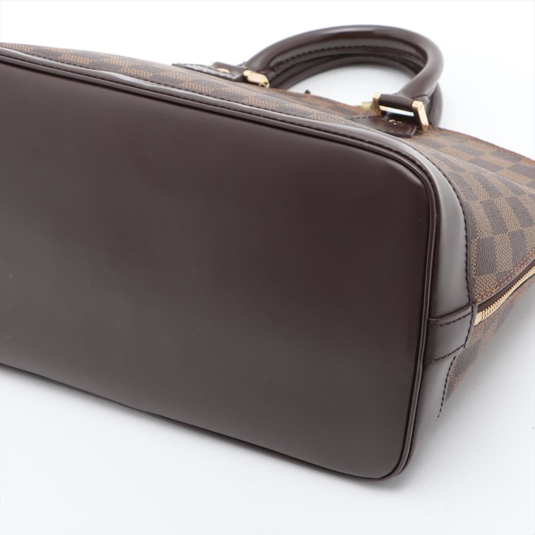Brown Damier Ebene coated canvas Louis Vuitton Alma PM with gold-tone hardware, dark brown leather trim, dual rolled top handles, terracotta canvas lining, single slit pocket at interior wall and two-way zip closures at top. 12.8"x9.5"x6"/32cmx24cmx15.