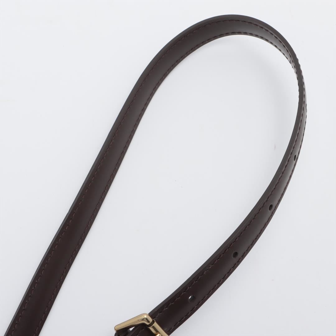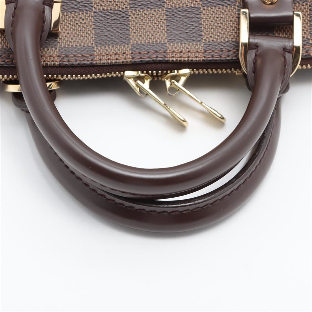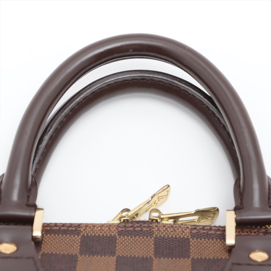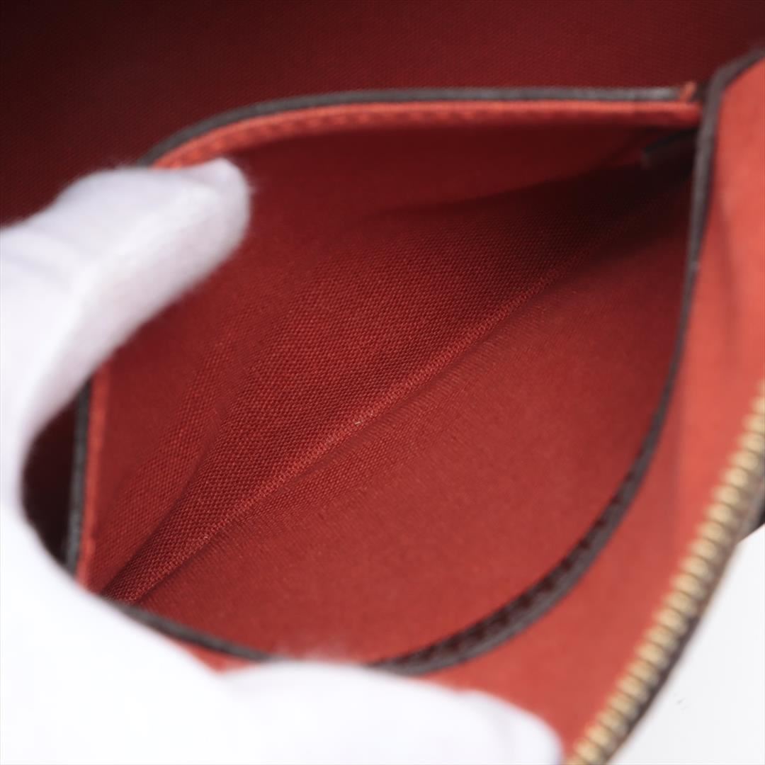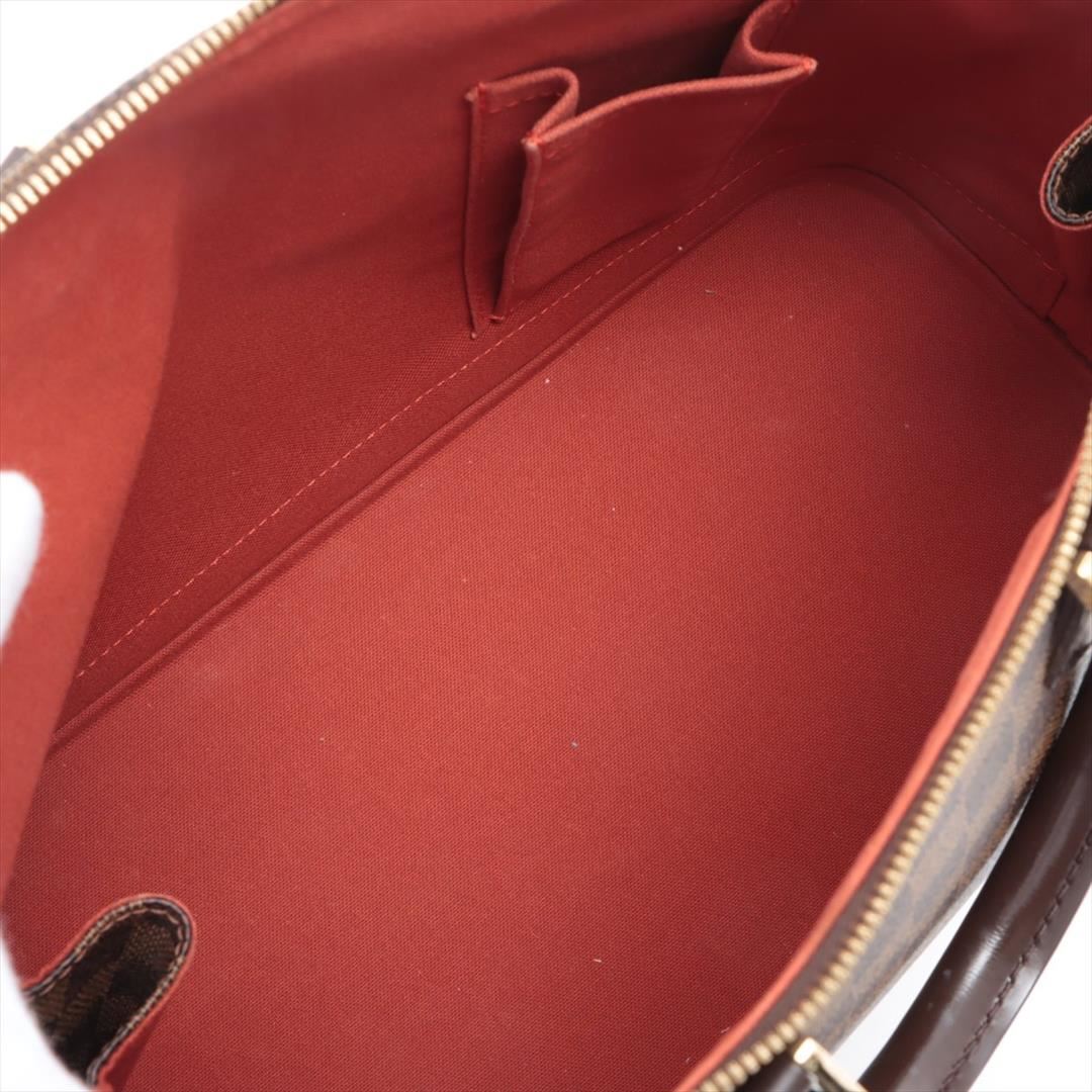 Brown Damier Ebene coated canvas Louis Vuitton Alma PM with gold-tone hardware, dark brown leather trim, dual rolled top handles, terracotta canvas lining, single slit pocket at interior wall and two-way zip closures at top. 12.8"x9.5"x6"/32cmx24cmx15.