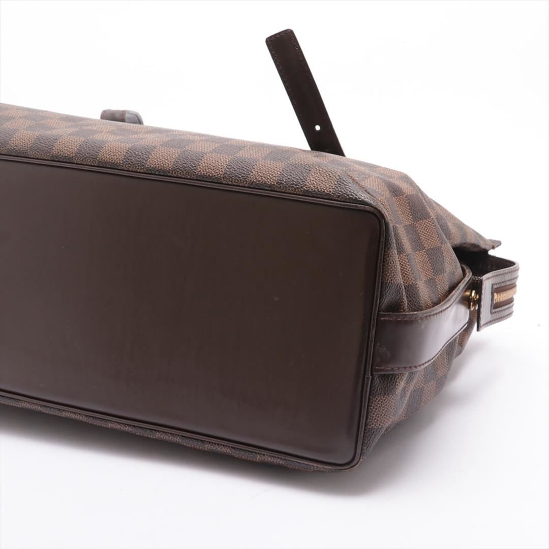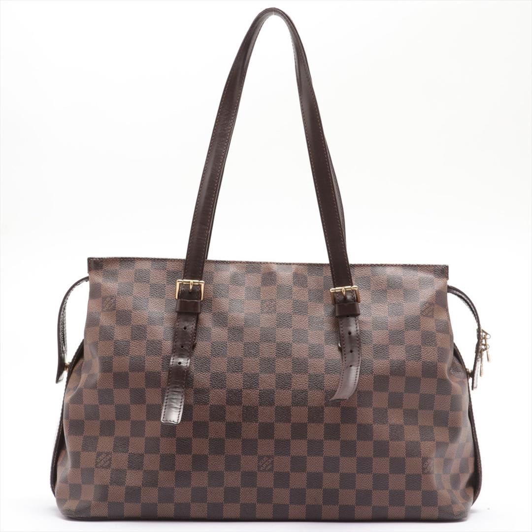 Brown and tobacco Damier Ebene coated canvas Louis Vuitton Chelsea tote bag with brass hardware, brown leather accents, dual flat shoulder straps, red canvas interior, single zip pocket at interior wall and zip closure at top. 16.5"x5.5"x10.5"xBag Drop:12.25"/41.9cmx13.9cmx26.6cmxBag Drop:31.1cm
