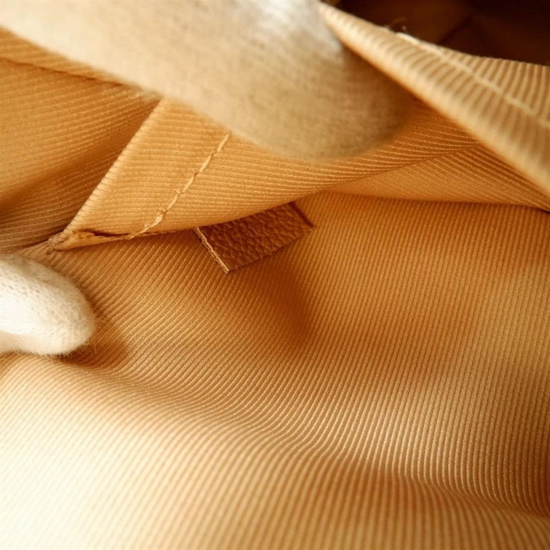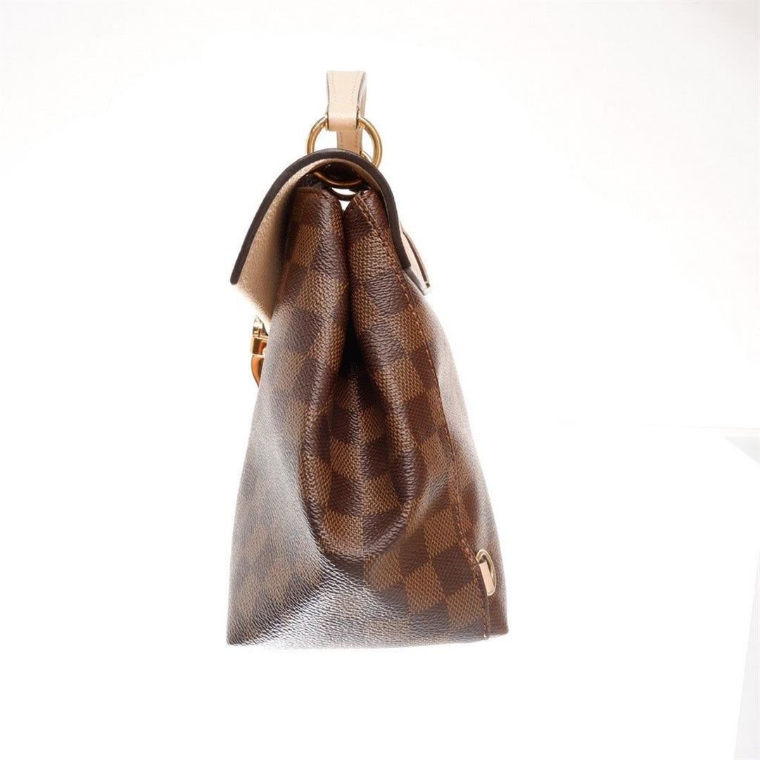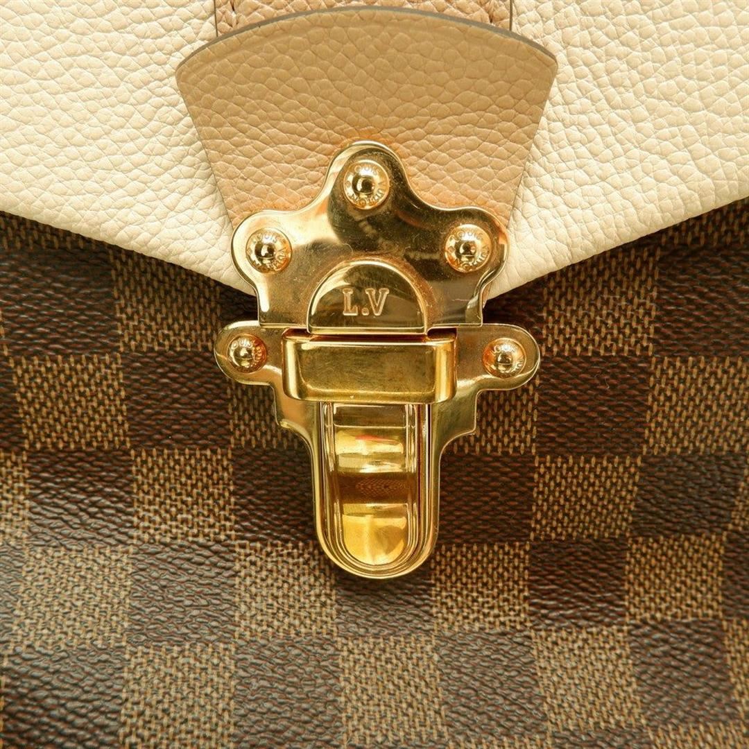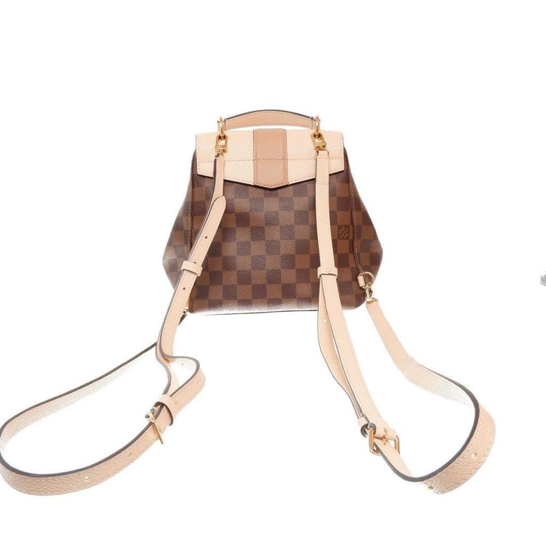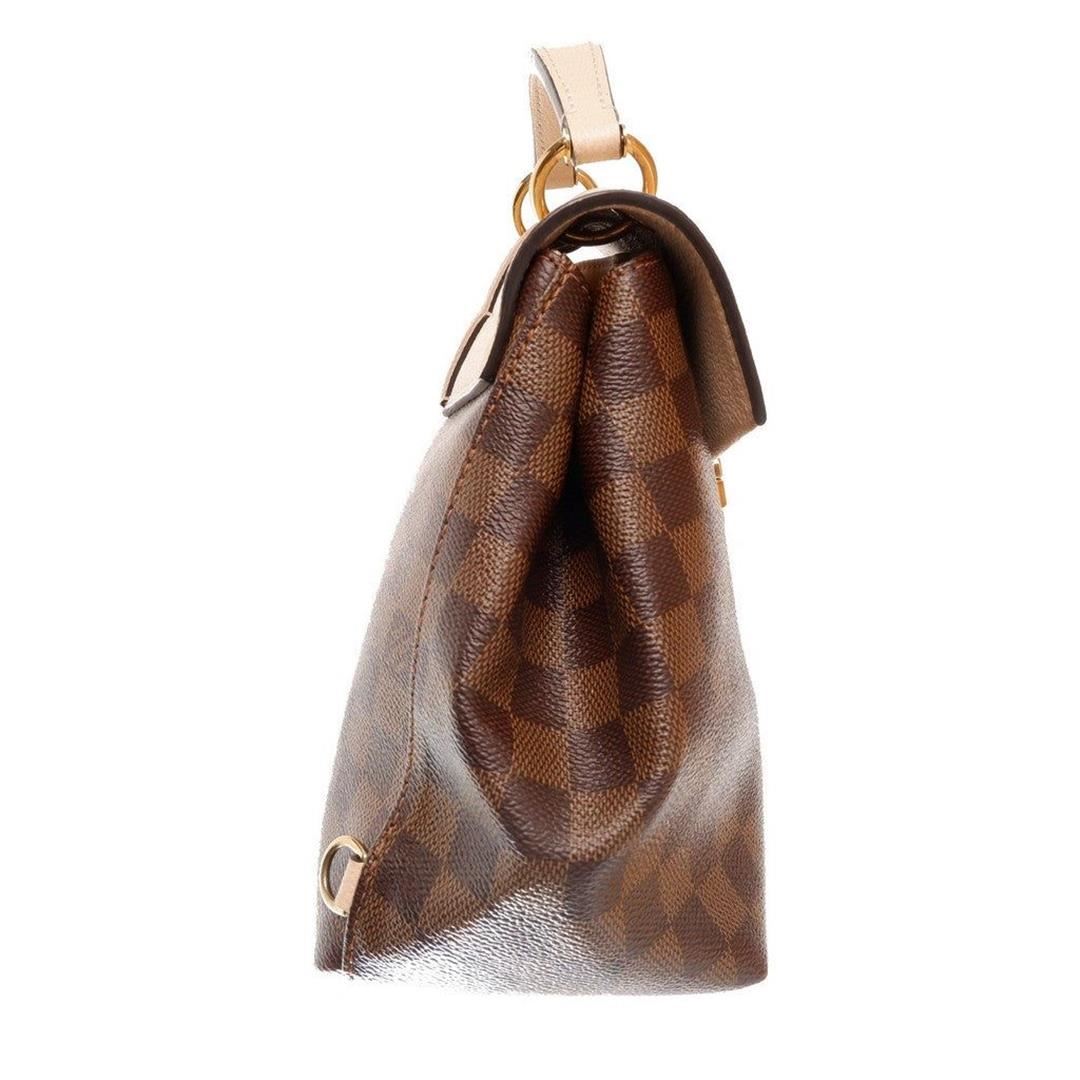 Brown Damier Ebene coated canvas Louis Vuitton Clapton backpack strap with chic pale Creme colored leather trim and flap, detachable backpack straps and top handle, flap top with gold-tone push lock closure, fine textile interior lining with one flat pocket, gold-tone hardware.
