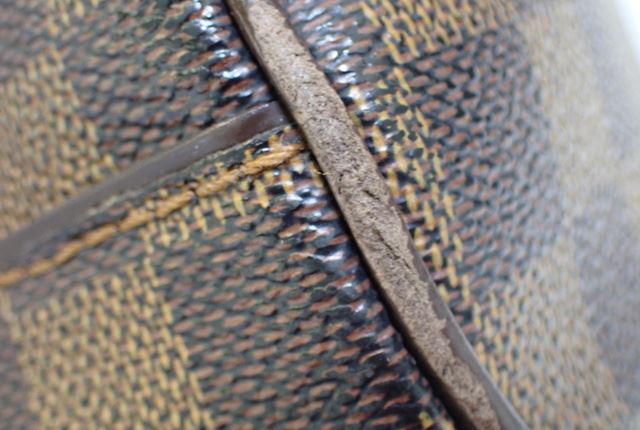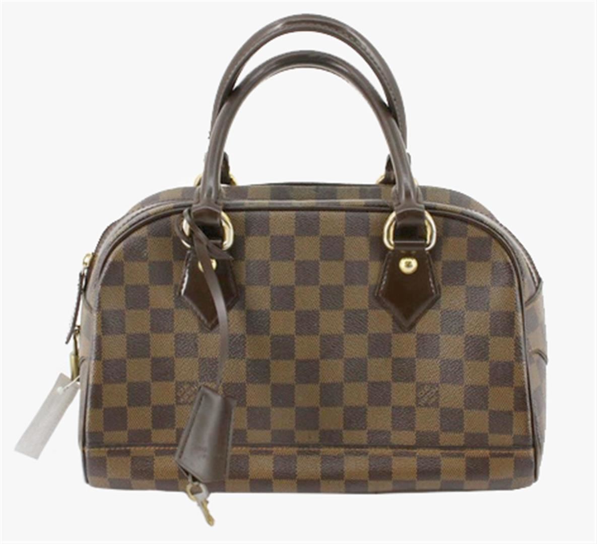 Brown Damier Ebene coated canvas Louis Vuitton Duomo hobo bag with gold-tone hardware, smooth dark brown leather trim, double rolled leather handles, red Alcantara canvas lining, one flat pocket and one cell phone pocket at interior walls and single zip c