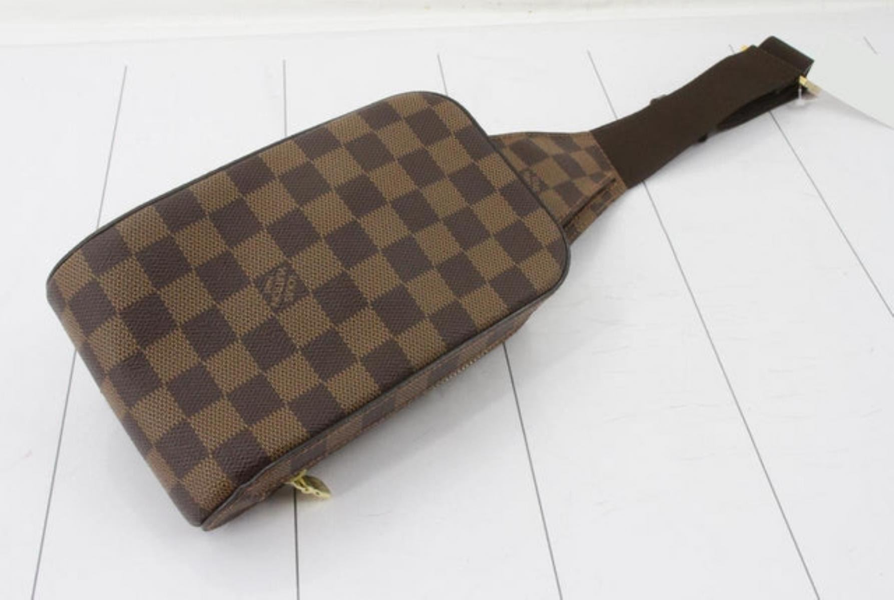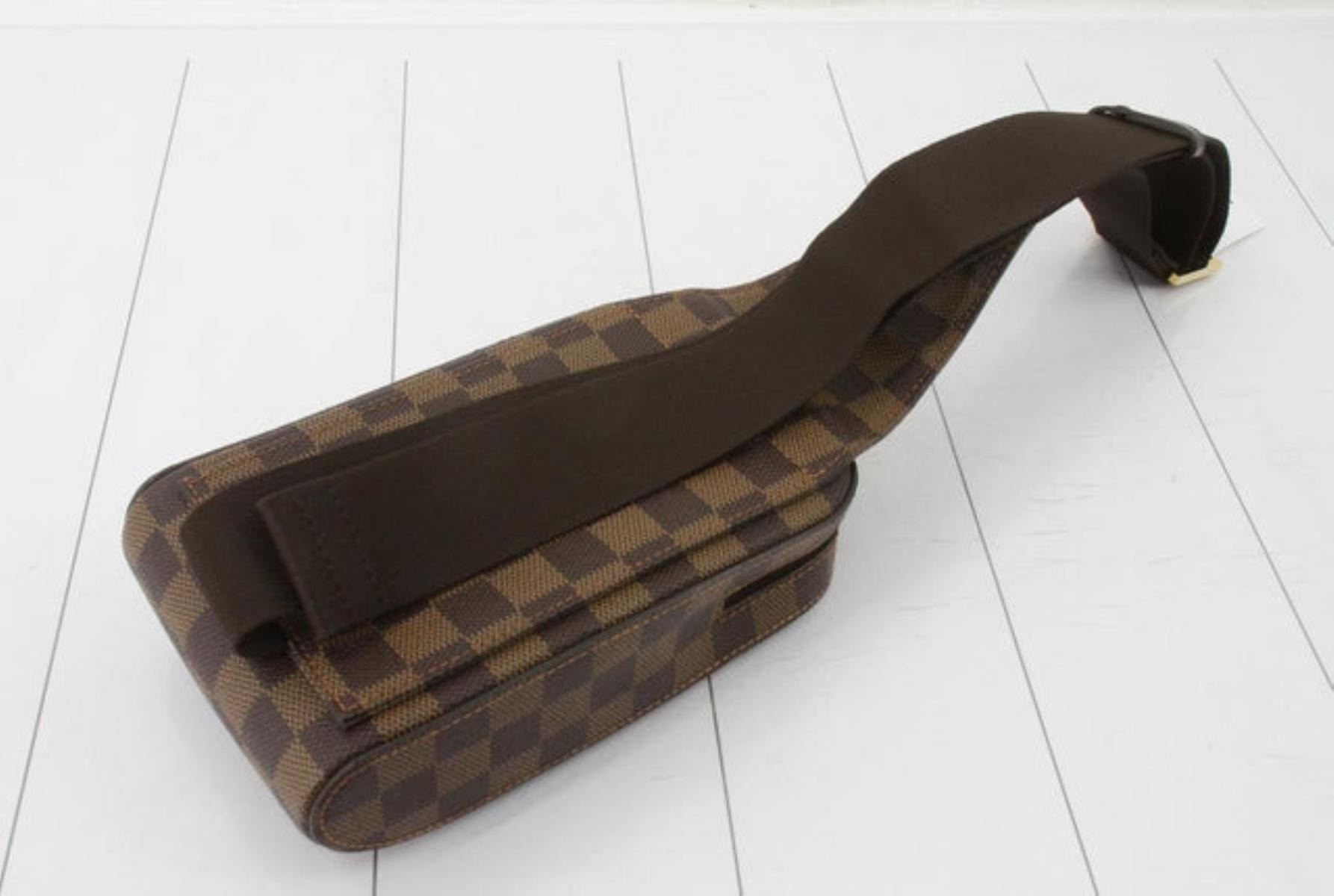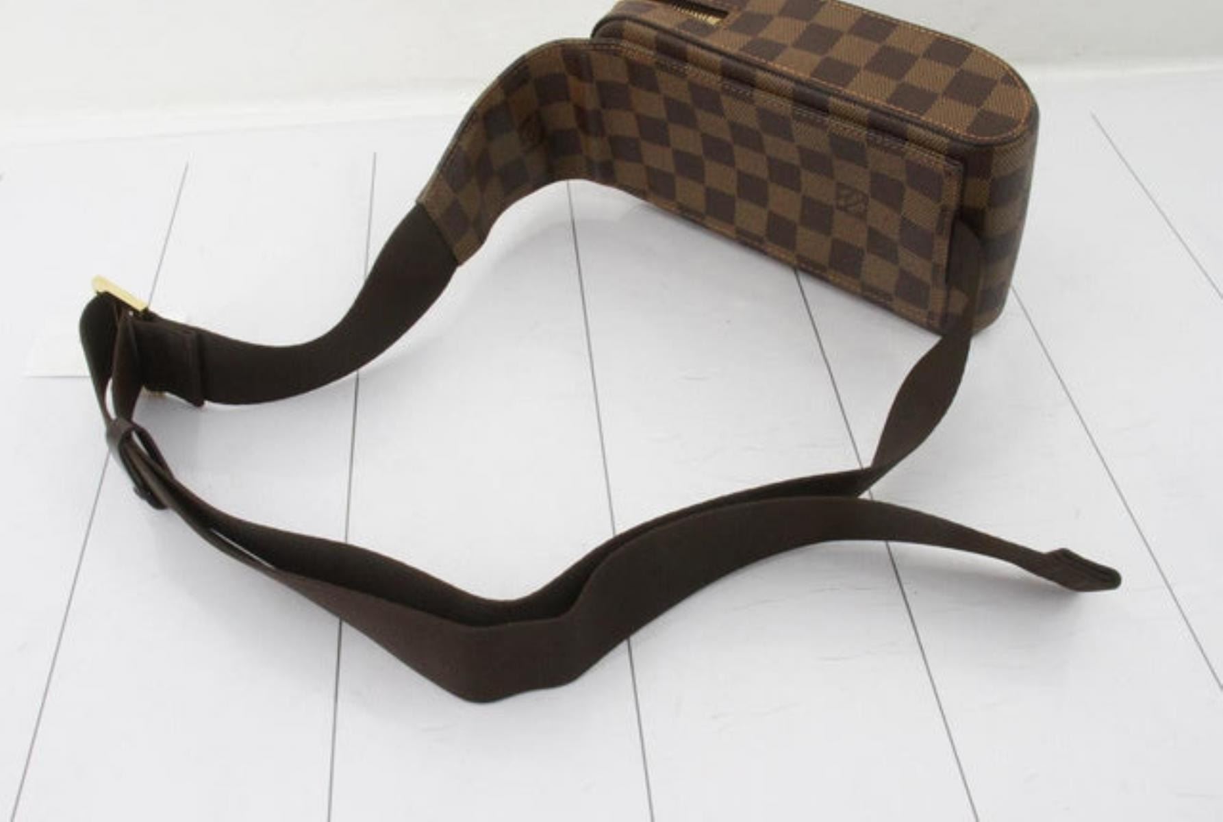 Brown and tobacco Damier Ebene coated canvas Louis Vuitton Geronimos waist bag with gold-tone hardware, single adjustable waist strap with buckle closure, single pocket at exterior with snap closure, red canvas lining and zip around closure. 6 7.5"