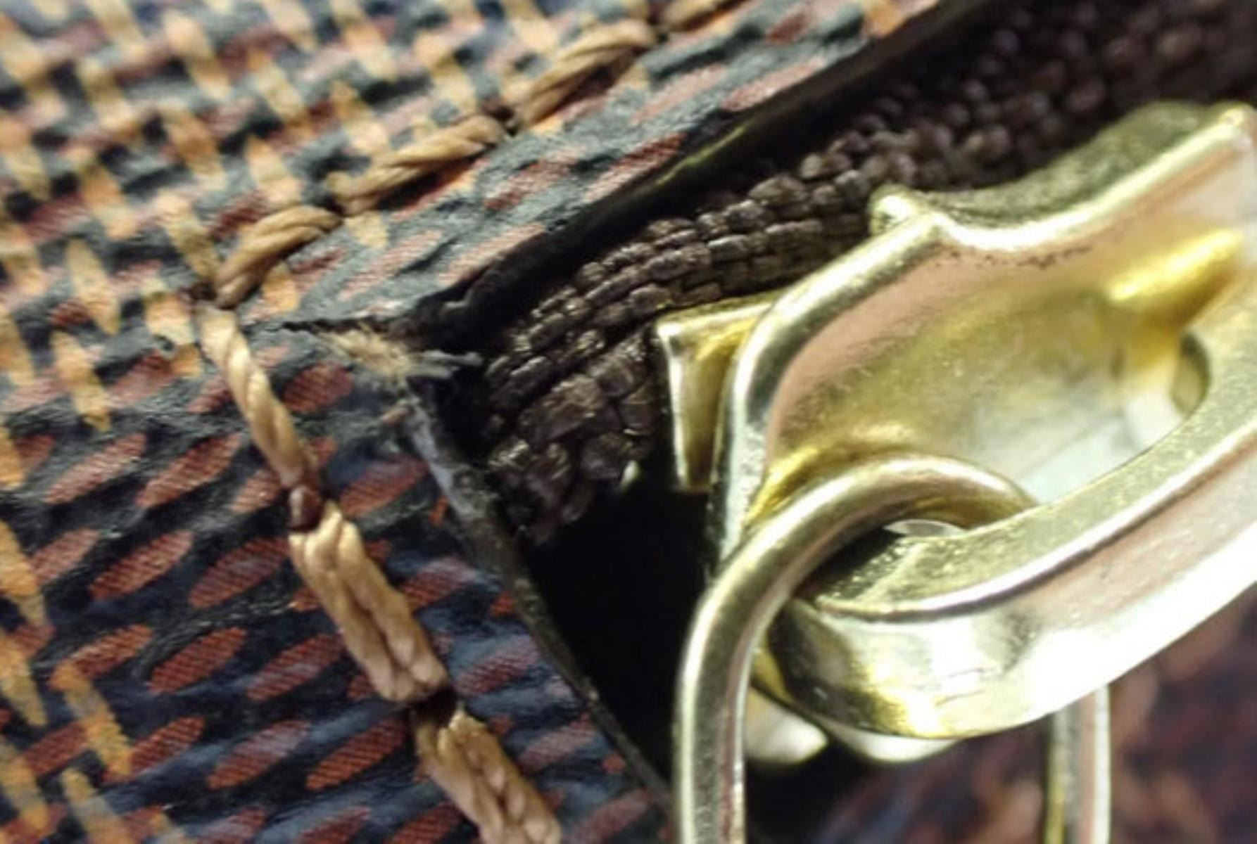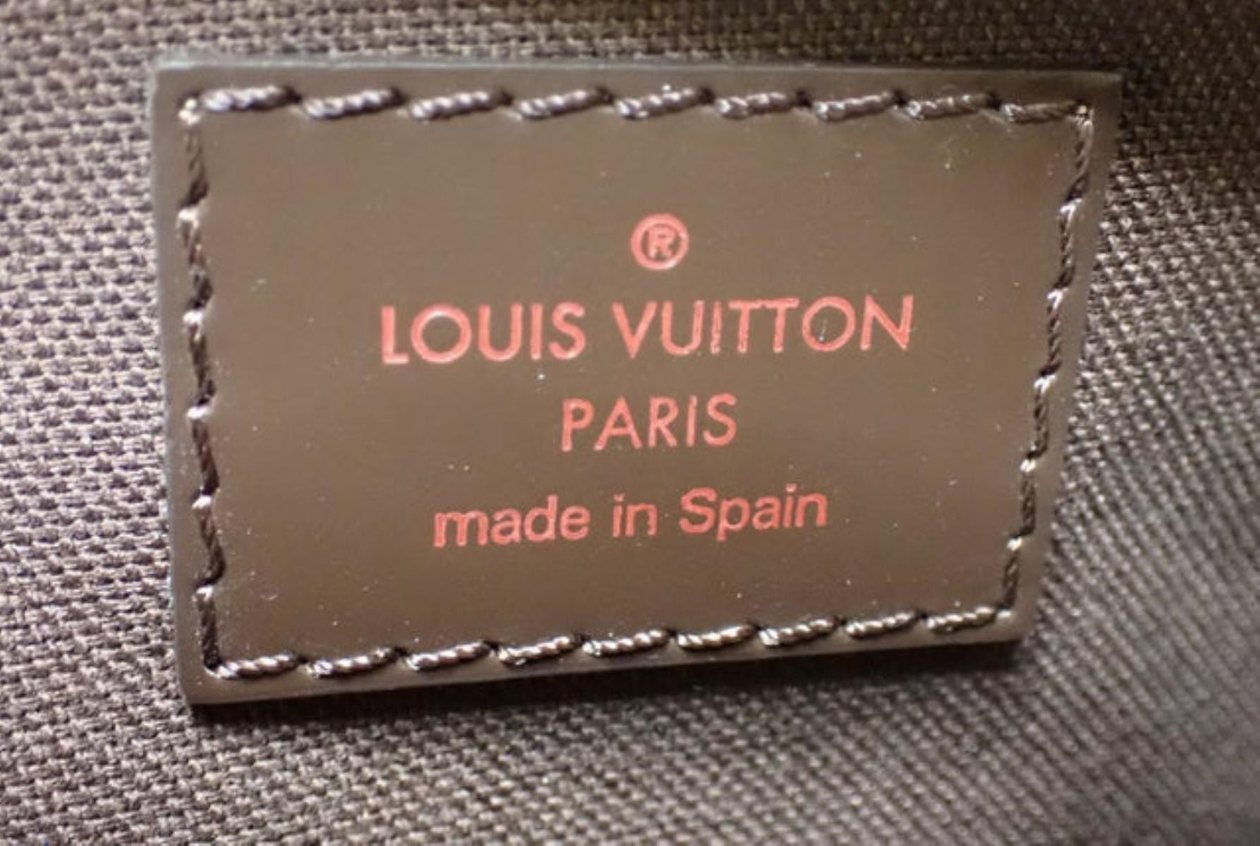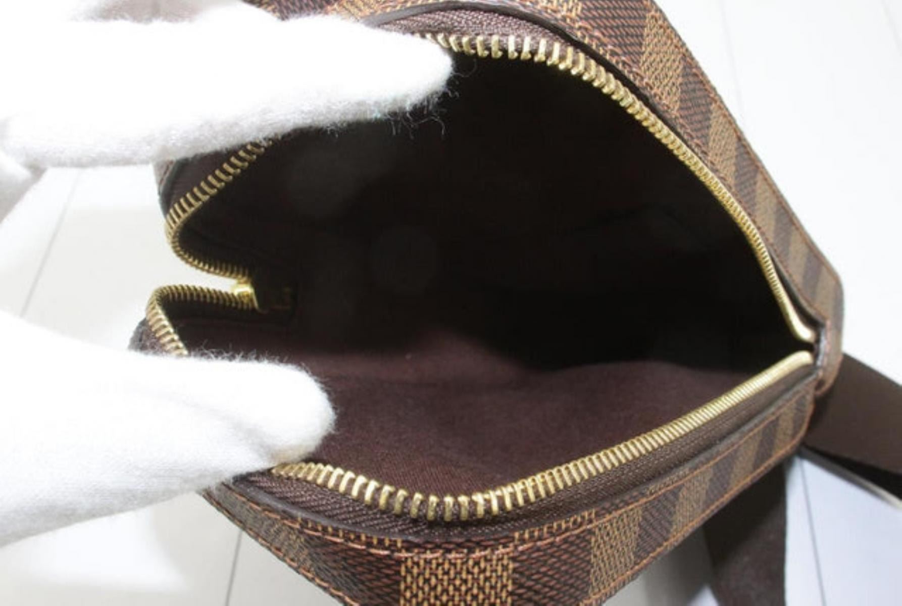 Brown and tobacco Damier Ebene coated canvas Louis Vuitton Geronimos waist bag with gold-tone hardware, single adjustable waist strap with buckle closure, single pocket at exterior with snap closure, red canvas lining and zip around closure. 6 7.5"