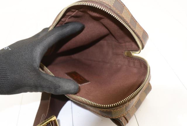 One Louis Vuitton Damier Ebene Canvas Leather Geronimos Waist Bag. Item is sold AS-IS. All available information is listed in the description and shown in the photo. Brown and tobacco Damier Ebene coated canvas Louis Vuitton Geronimos waist bag with gold-tone hardware, single adjustable waist strap with buckle closure, single pocket at exterior with snap closure, dark brown canvas lining and zip around closure. 7.5"x1.75"x5.75"xBag Drop:44"/19cmx4.4cmx14.6cmx111.7cm