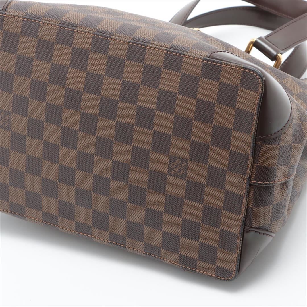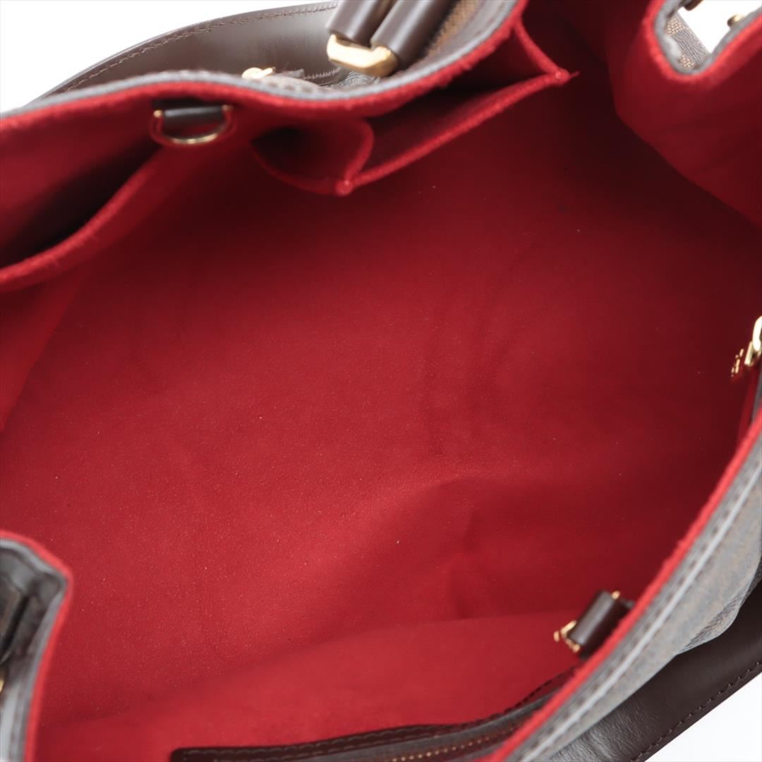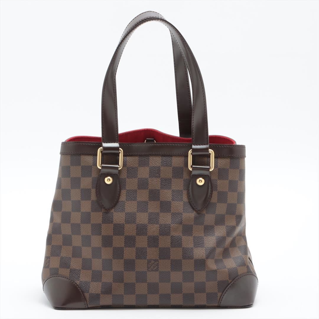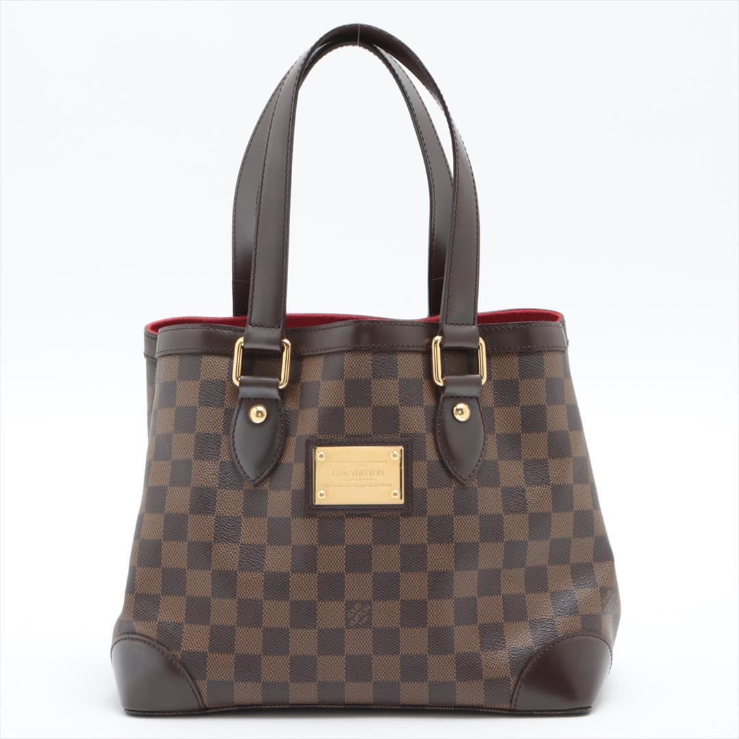 Brown Damier Ebene coated canvas Louis Vuitton Hampstead PM with gold-tone hardware, dark brown leather trim, dual flat shoulder straps, logo placard at front face, red Alcantara lining, three pockets at interior walls; one with zip closure and clasp clos