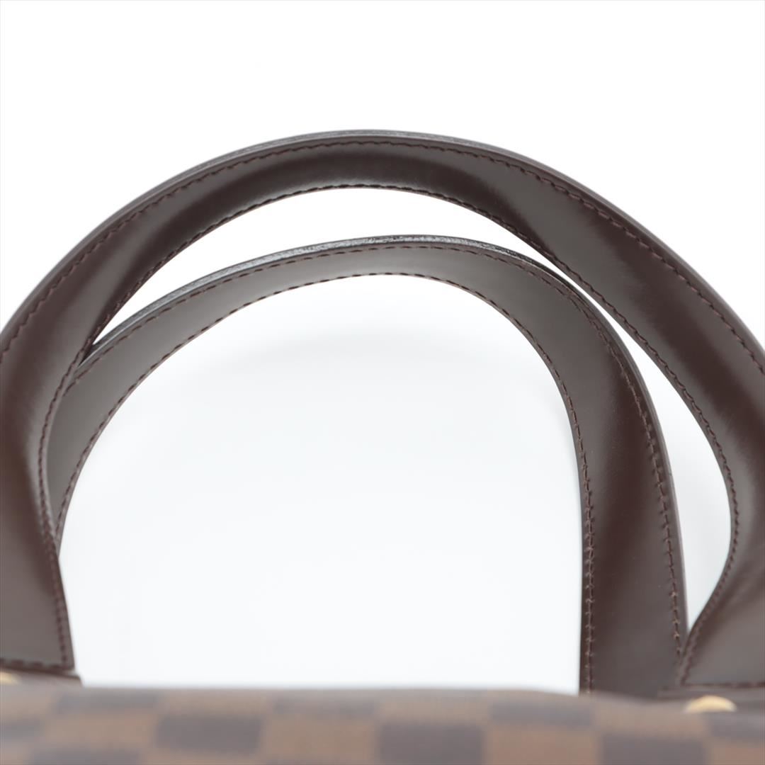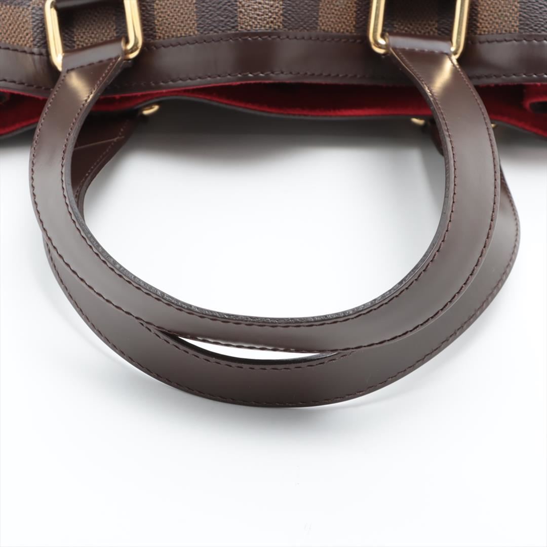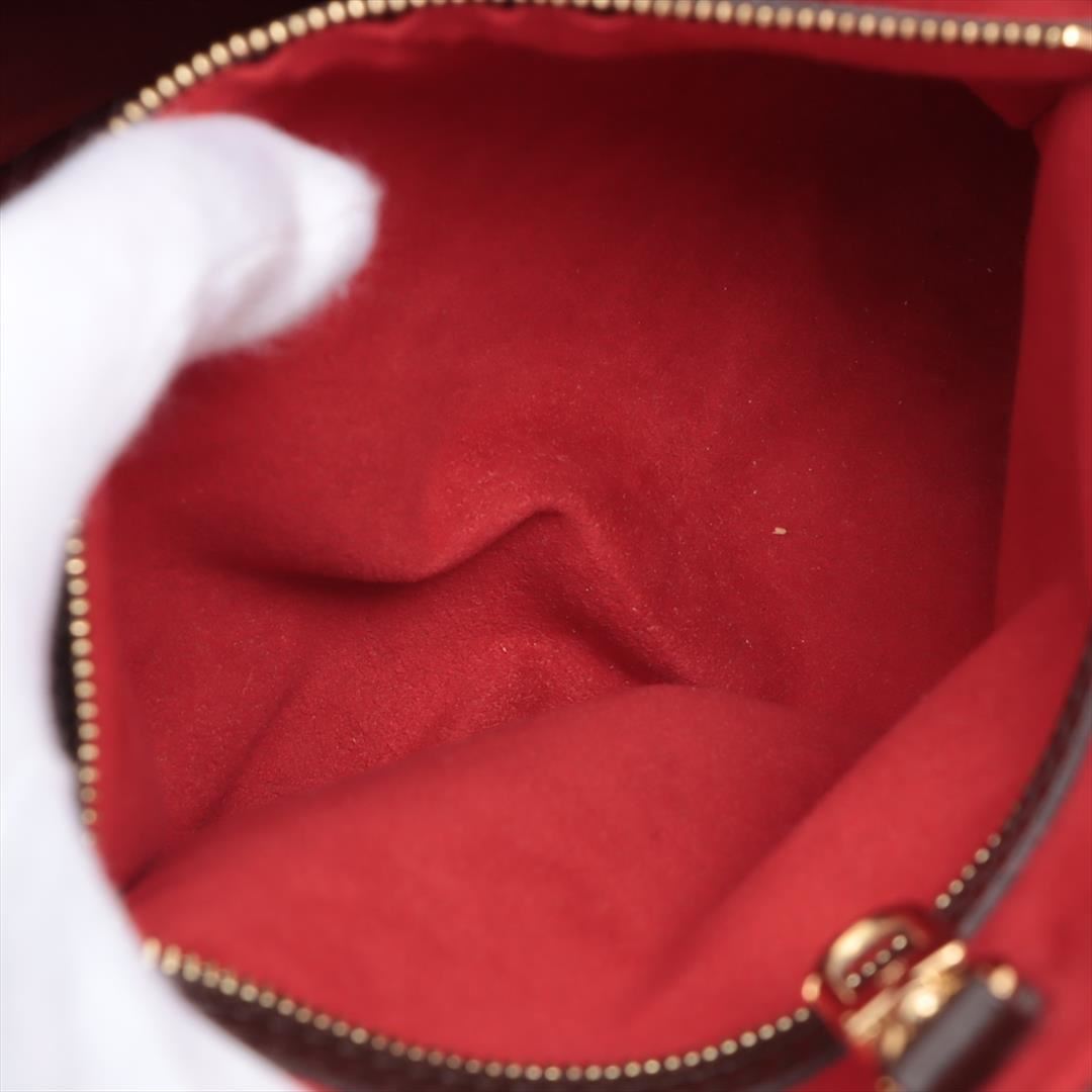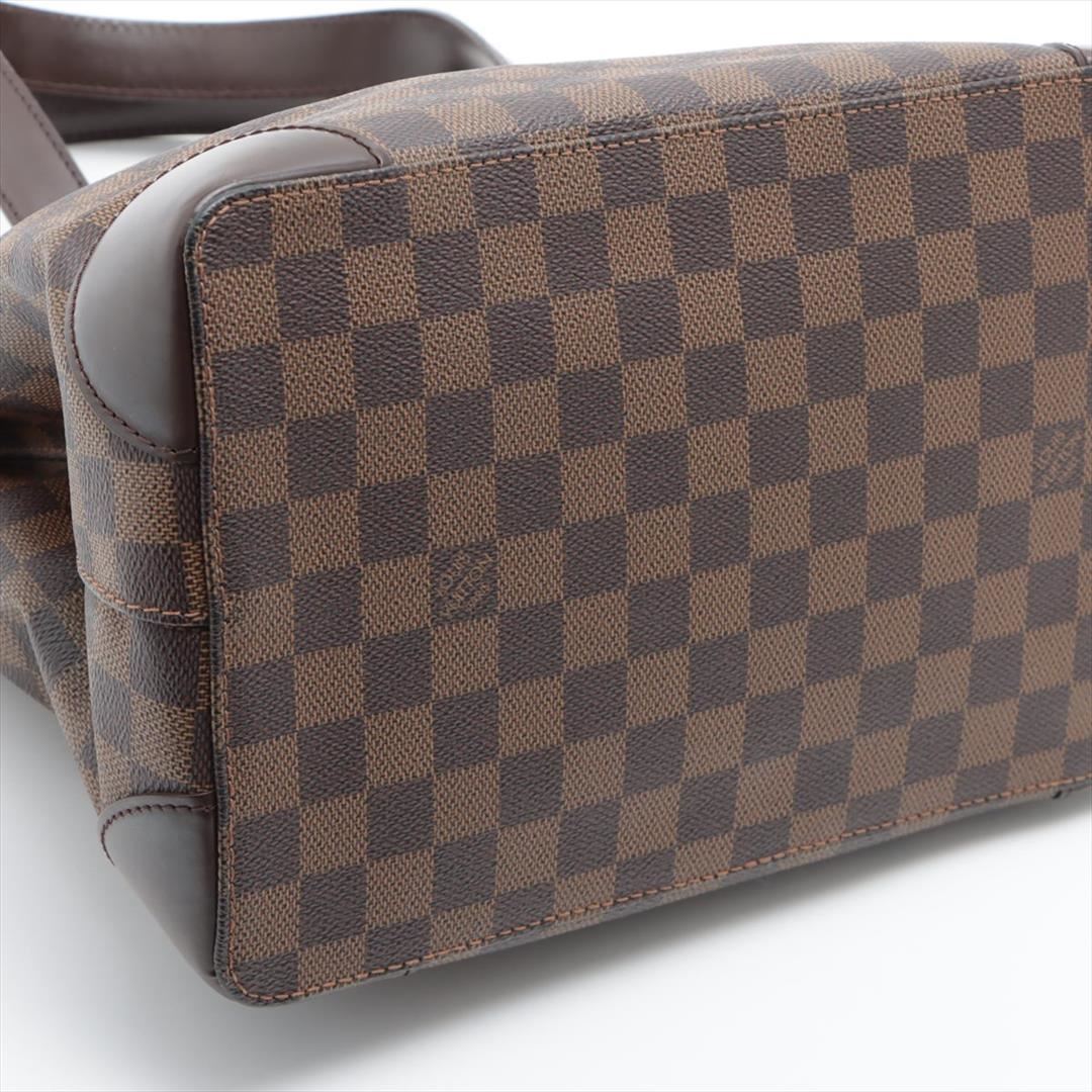 Brown Damier Ebene coated canvas Louis Vuitton Hampstead PM with gold-tone hardware, dark brown leather trim, dual flat shoulder straps, logo placard at front face, red Alcantara lining, three pockets at interior walls; one with zip closure and clasp clos