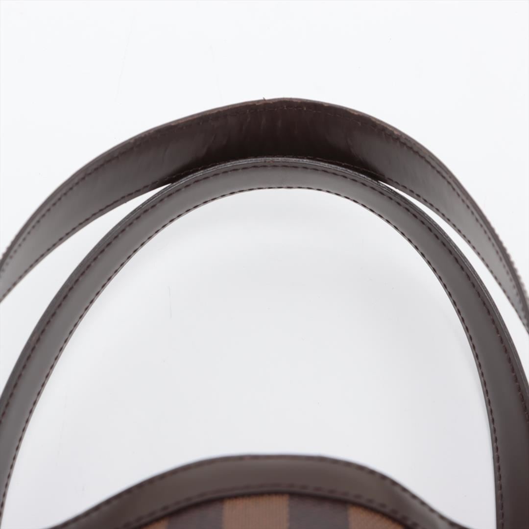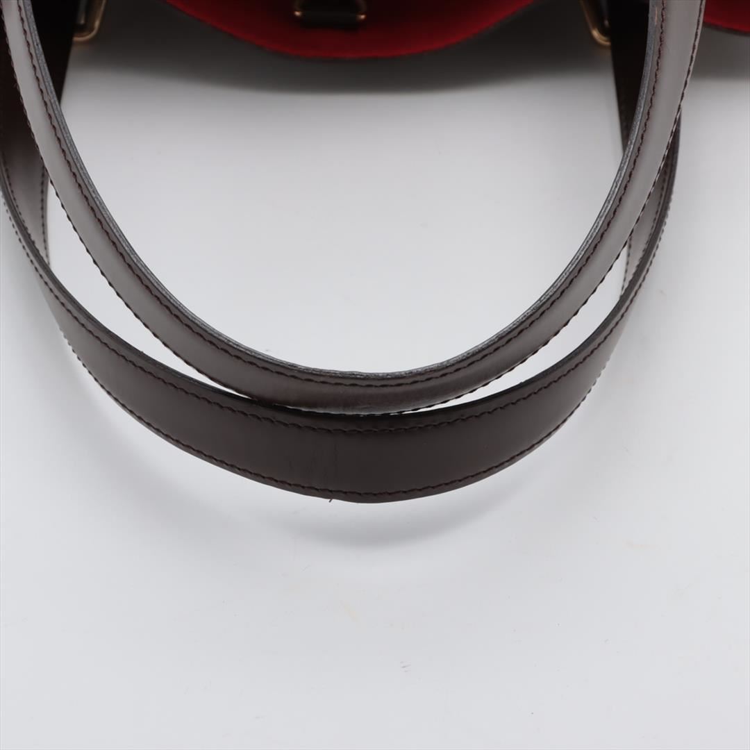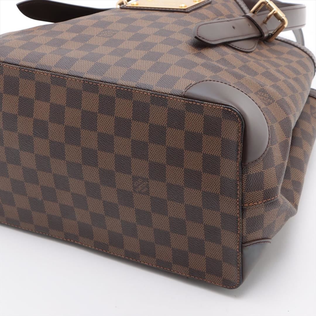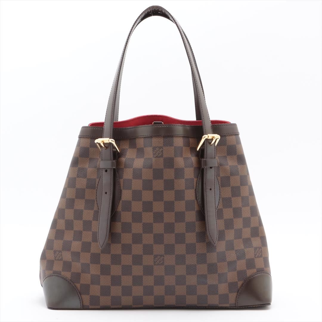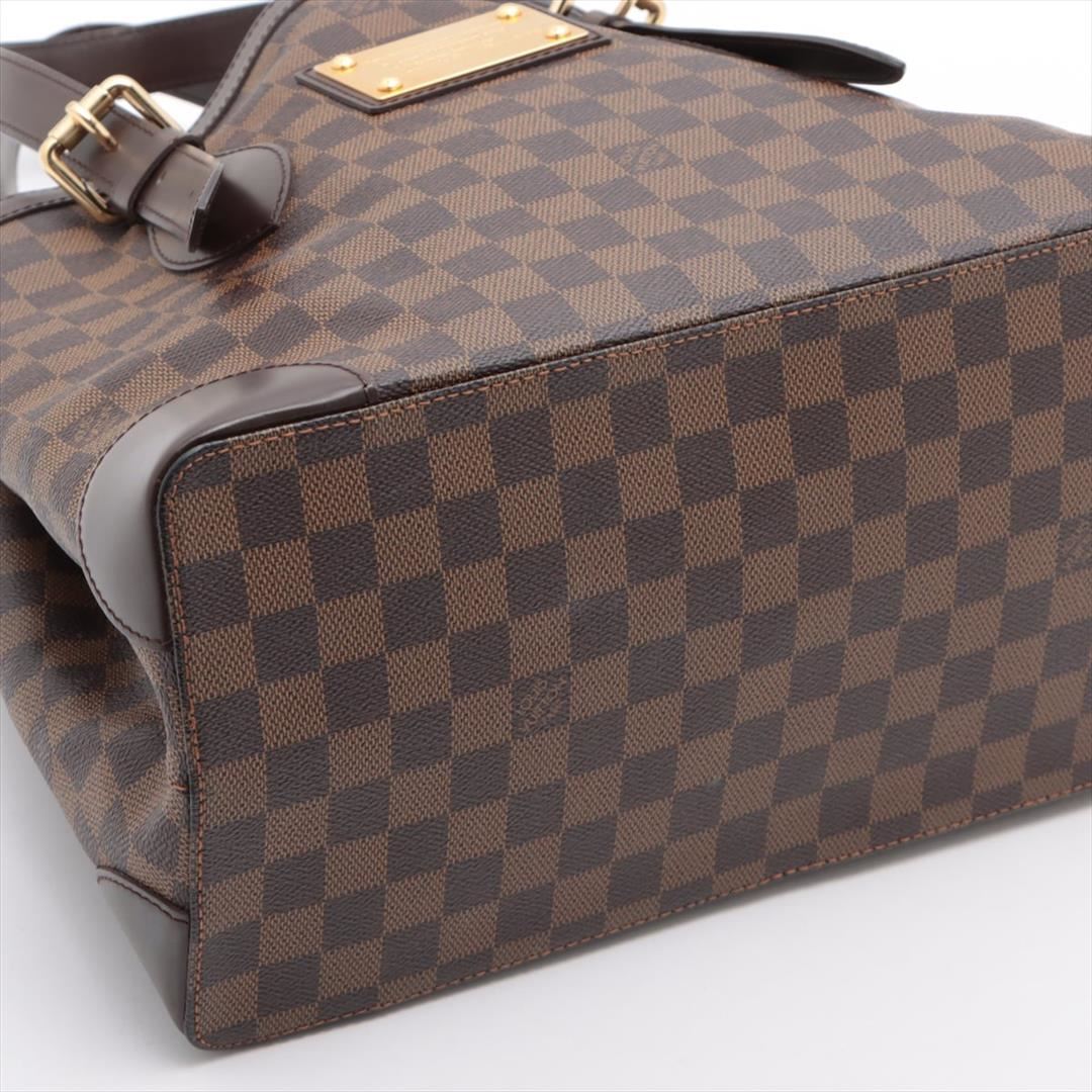 Brown Damier Ebene coated canvas Louis Vuitton Hampstead PM with gold-tone hardware, dark brown leather trim, dual flat shoulder straps, logo placard at front face, red Alcantara lining, three pockets at interior walls; one with zip closure and clasp clos