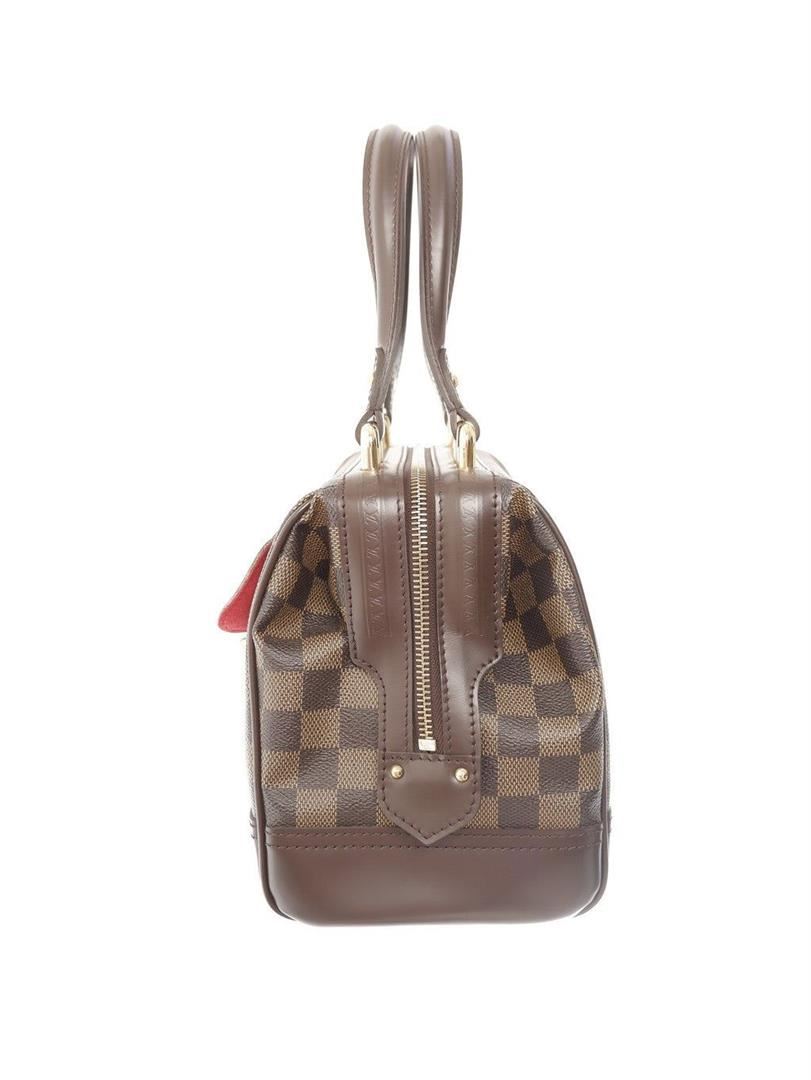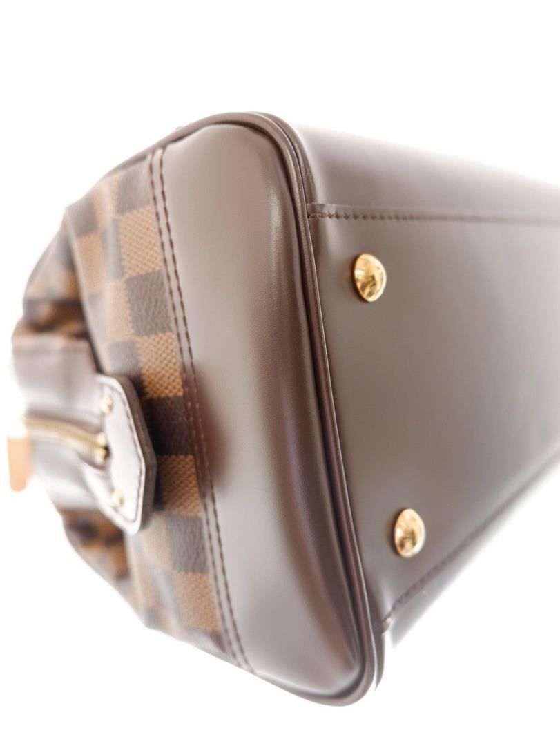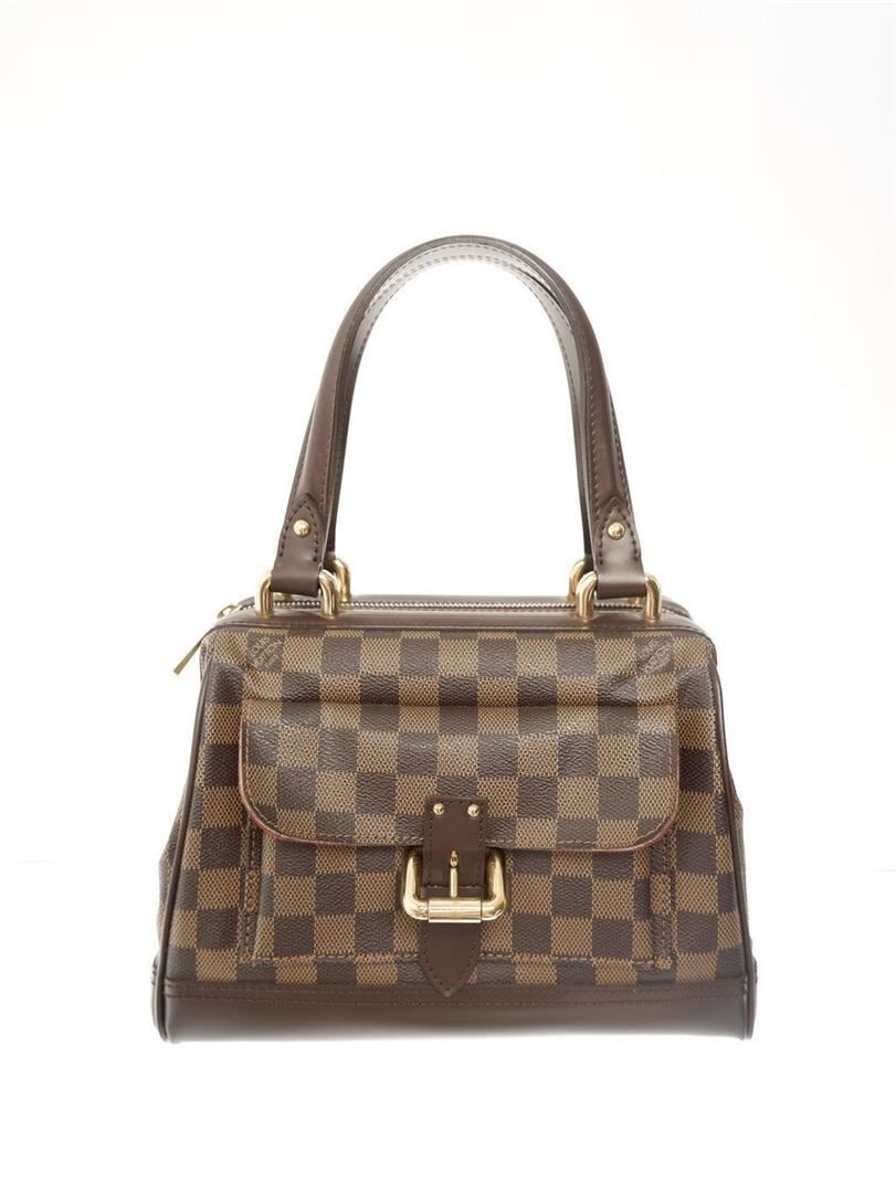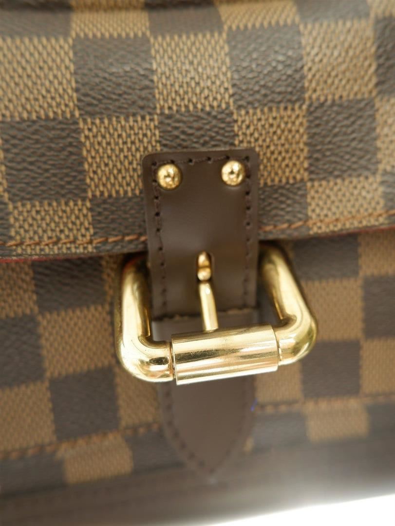Brown and tan Damier Ebene coated canvas Louis Vuitton Knightsbridge bag with brass hardware, Moka leather trim, dual flat handles, single exterior pocket featuring buckle closure at front flap, embossed logo trim throughout, protective feet at base, crim