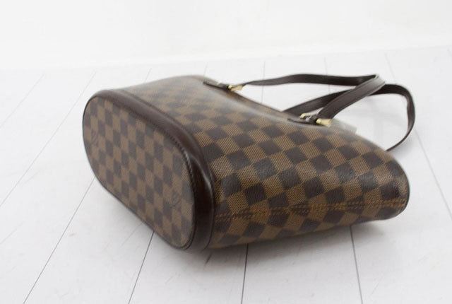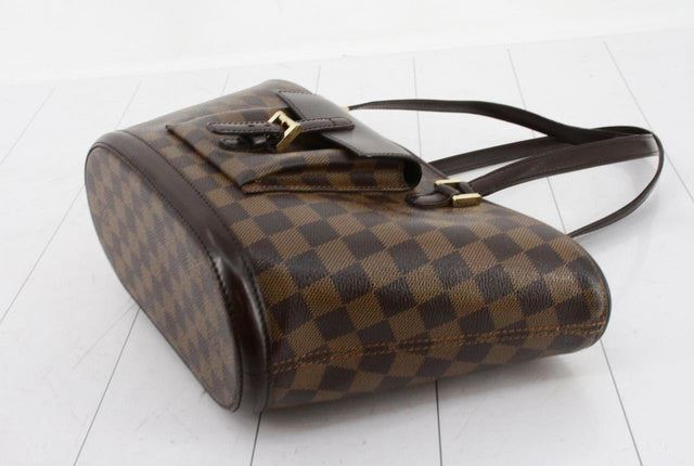 Brown and tobacco Damier Ebene coated canvas Louis Vuitton Manosque PM with gold-tone hardware, brown leather accents, dual flat shoulder straps, single exterior pocket with buckle closure, terracotta Alcantara lining, dual zip pockets at interior walls a
