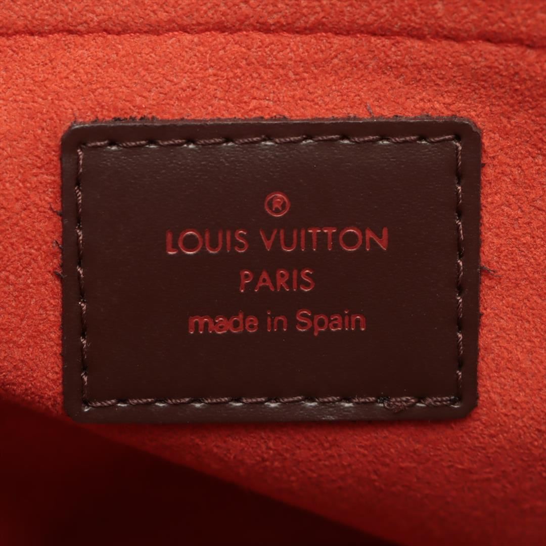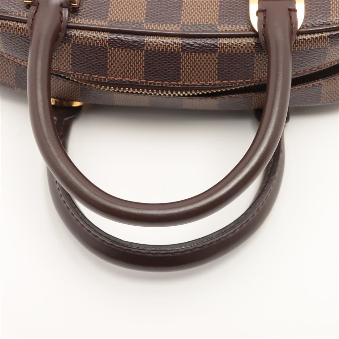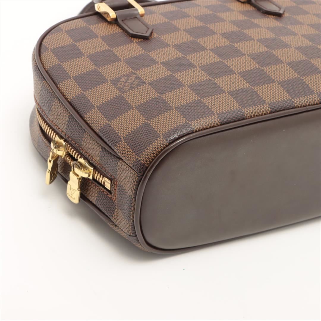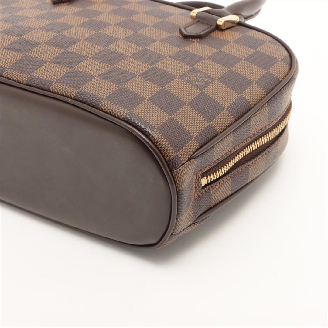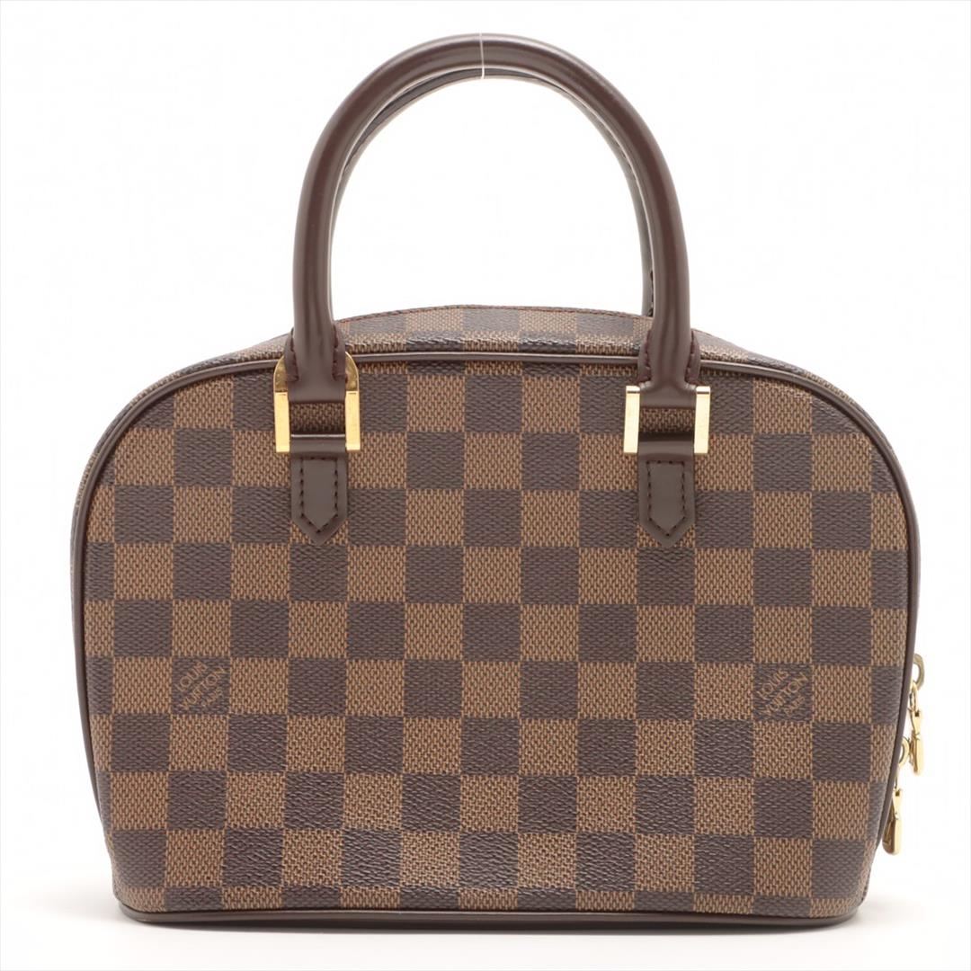 Brown Damier Ebene coated canvas Louis Vuitton Mini Sarria handbag with gold-tone hardware, dual rolled handles, orange suede lining, interior wall slip pocket and two-way top zip closure. 6.5"x8.5"x3.5"xBag Drop:3.25"/16.5cmx21.5cmx8.8cmxBag Drop:8.2c