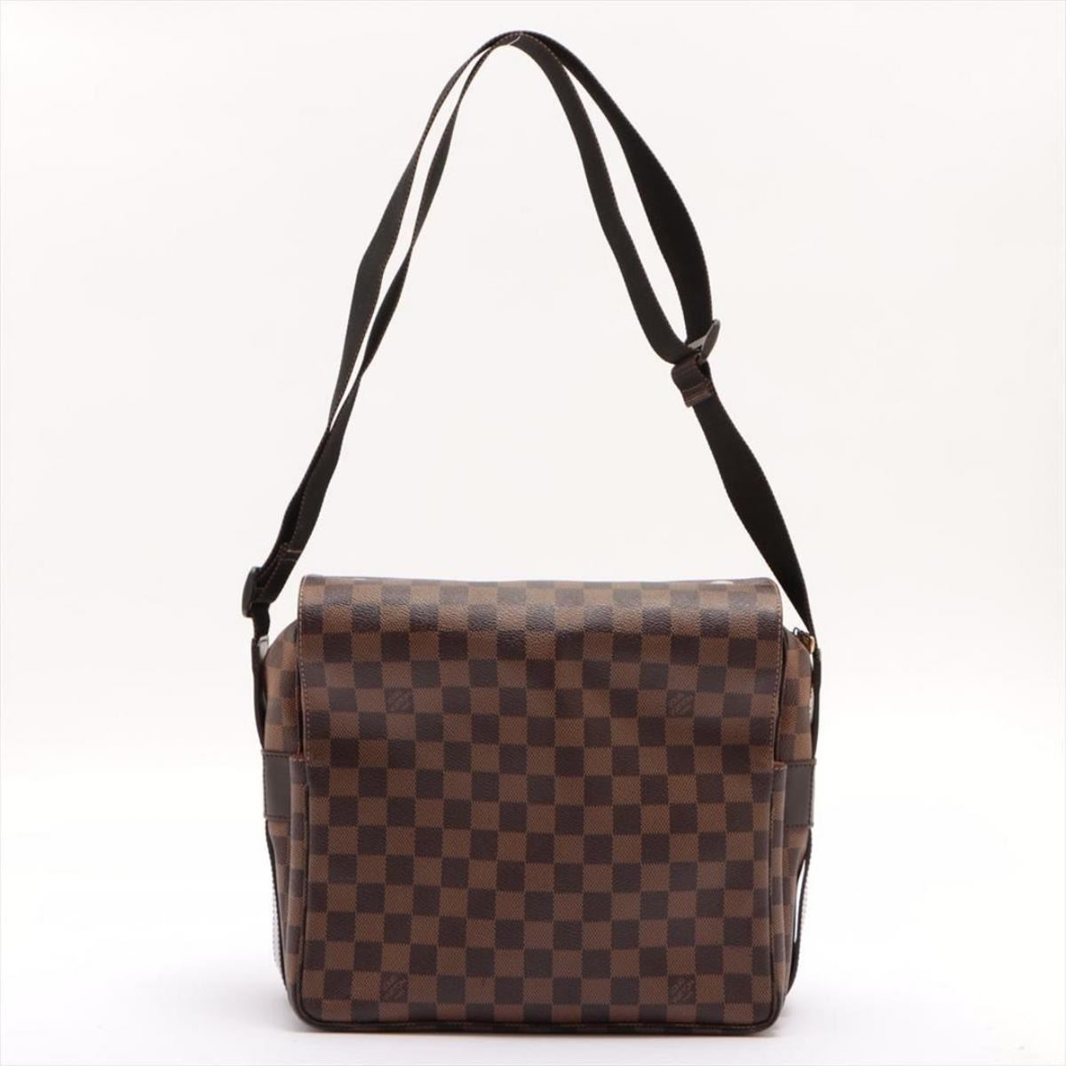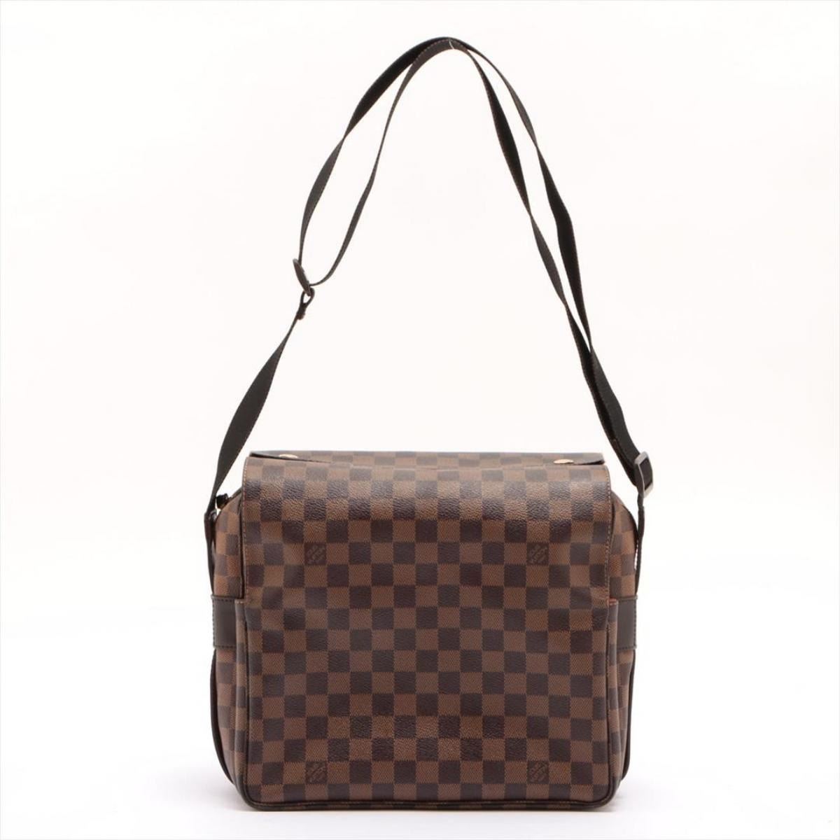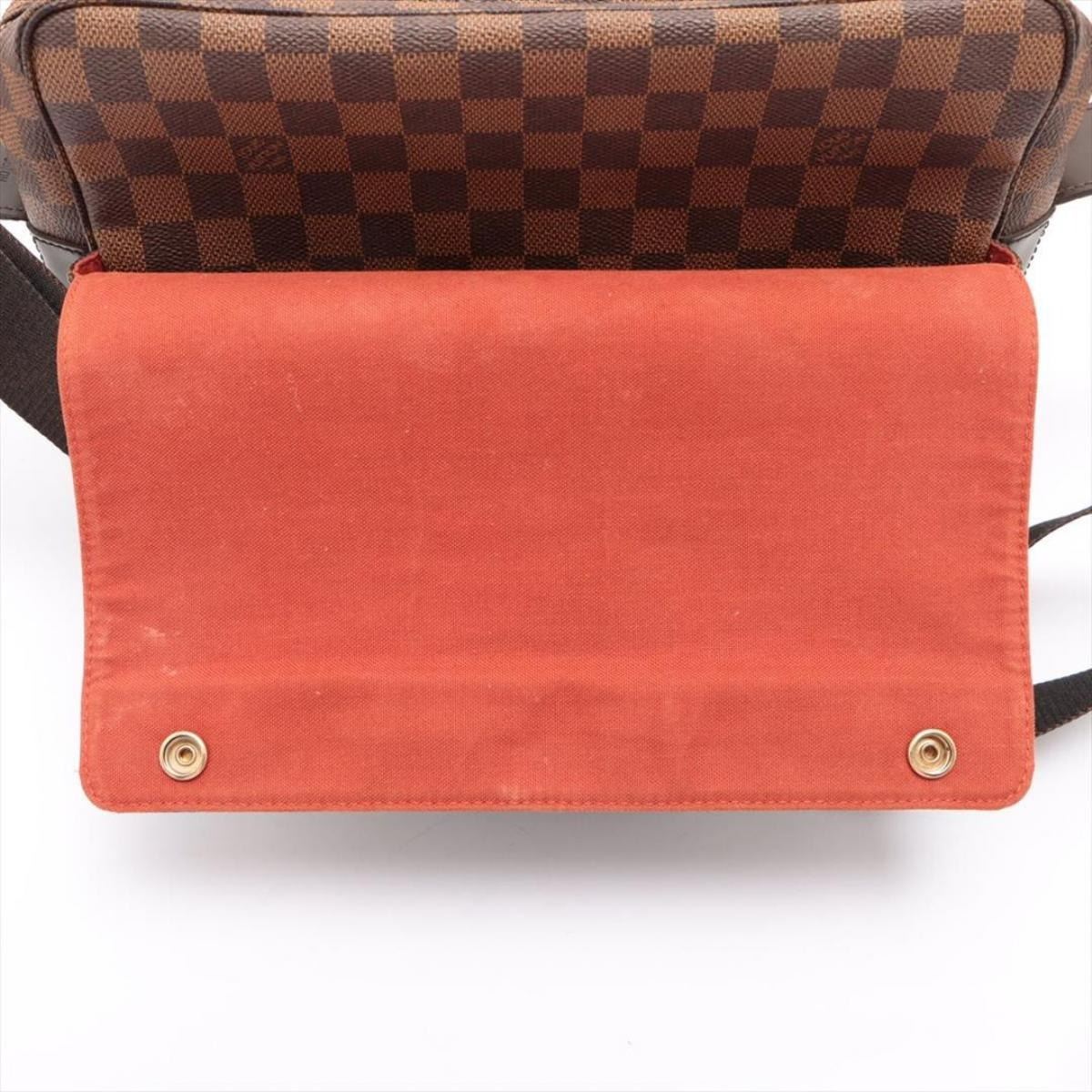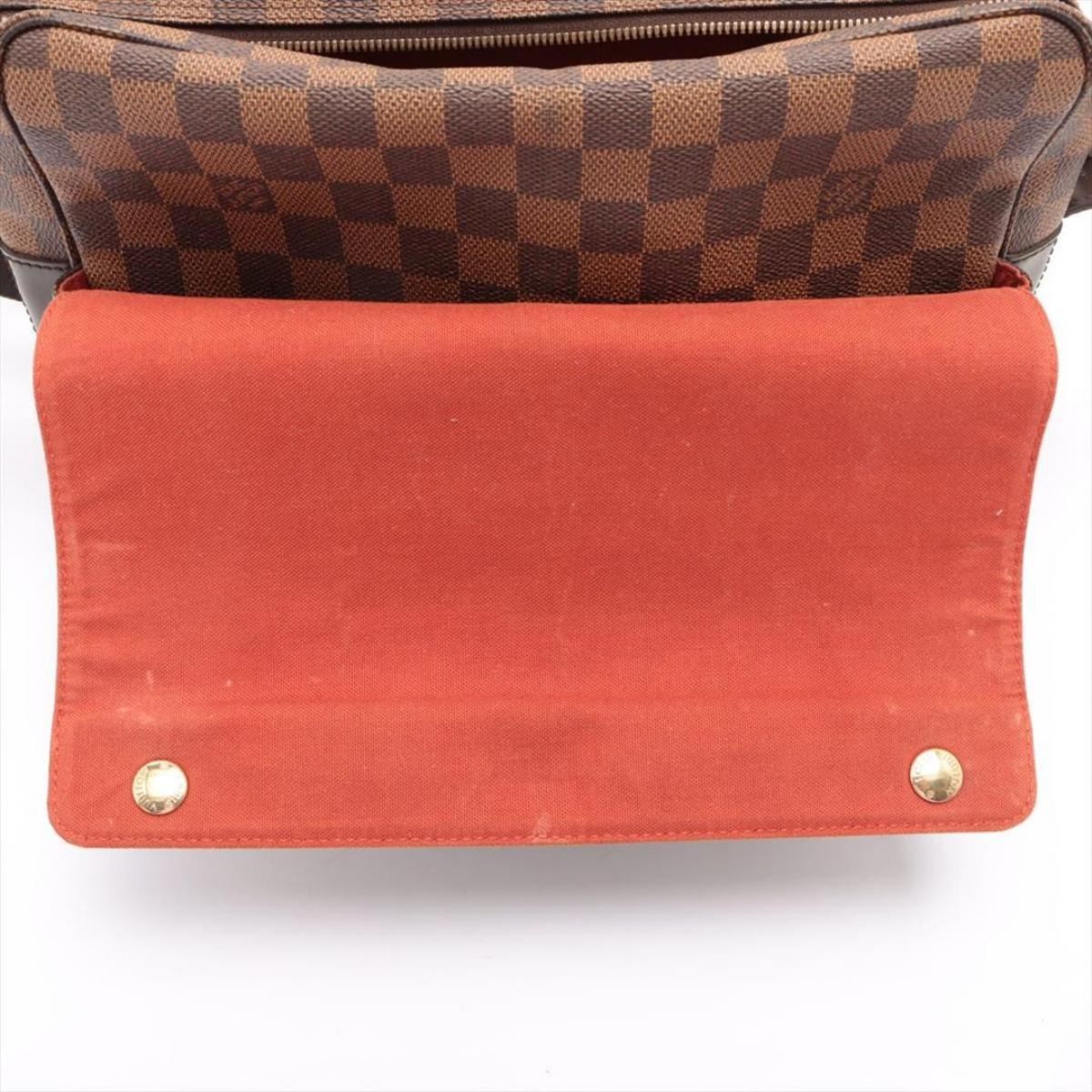 Brown Damier Ebene coated canvas Louis Vuitton Naviglio messenger bag with gold-tone hardware, walnut leather trim, single adjustable flat shoulder strap, three interior compartments; one with zip closure, terracotta woven lining, single slip pocket at interior wall and dual snap closures at top. 13"x3"x11"xBag Drop:21"/33cmx7.6cmx27.9cmxBag Drop:53.3cm