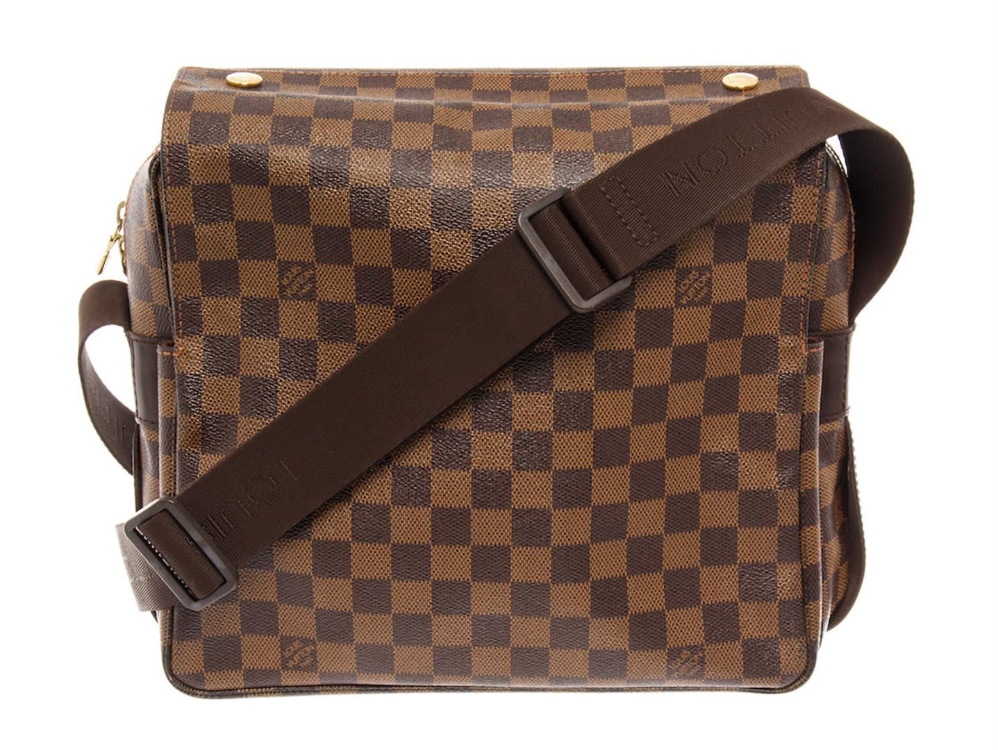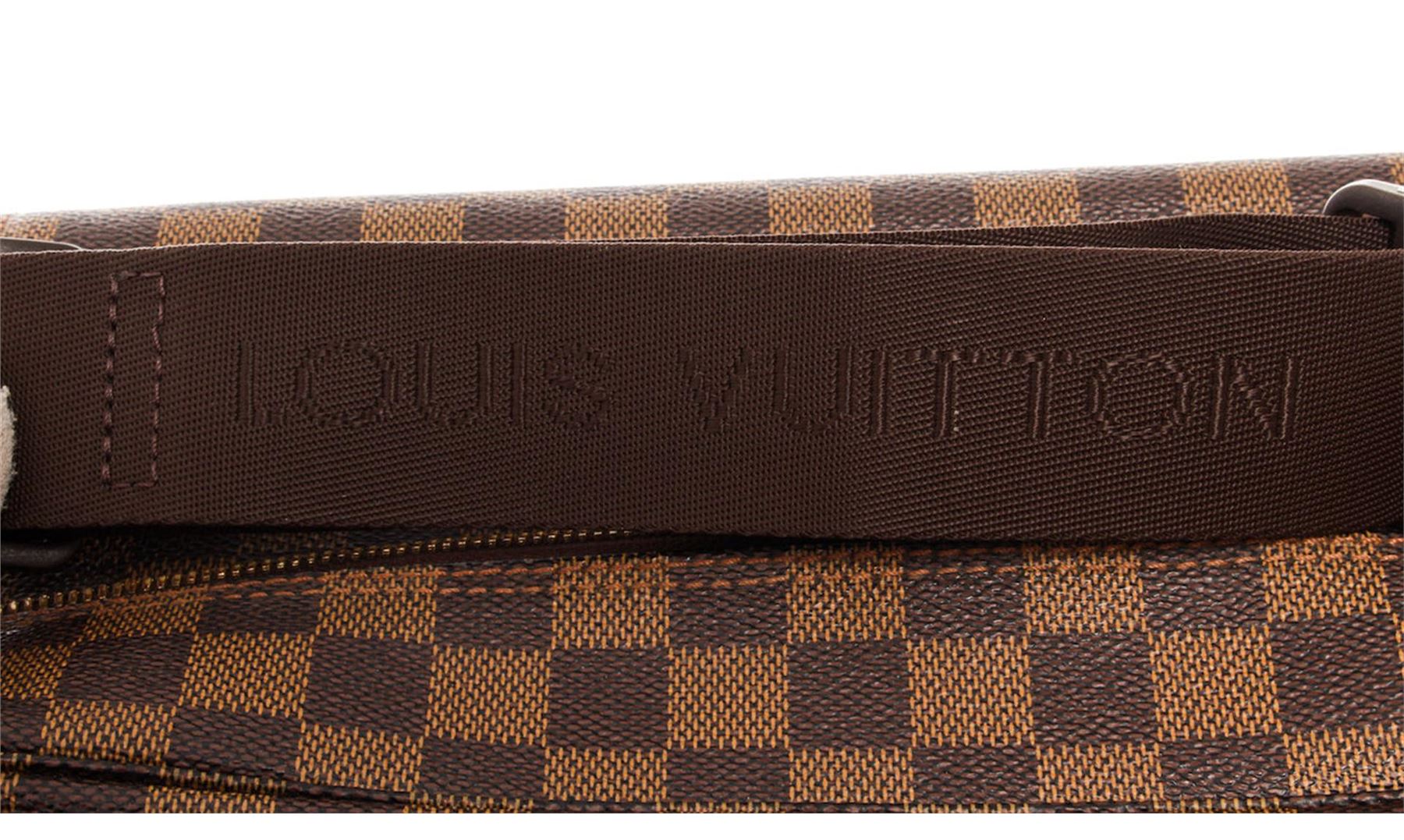 Brown Damier Ebene coated canvas Louis Vuitton Naviglio messenger bag with gold-tone hardware, walnut leather trim, single adjustable flat shoulder strap, three interior compartments; one with zip closure, brown woven lining, single slip pocket at interio