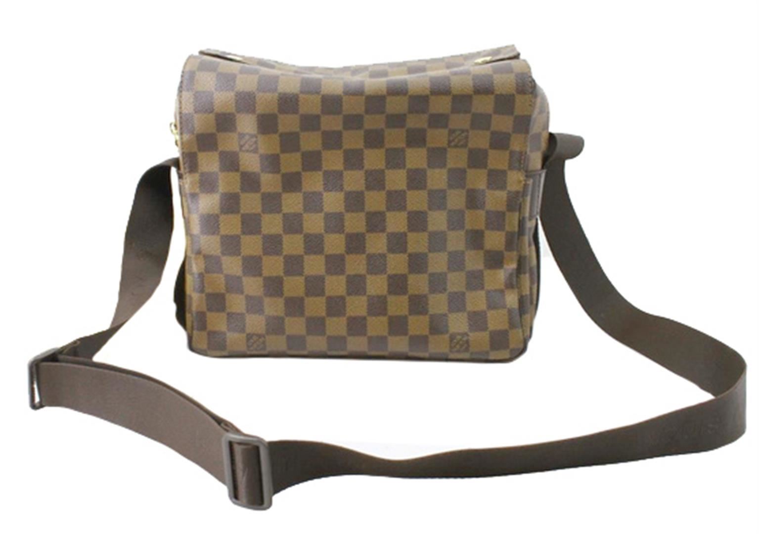 One Louis Vuitton Damier Ebene Canvas Leather Naviglio Messenger Bag. Item is sold AS-IS. All available information is listed in the description and shown in the photo. Brown Damier Ebene coated canvas Louis Vuitton Naviglio messenger bag with gold-tone hardware, dark brown leather trim, single adjustable flat shoulder strap, three interior compartments; one with zip closure, brown woven lining, single slip pocket at interior wall and dual snap closures at top. 13"x3"x11"xBag Drop:21"/33cmx7.6cmx27.9cmxBag Drop:53.3cm