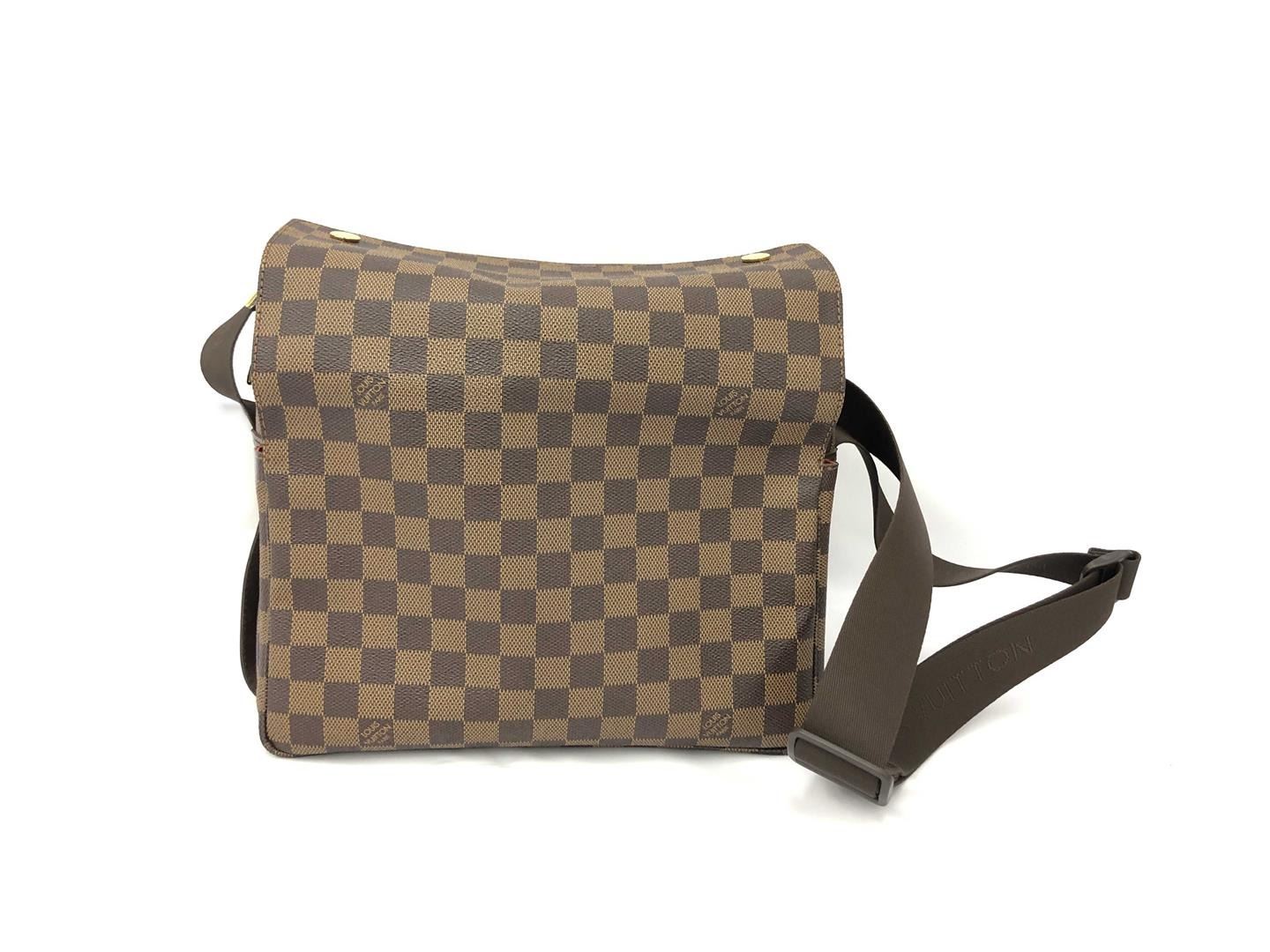 One Louis Vuitton Damier Ebene Canvas Leather Naviglio Messenger Bag. Item is sold AS-IS. All available information is listed in the description and shown in the photo. Brown Damier Ebene coated canvas Louis Vuitton Naviglio messenger bag with gold-tone hardware, dark brown leather trim, single adjustable flat shoulder strap, three interior compartments; one with zip closure, red woven lining, single slip pocket at interior wall and dual snap closures at top. 13"x3"x11"xBag Drop:21"/33cmx7.6cmx27.9cmxBag Drop:53.3cm