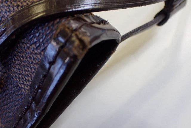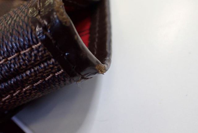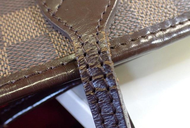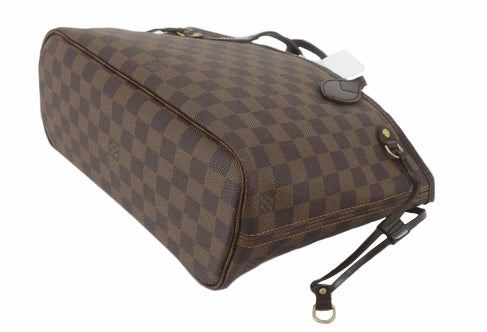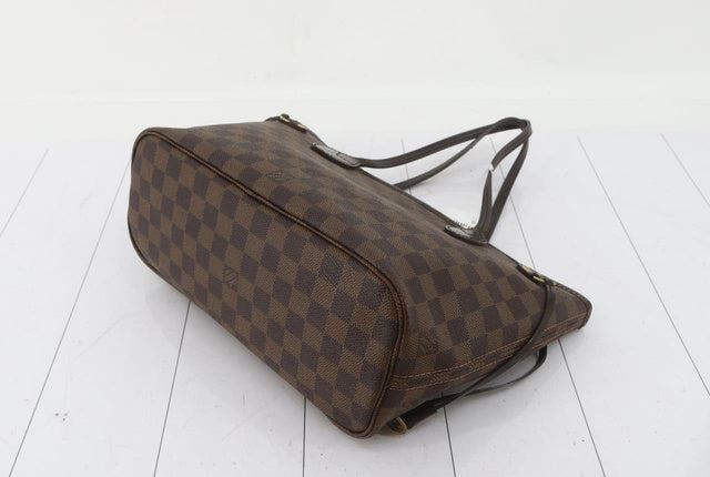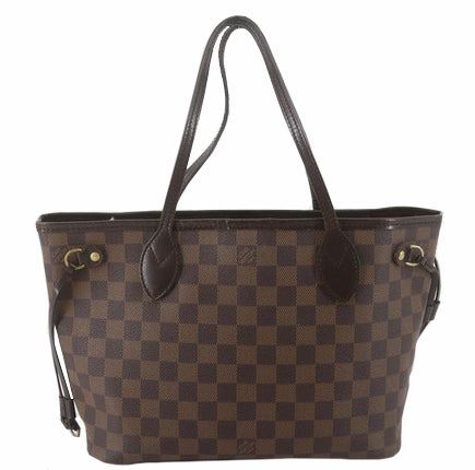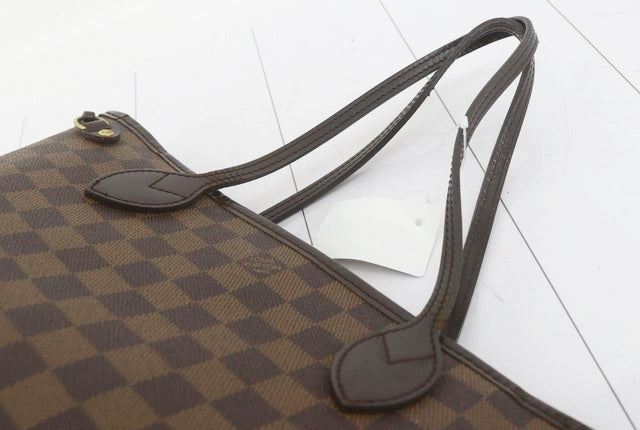 Brown and tan Damier Ebene coated canvas Louis Vuitton Neverfull PM with gold-tone hardware, leather trim, dual flat shoulder straps, red striped canvas lining, single zip pocket at interior wall and lobster clasp closure at top. 1.4"x8.7"x5.1"xBag D