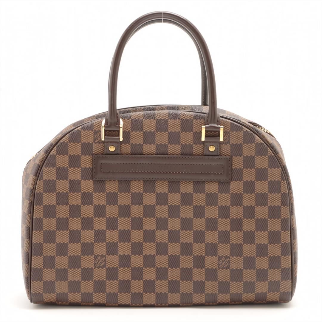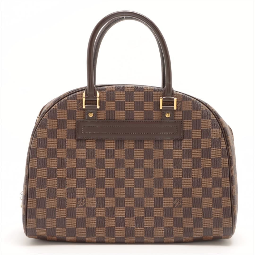 Brown Damier Ebene coated canvas Louis Vuitton Nolita bag with gold-tone hardware, dark brown leather trim, logo at front, dual pockets at exterior, dual rolled top handles, terracotta woven lining, three pockets at interior walls, single zip pocket and t