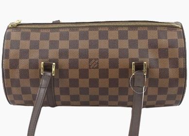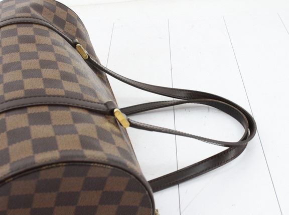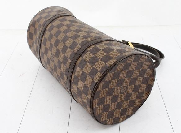 Brown Damier Ebene coated canvas Louis Vuitton Papillon 30 cm with gold-tone hardware, tan vachetta leather trim, dual flat handles, brown Taiga leather interior and zip closure at top. 12"x6"x6"xBag Drop:6"/30cmx15.2cmx15.2cmxBag Drop:15.2cm