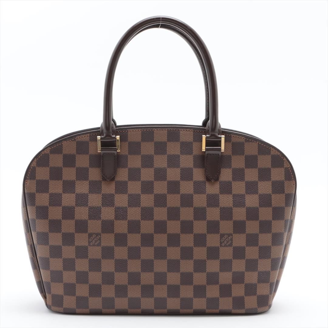 One Louis Vuitton Damier Ebene Canvas Leather Sarria Horizontal Bag. Item is sold AS-IS. All available information is listed in the description and shown in the photo. Brown Damier Ebene coated canvas Louis Vuitton Sarria Horizontal bag with dark brown leather trim, gold-tone hardware, rust red Alcantara microfiber lining, two interior slip pockets, slip pocket on front exterior, dual rolled top handles, and zip top closure. 11.5"x4"x9.5"HD:5"/30cmx10cm24cm