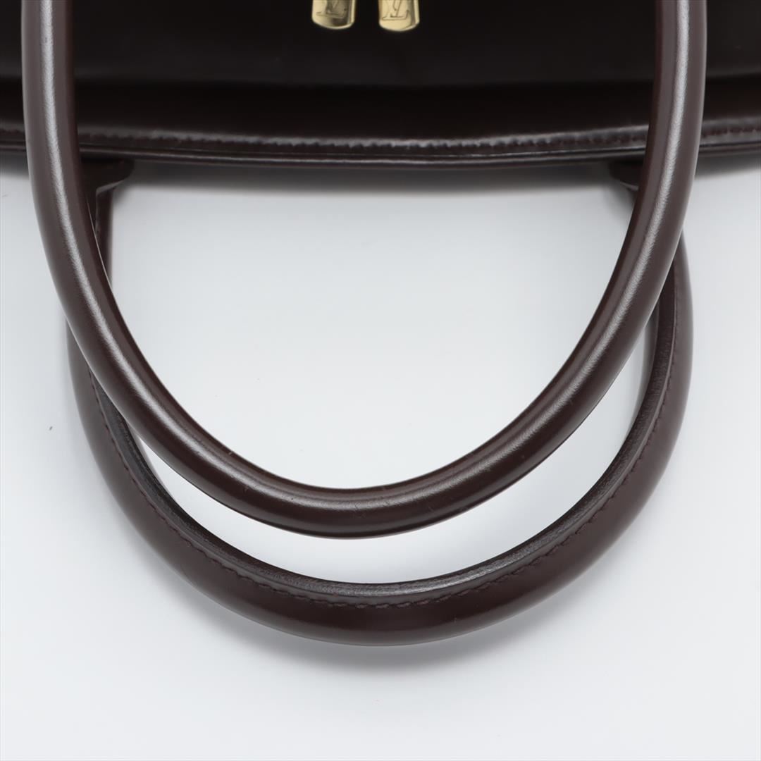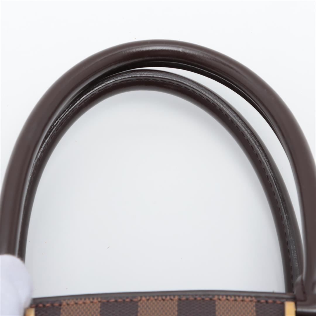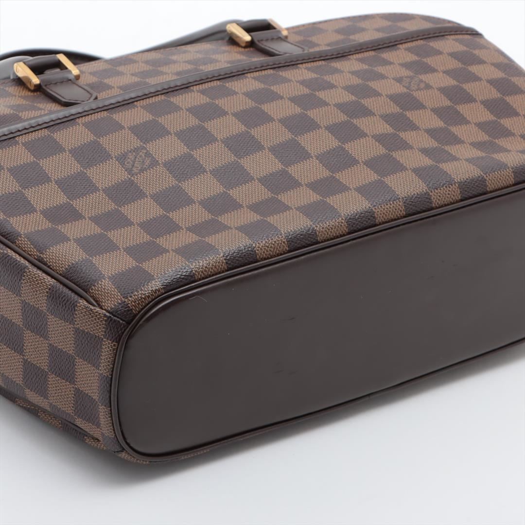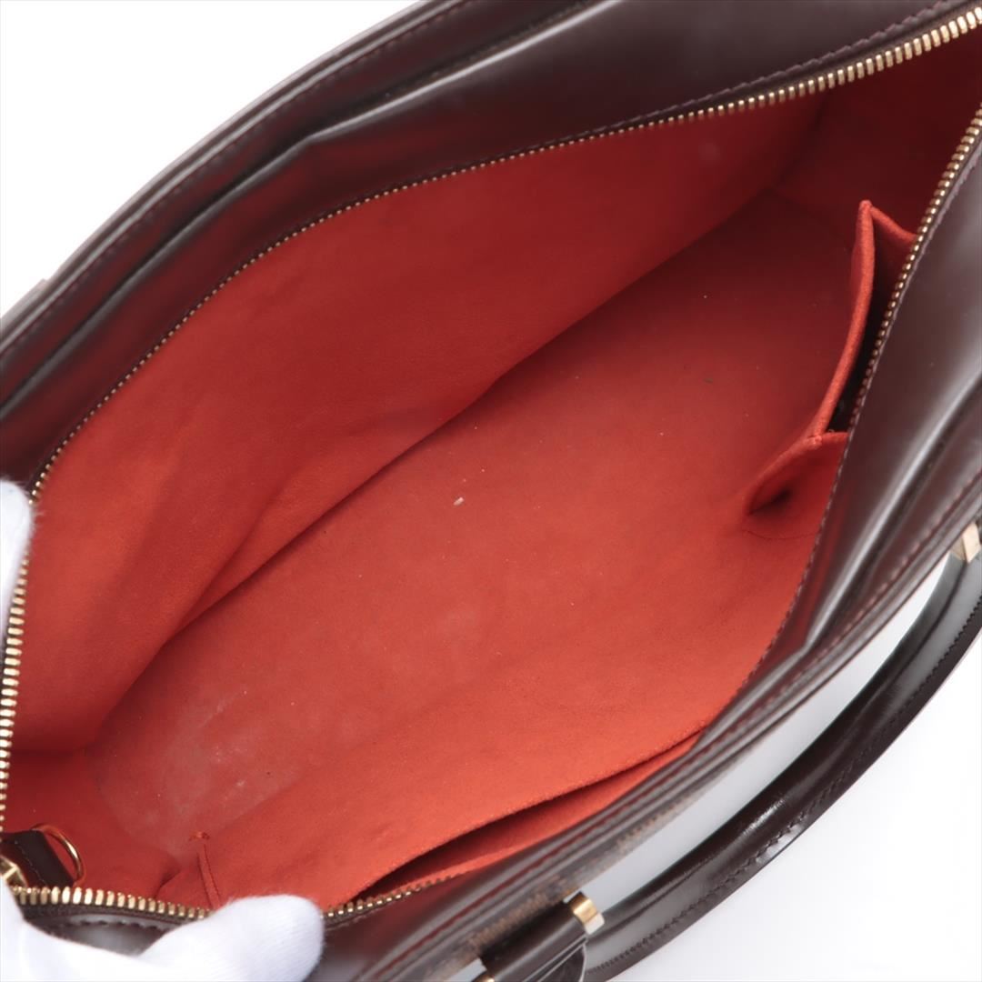 One Louis Vuitton Damier Ebene Canvas Leather Sarria Horizontal Bag. Item is sold AS-IS. All available information is listed in the description and shown in the photo. Brown Damier Ebene coated canvas Louis Vuitton Sarria Horizontal bag with dark brown leather trim, gold-tone hardware, rust red Alcantara microfiber lining, two interior slip pockets, slip pocket on front exterior, dual rolled top handles, and zip top closure. 11.5"x4"x9.5"HD:5"/30cmx10cm24cm