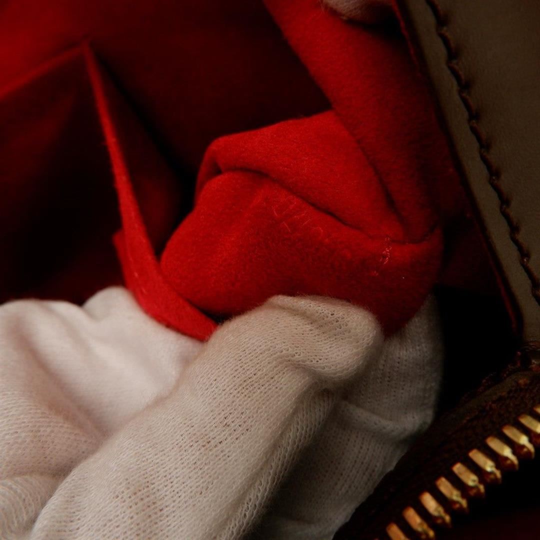 Brown and tobacco Damier Ebene coated canvas Louis Vuitton Sistina GM with gold-tone hardware, moka leather trim throughout, dual flat adjustable leather handles, red Alcantara interior lining, one center zip compartment, two flat pockets, flap tab with golde-tone Louis Vuitton engraved buckle.