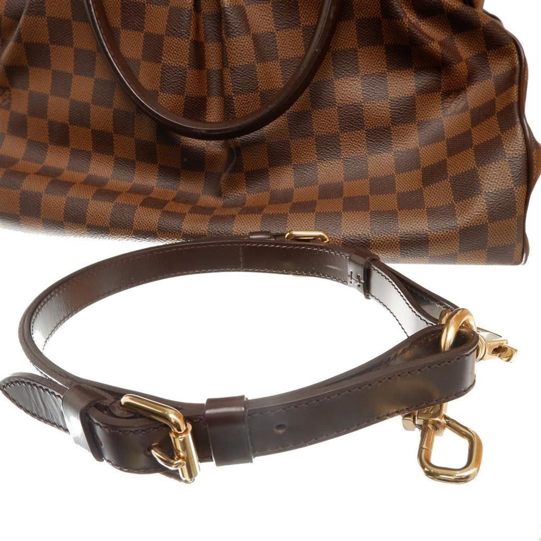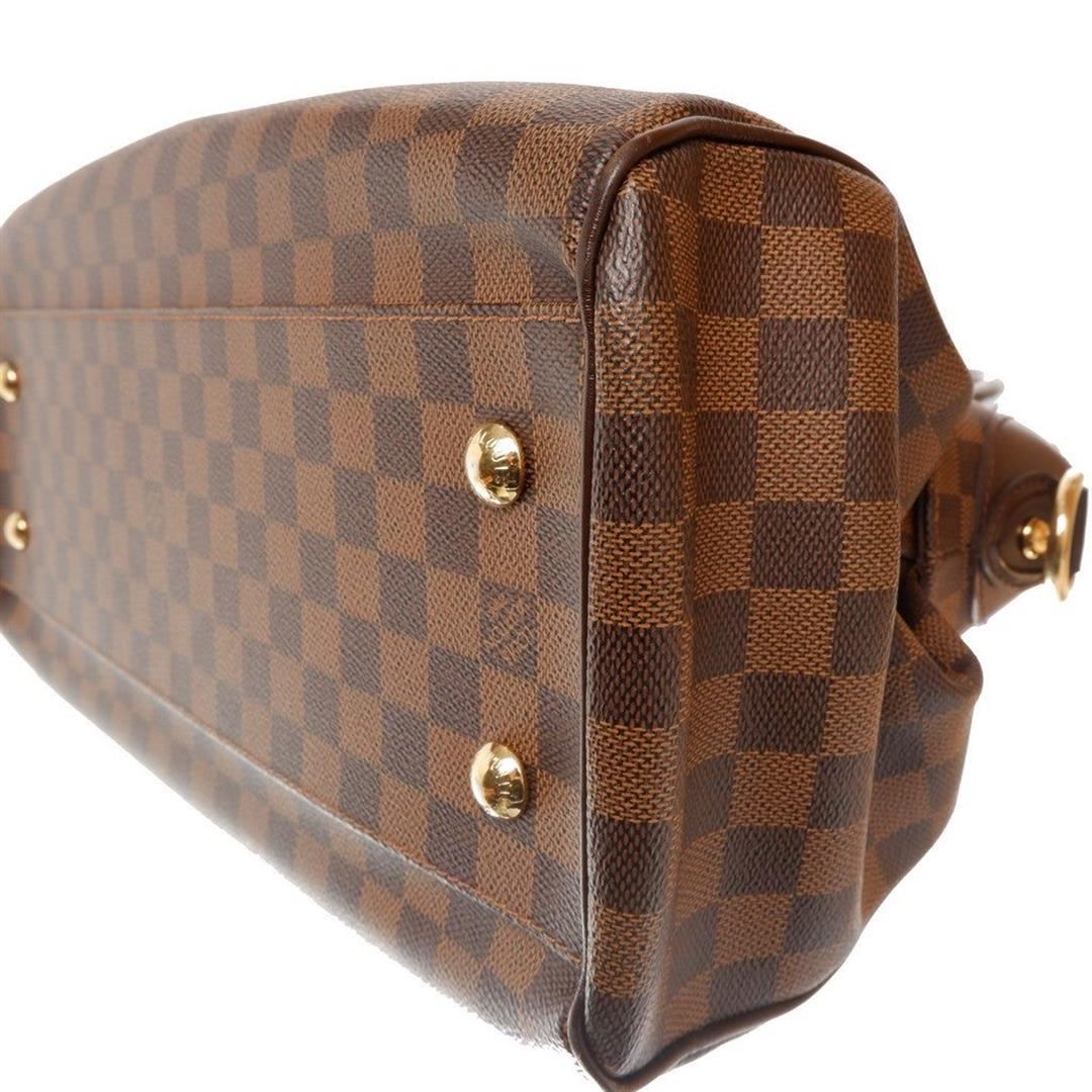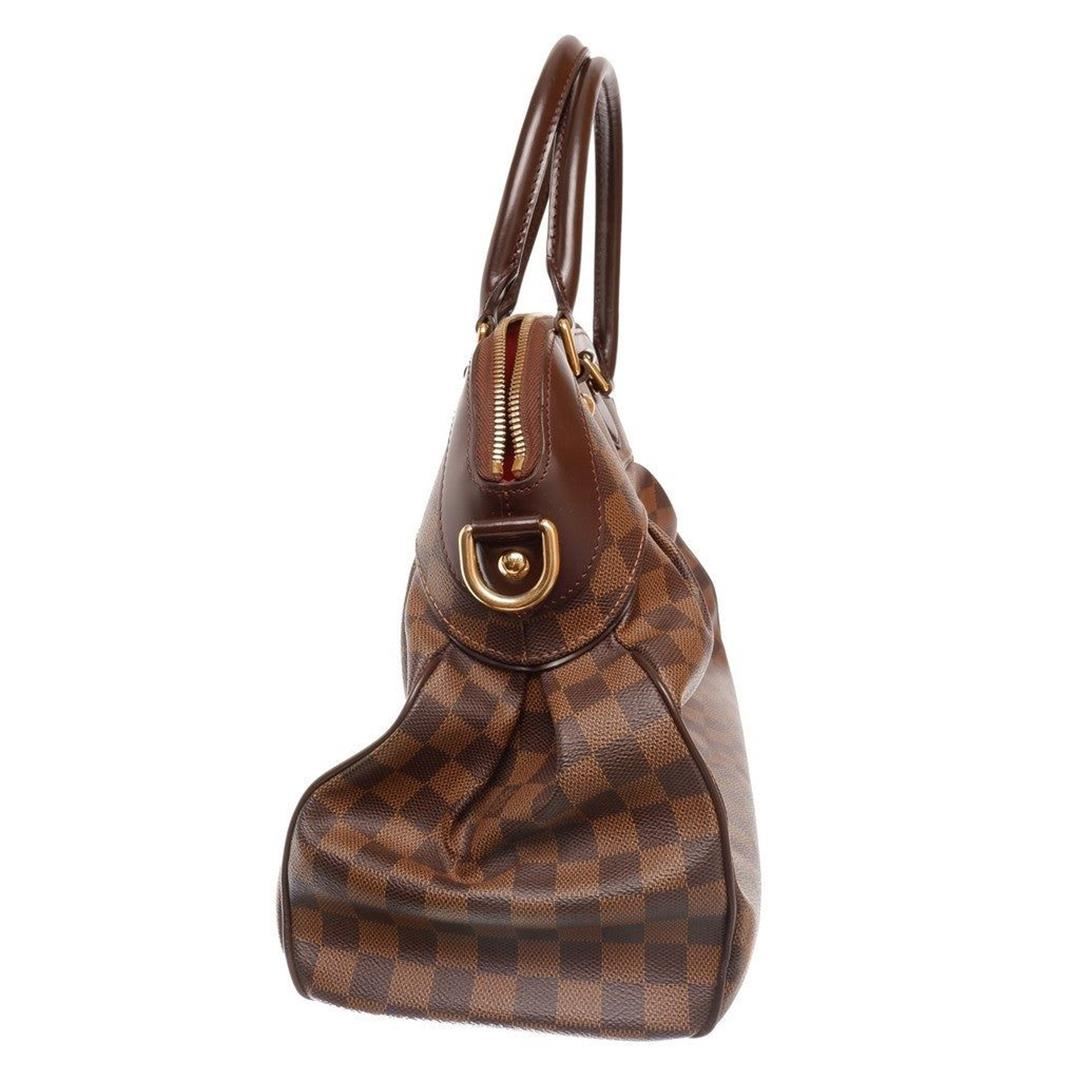Brown and tan Damier Ebene coated canvas Louis Vuitton Trevi GM with gold-tone hardware, leather accents, dual rolled top handles, red Alcantara lining, dual open pockets at interior walls and zip closure at top.