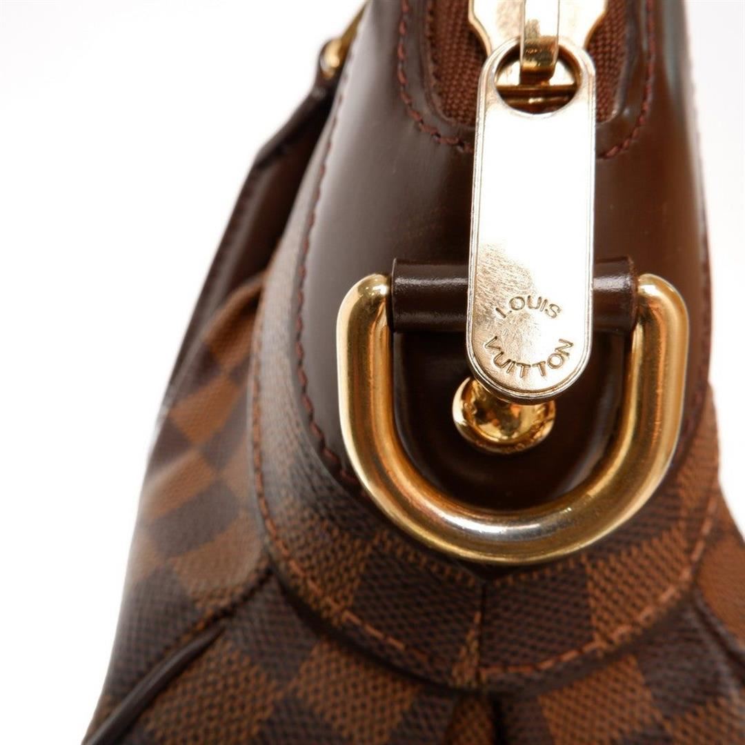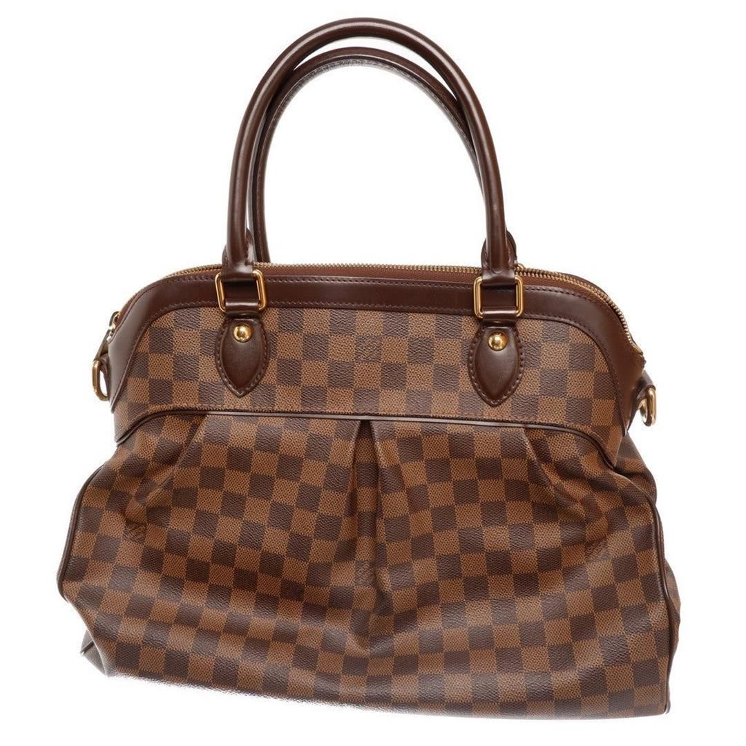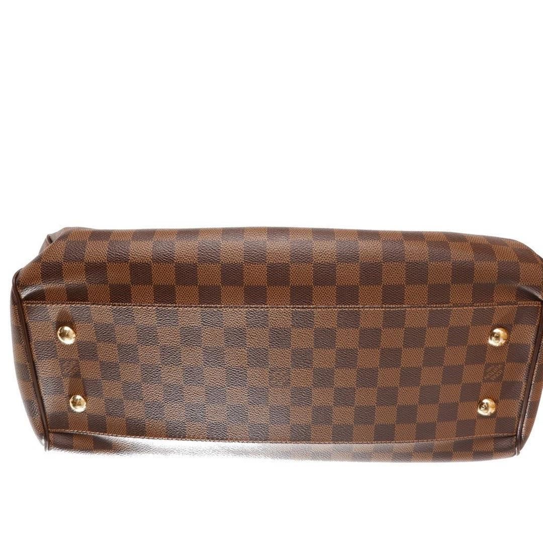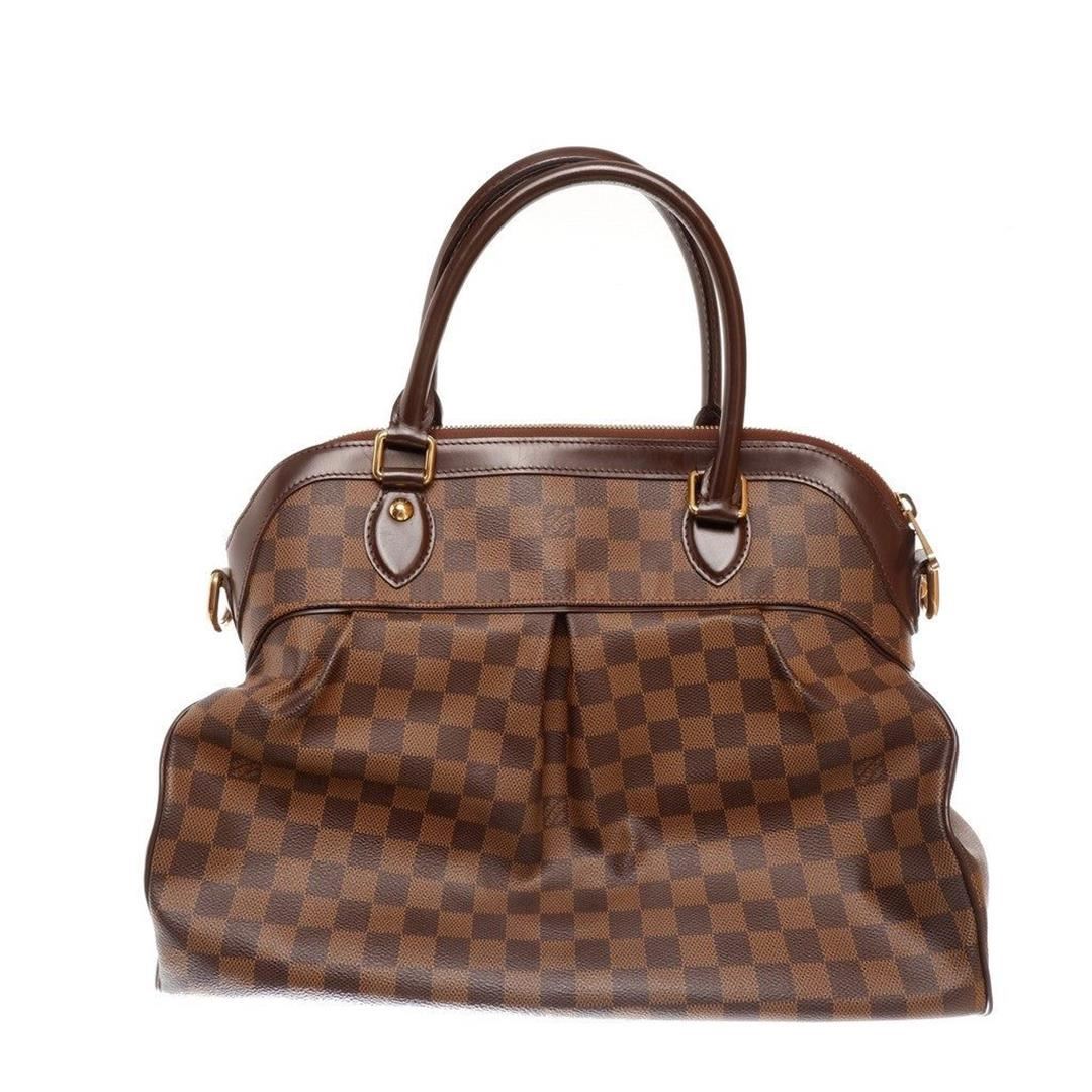 Brown and tan Damier Ebene coated canvas Louis Vuitton Trevi GM with gold-tone hardware, leather accents, dual rolled top handles, red Alcantara lining, dual open pockets at interior walls and zip closure at top.