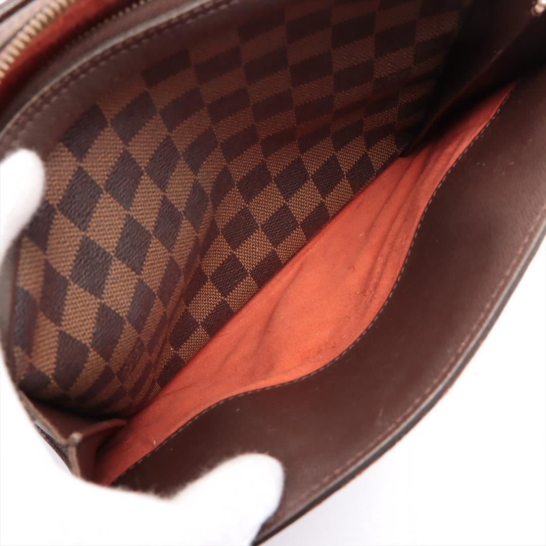 One Louis Vuitton Damier Ebene Canvas Leather Triana Handbag. Item is sold AS-IS. All available information is listed in the description and shown in the photo. Brown Damier Ebene coated canvas Louis Vuitton Triana Handbag with gold-tone hardware, mocha leather trim, dual rolled handles, dual slit pockets at exterior, orange Alcantara lining, single zipped pocket at interior wall and zip closure at top. 10.5"x3.5"x9.5"xBag Drop:5"/26.6cmx8.8cmx24.1cmxBag Drop:12.7cm