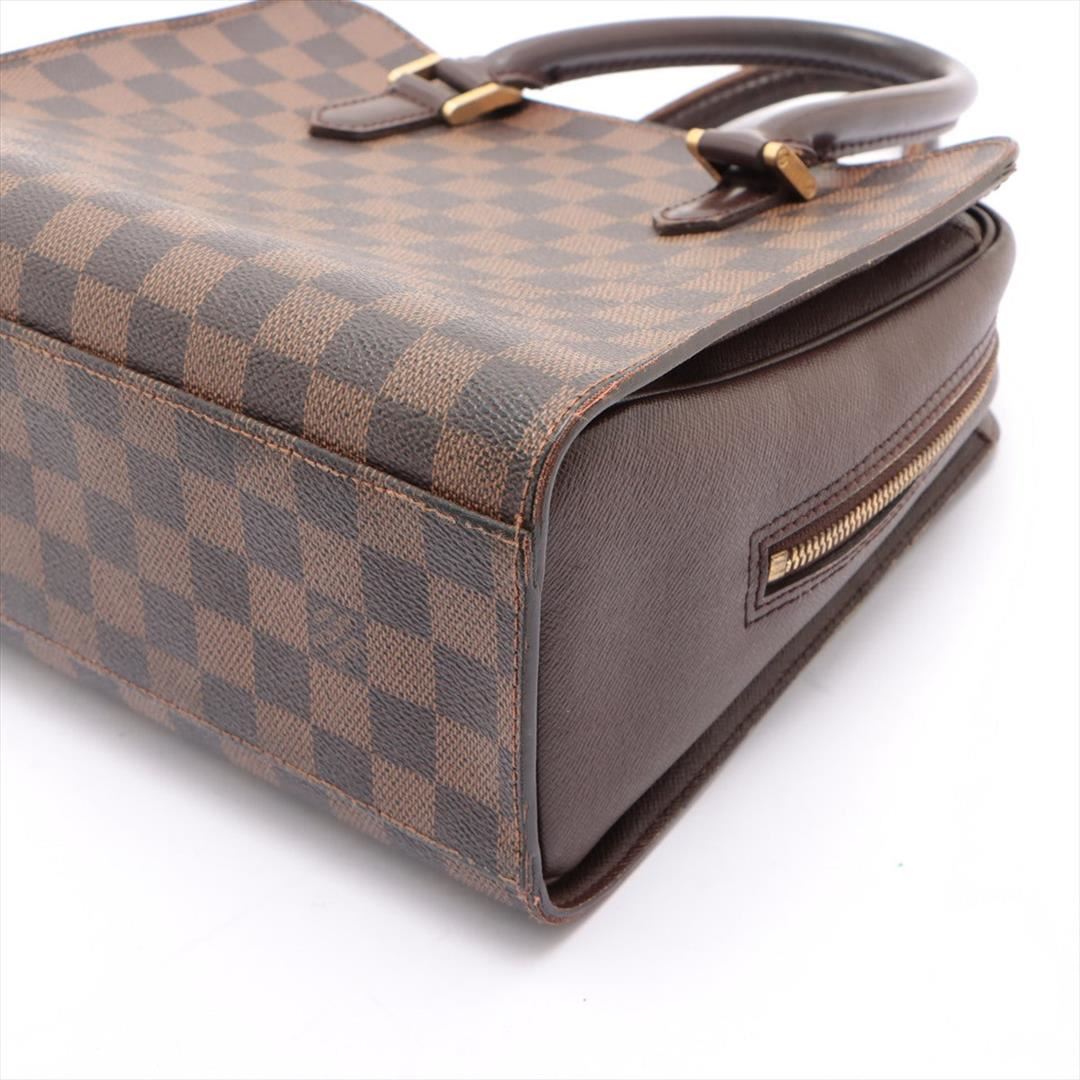 One Louis Vuitton Damier Ebene Canvas Leather Triana Handbag. Item is sold AS-IS. All available information is listed in the description and shown in the photo. Brown Damier Ebene coated canvas Louis Vuitton Triana Handbag with gold-tone hardware, mocha leather trim, dual rolled handles, dual slit pockets at exterior, orange Alcantara lining, single zipped pocket at interior wall and zip closure at top. 10.5"x3.5"x9.5"xBag Drop:5"/26.6cmx8.8cmx24.1cmxBag Drop:12.7cm