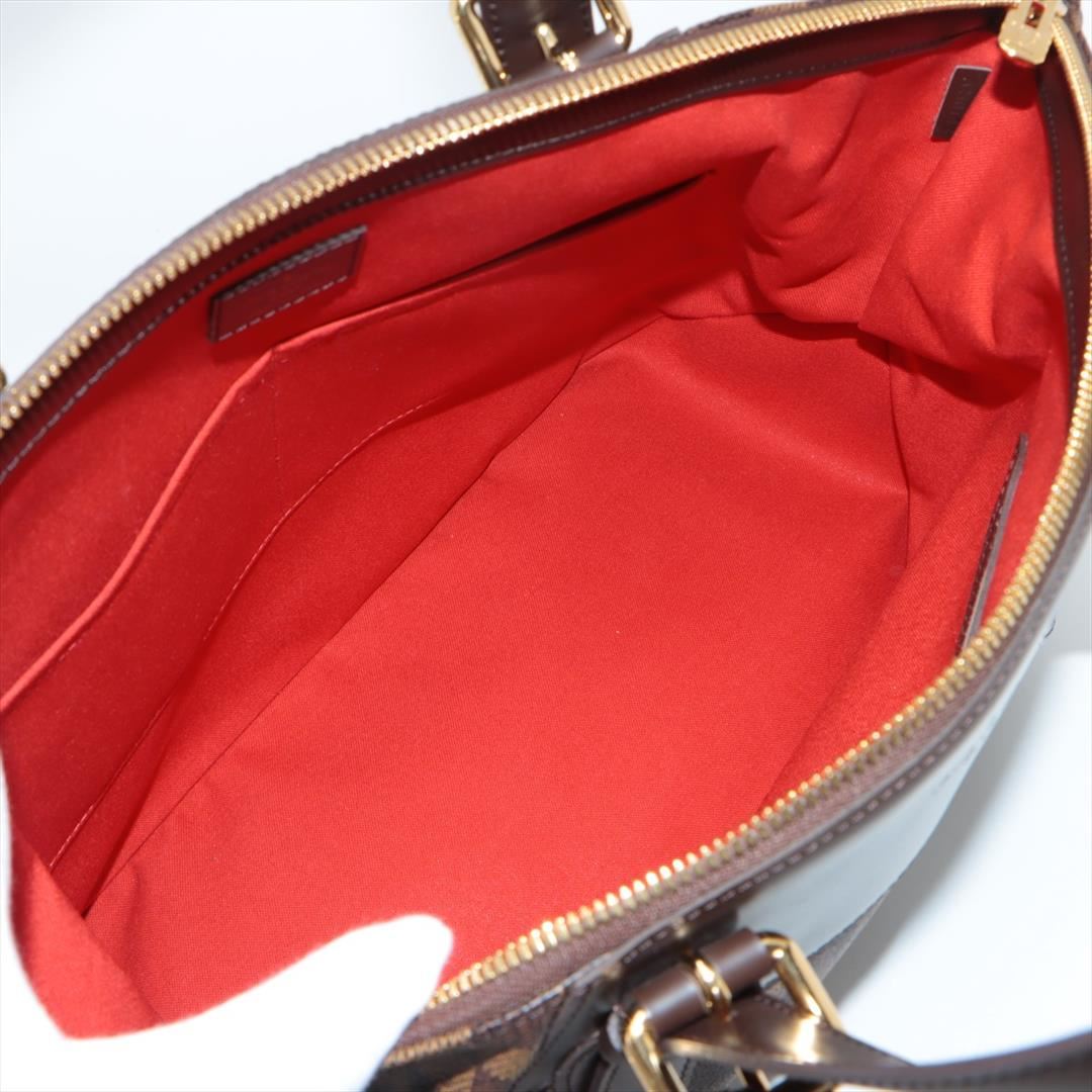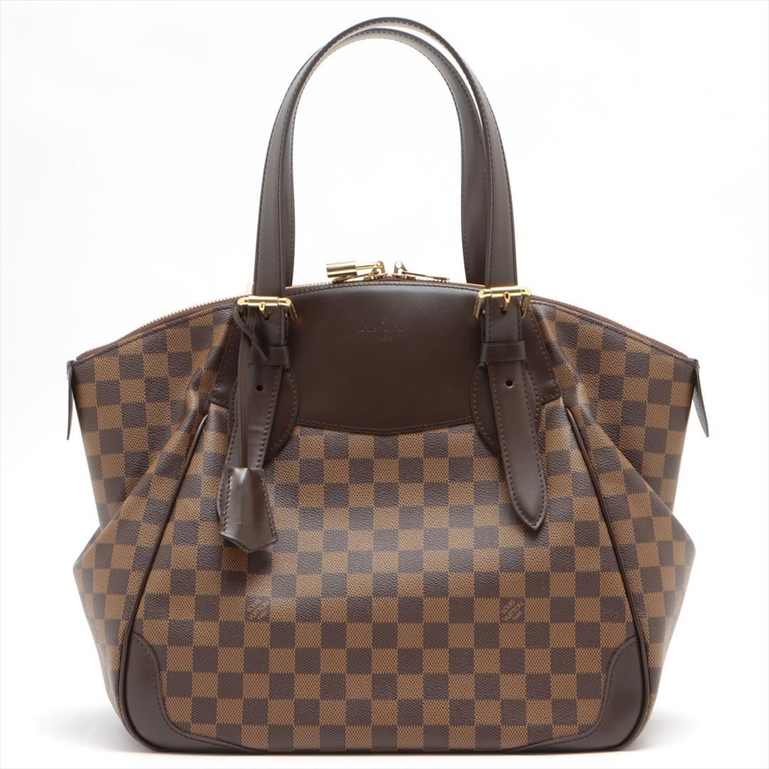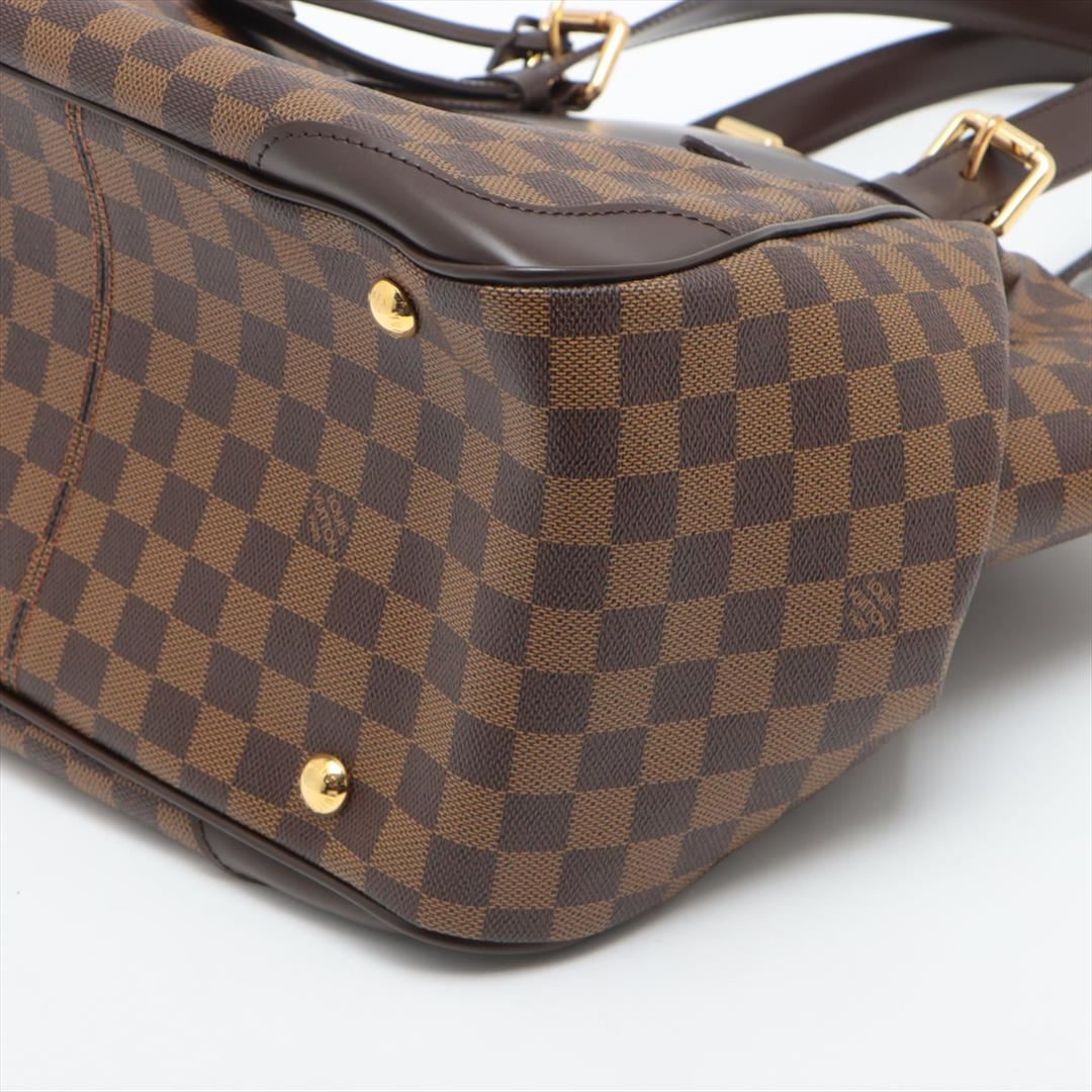 Brown Damier Ebene coated canvas Louis Vuitton Verona GM with gold-tone hardware, dual flat shoulder straps with buckle adjustments, dark brown leather trim, debossed logo at front, protective feet at base, red canvas lining, three slit pockets and logo n