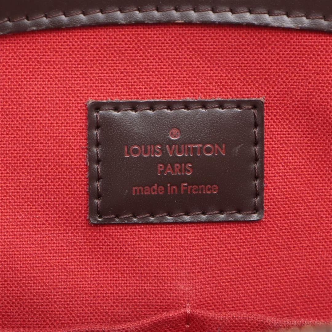 Brown Damier Ebene coated canvas Louis Vuitton Verona MM with gold-tone hardware, dual flat shoulder straps with buckle adjustments, dark brown leather trim, debossed logo at front, protective feet at base, red canvas lining, three slit pockets and logo n