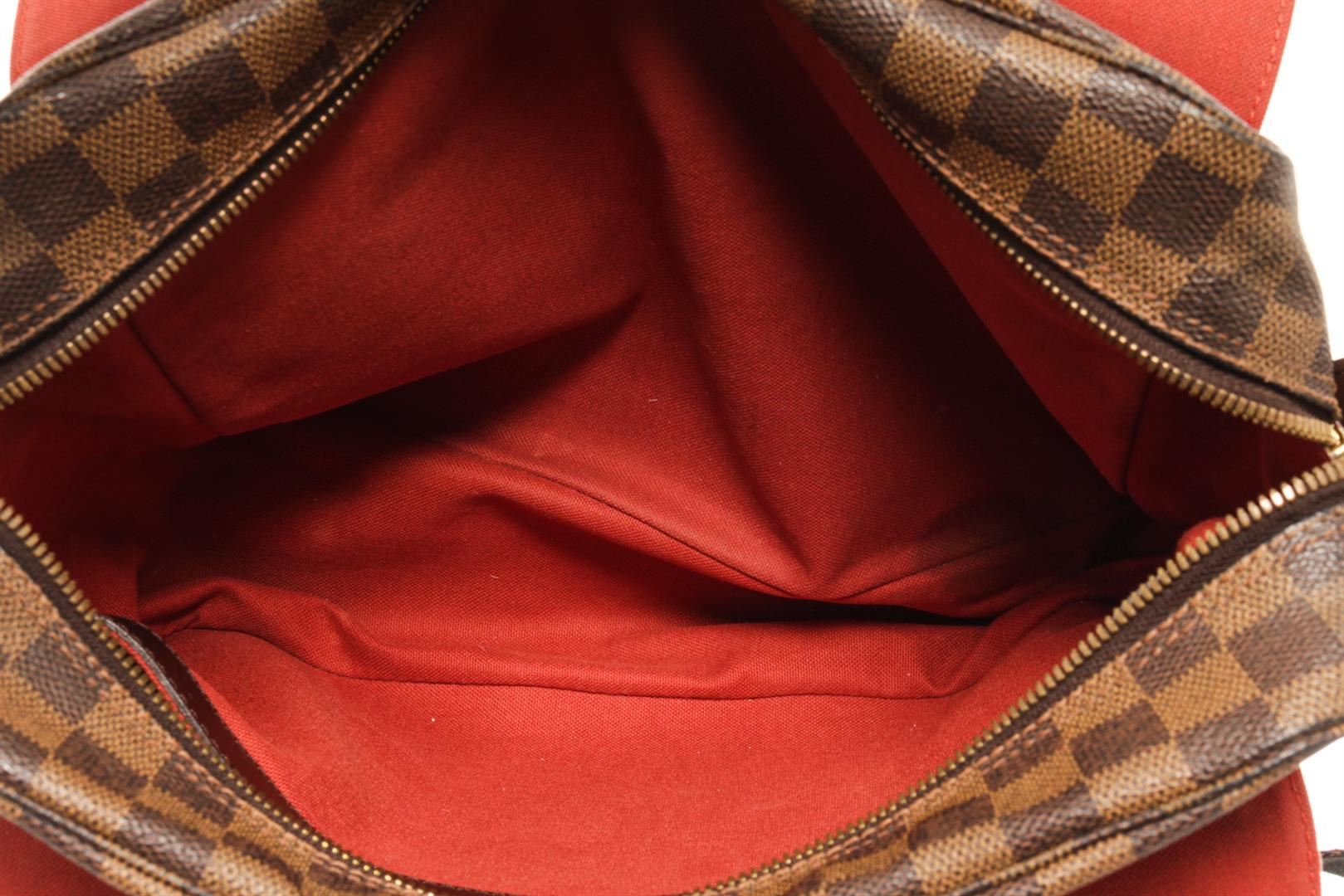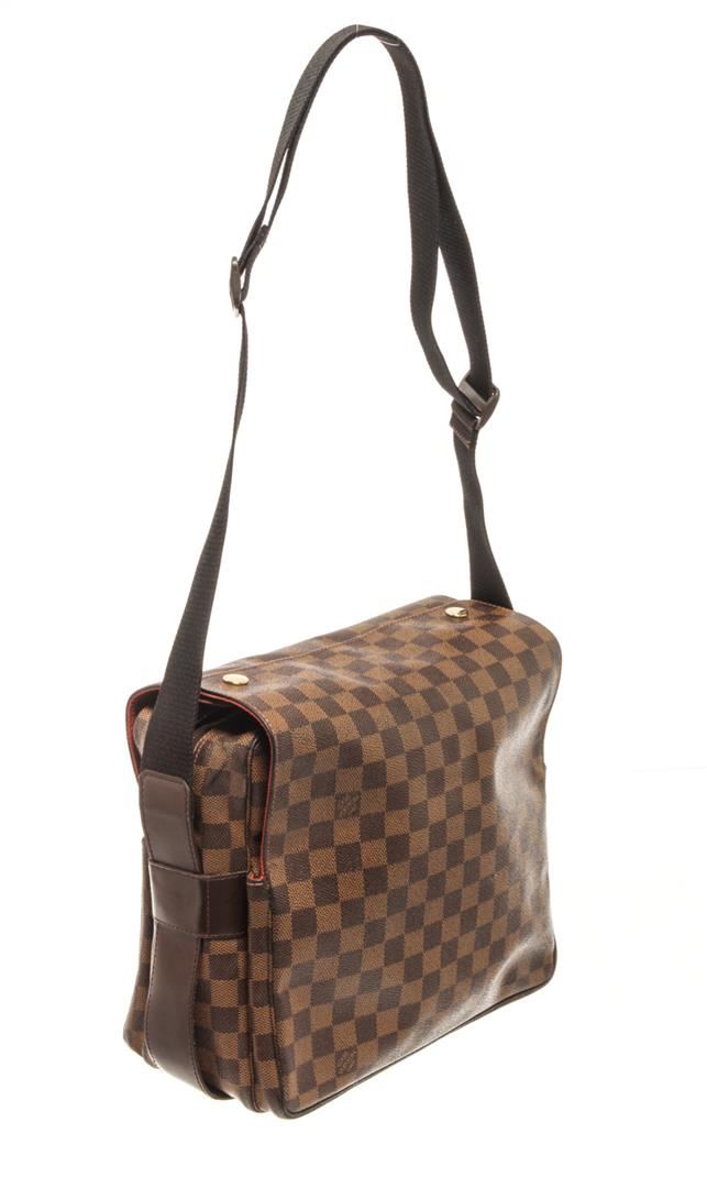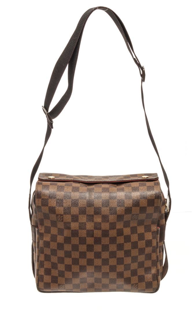 One Louis Vuitton Damier Ebene Canvas Naviglio Shoulder Bag. Item is sold AS-IS. All available information is listed in the description and shown in the photo. louis vuitton damier ebene canvas naviglio shoulder bag with brown canvas, coated finish, signature damier ebne canvas, adjustable shoulder strap, foldover top main compartment. Depth 3.5 in, Height 9.1 in / Depth 9 cm, Height 23 cm