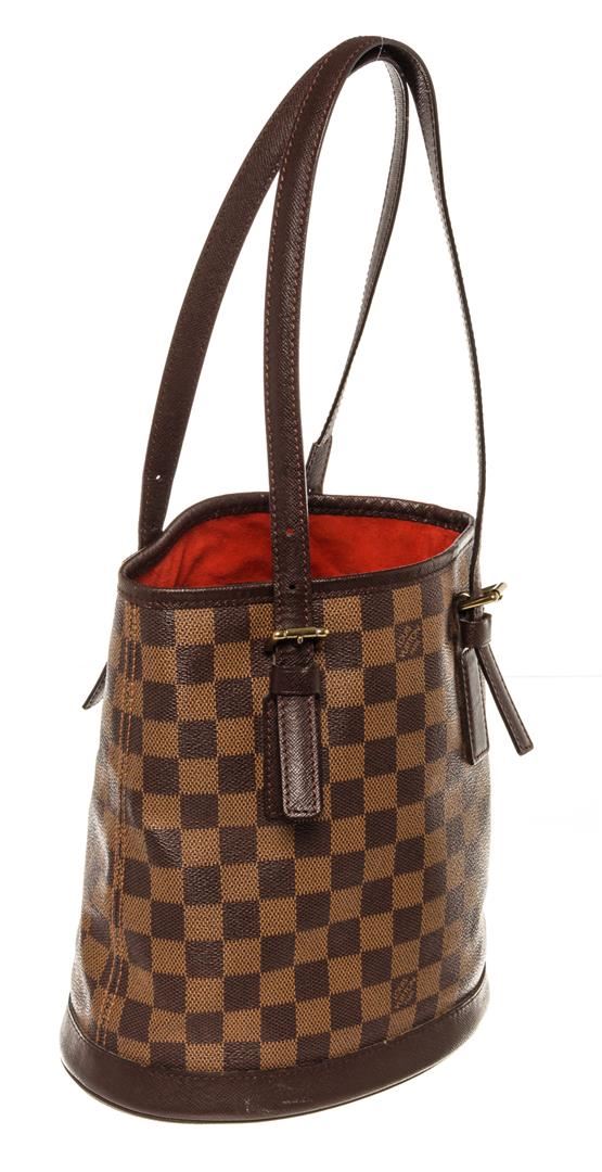 One Louis Vuitton Damier Ebene Marais Bucket Bag. Item is sold AS-IS. All available information is listed in the description and shown in the photo. LV Damier Ebene Marais Bucket Bag. Features gold hardware and red lining.