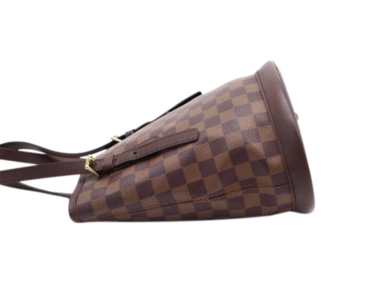 One Louis Vuitton Damier Ebene Marais Bucket Bag. Item is sold AS-IS. All available information is listed in the description and shown in the photo. Louis Vuitton Brown Damier Ebene coated canvas Marais Bucket Bag with gold tone hardware, brown taiga leather trim, red suede lining, zip interior pocket, brown leather dual top straps, and an open top closure
