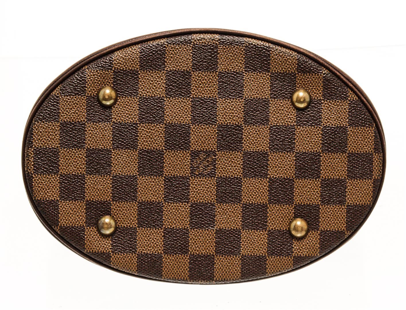 One Louis Vuitton Damier Ebene Marais Handbag. Item is sold AS-IS. All available information is listed in the description and shown in the photo. Louis Vuitton Damier Ebene Marais handbag with coated canvas exterior, brown suede lining, brown leather adjustable top handles, gold-tone hardware, open top, and one main compartment with one zip pocket.