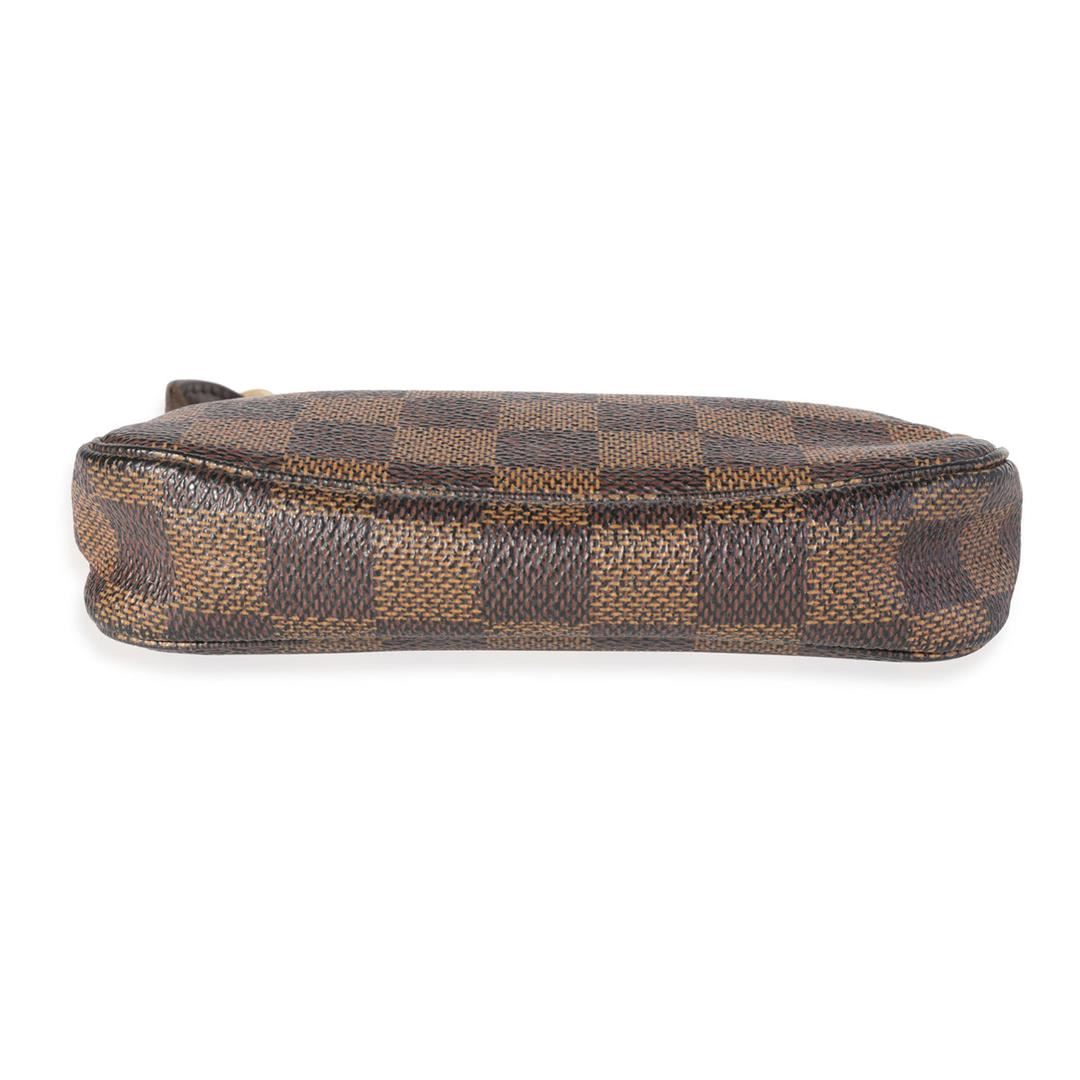 One Louis Vuitton Damier Ebene Mini Pochette Accessoires. Item is sold AS-IS. All available information is listed in the description and shown in the photo. Louis Vuitton Damier Ebene Mini Pochette Accessoires. Features gold hardware, red suede interior, and a gold zipper closure.