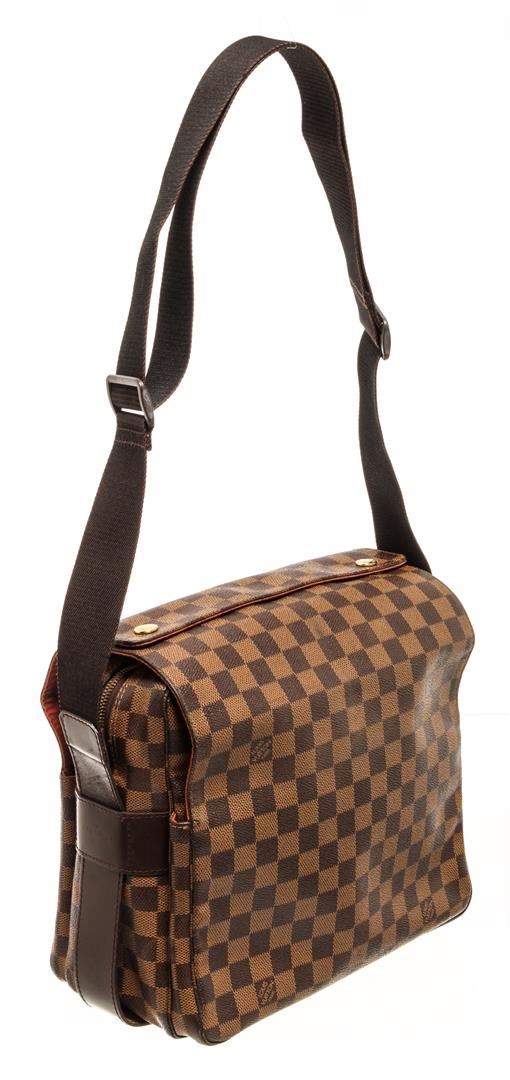 One Louis Vuitton Damier Ebene Naviglio. Item is sold AS-IS. All available information is listed in the description and shown in the photo. Louis Vuitton Damier Ebene Naviglio shoulder bag with adjustable strap, flap and zip closure, red fabric lining, one interior slip pocket, and gold-tone hardware.