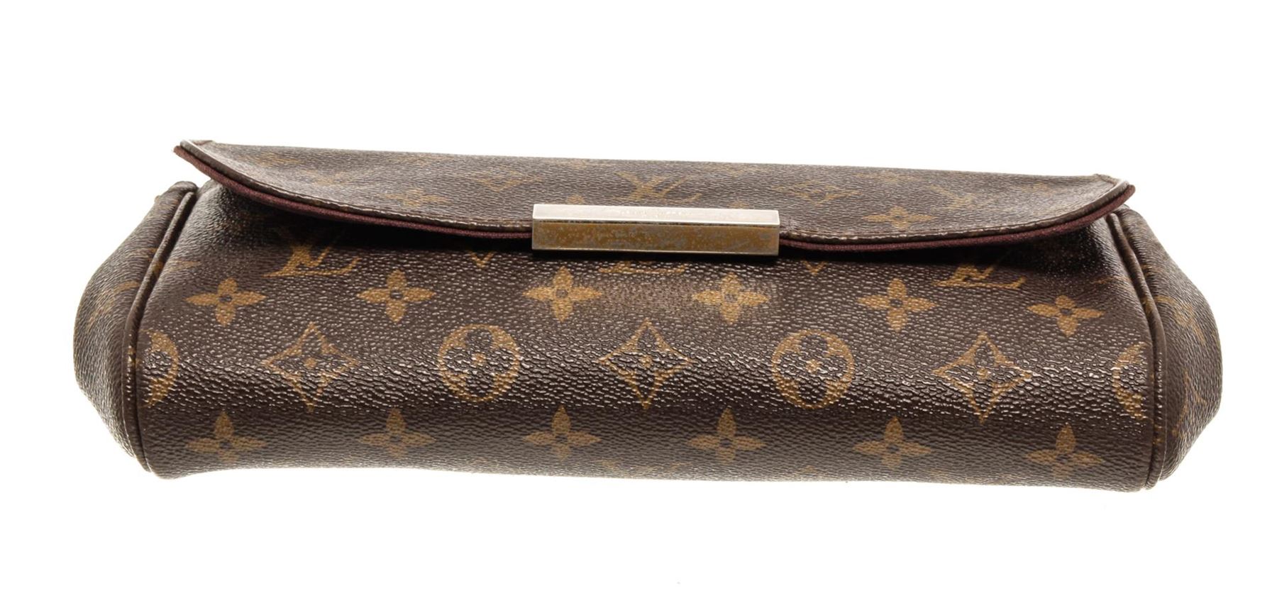 One Louis Vuitton Favorite Brown Monogram Canvas MM Crossbody Bag. Item is sold AS-IS. All available information is listed in the description and shown in the photo. Louis Vuitton Favorite PM Brown Monogram Canvas Cross Body Bag with material Monogram Canvas, gold-tone hardware, interior slip pocket, burgundy canvas lining, Removeable chain strap and long leather shoulder strap and flap closure. .