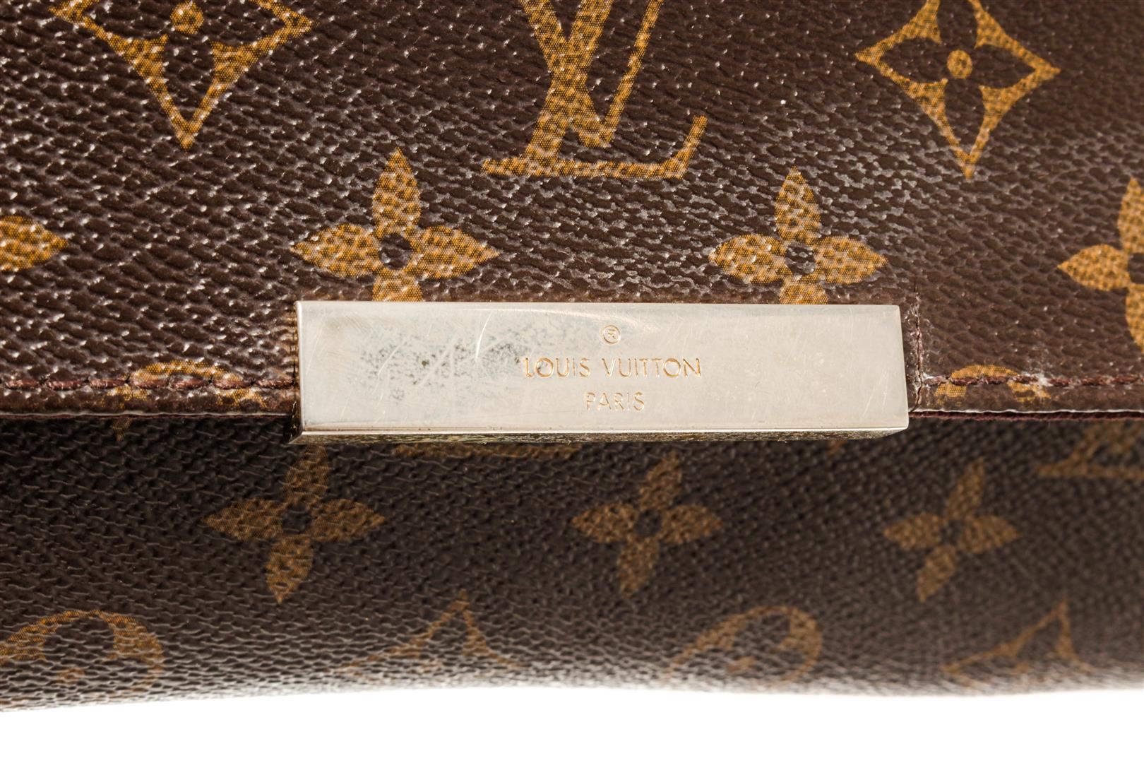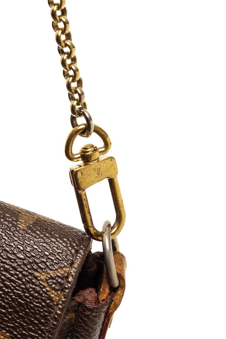 One Louis Vuitton Favorite Brown Monogram Canvas MM Crossbody Bag. Item is sold AS-IS. All available information is listed in the description and shown in the photo. Louis Vuitton Favorite PM Brown Monogram Canvas Cross Body Bag with material Monogram Canvas, gold-tone hardware, interior slip pocket, burgundy canvas lining, Removeable chain strap and long leather shoulder strap and flap closure. .