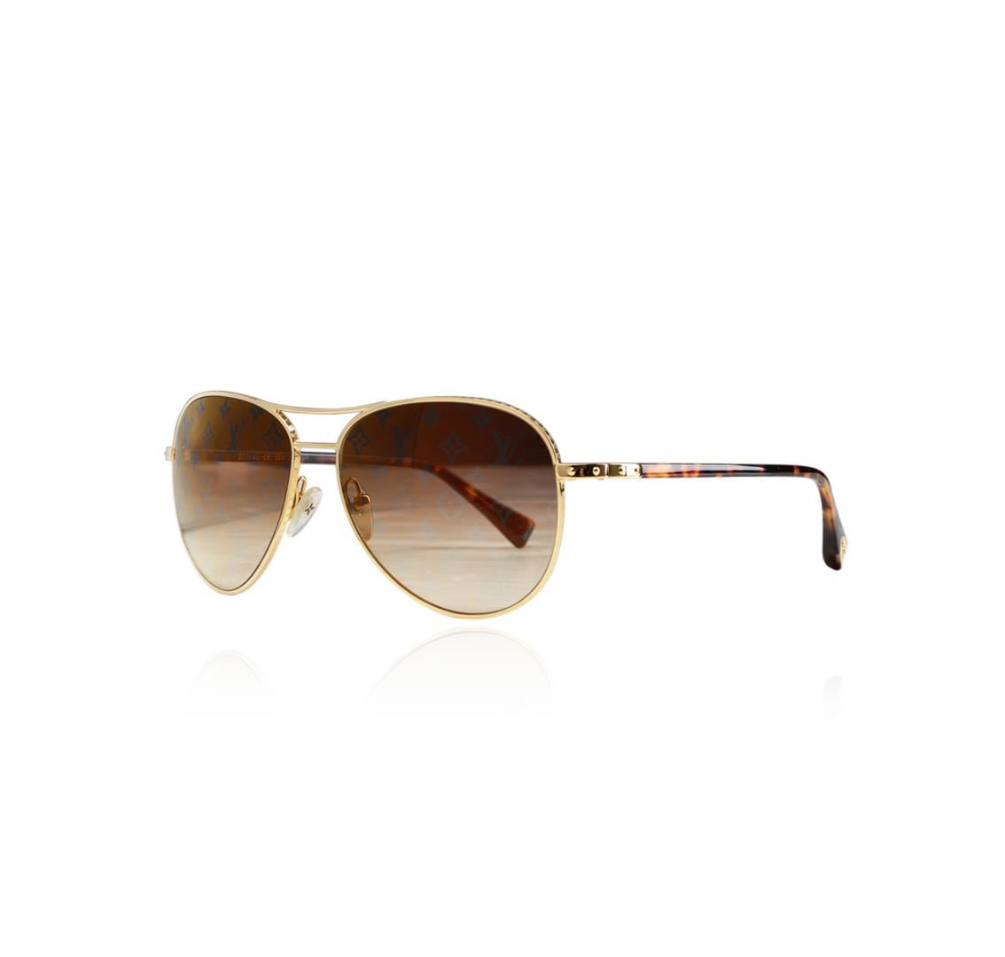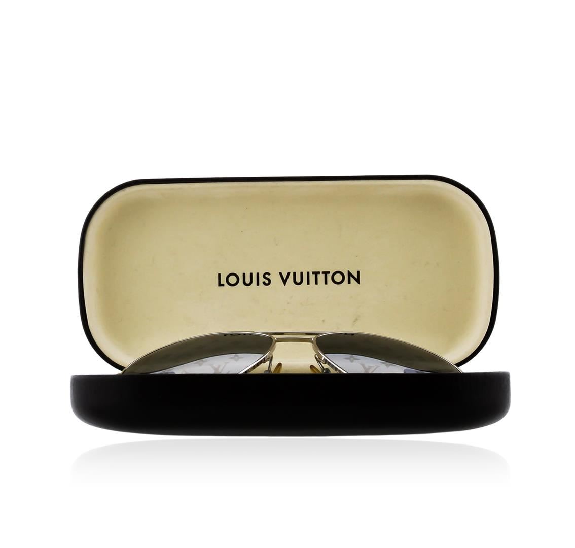 One Louis Vuitton gold Conspiration pilot-style sunglasses. Hinges evoke traditional trunk of the House. 100% UV protection, metal frame engraved with Louis Vuitton logos, sculpted acetate, hand-polished stems, exclusive Monogram Photochromique lenses, that darken in bright sunlight to reveal Monogram items.