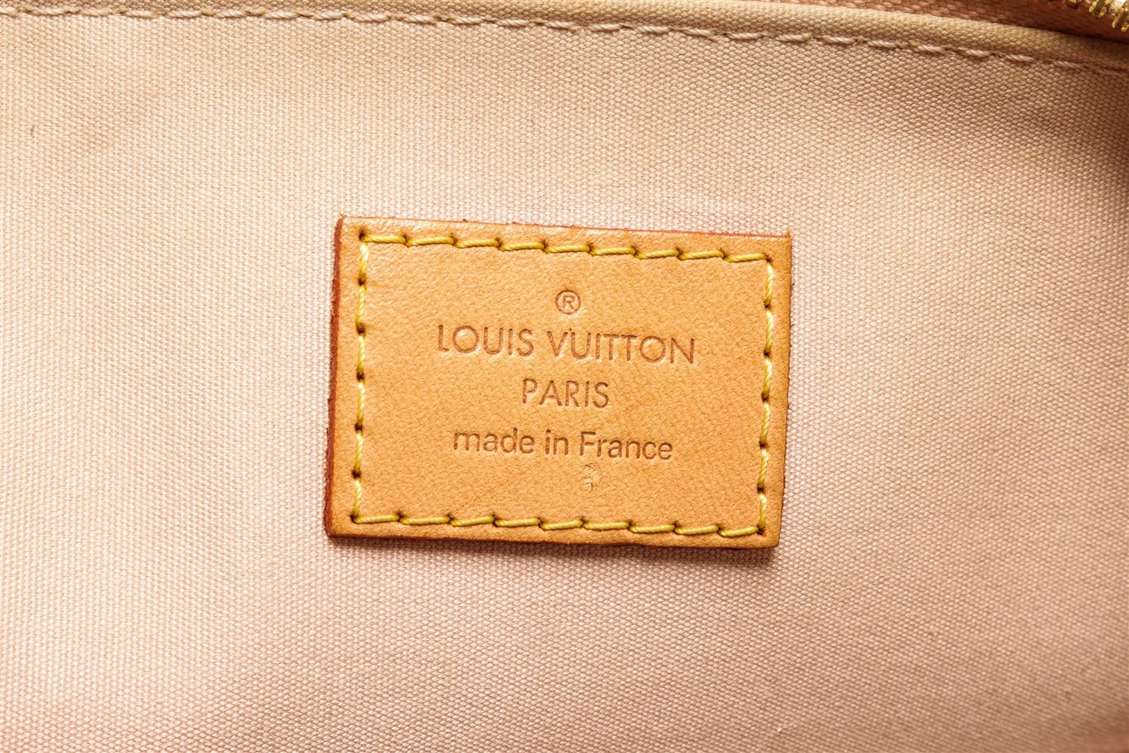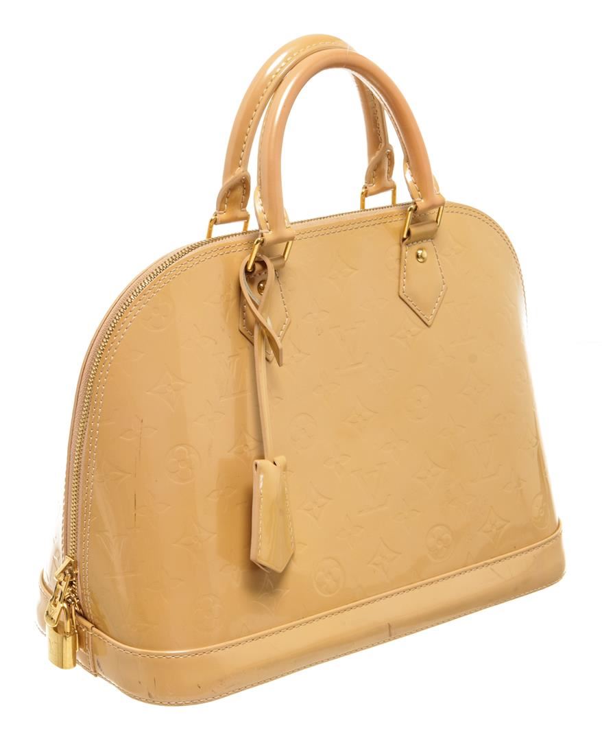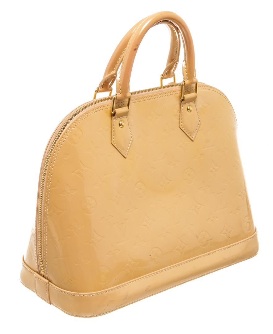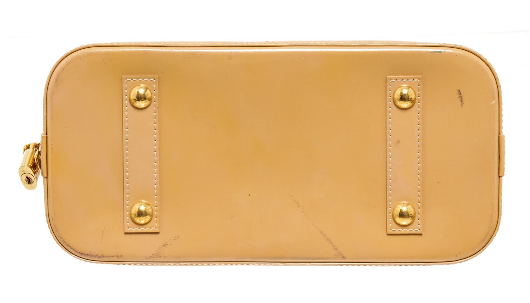 One Louis Vuitton Gold Monogram Vernis Alma PM Handbag. Item is sold AS-IS. All available information is listed in the description and shown in the photo. Louis Vuitton Gold Monogram Vernis Alma PM Handbag with monogram vernis, brass hardware, rolled handles, canvas lining & dual interior pockets,zip closure at top, protective feet at base, includes dust bag, lock & keys Height: 9.25" Width: 12.25" Depth: 6" , Handle Drop: 3.5" / 23.49 x 31.1 x 15.24 Cm