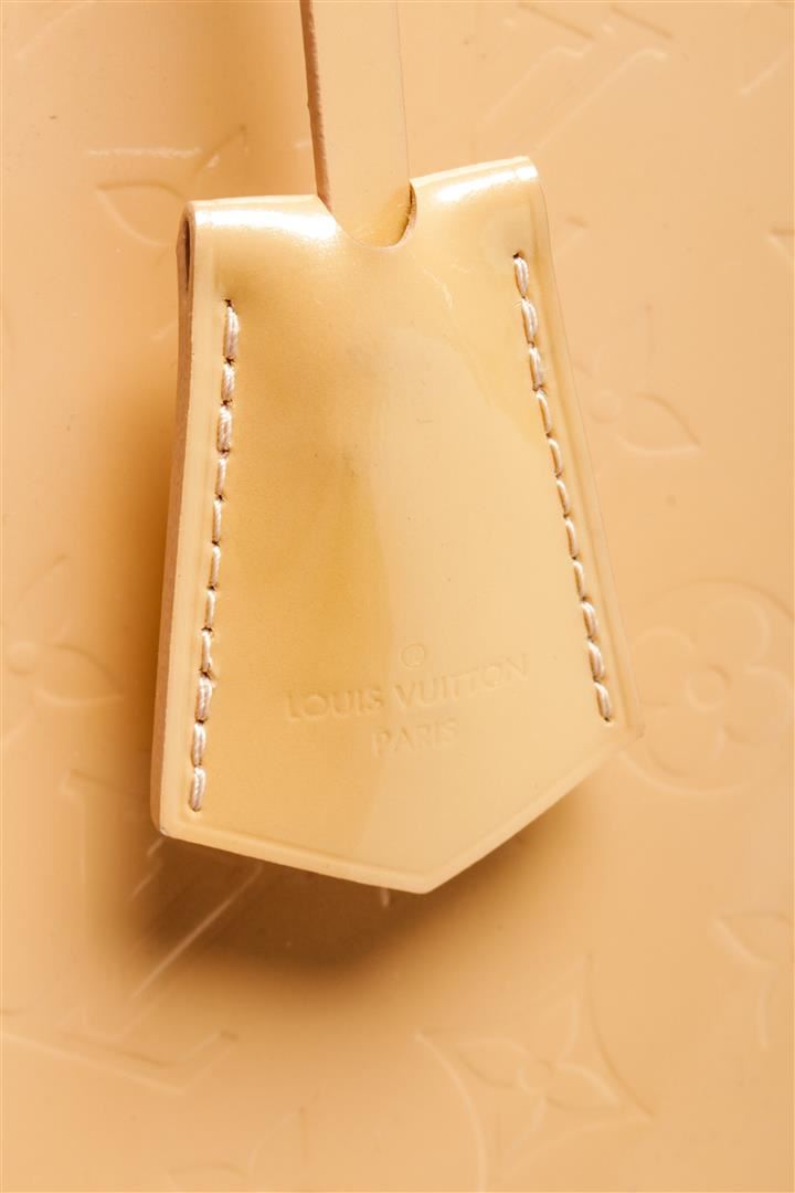 One Louis Vuitton Gold Monogram Vernis Alma PM Handbag. Item is sold AS-IS. All available information is listed in the description and shown in the photo. Louis Vuitton Gold Monogram Vernis Alma PM Handbag with monogram vernis, brass hardware, rolled handles, canvas lining & dual interior pockets,zip closure at top, protective feet at base, includes dust bag, lock & keys Height: 9.25" Width: 12.25" Depth: 6", Handle Drop: 3.5" / 23.49 x 31.1 x 15.24 Cm