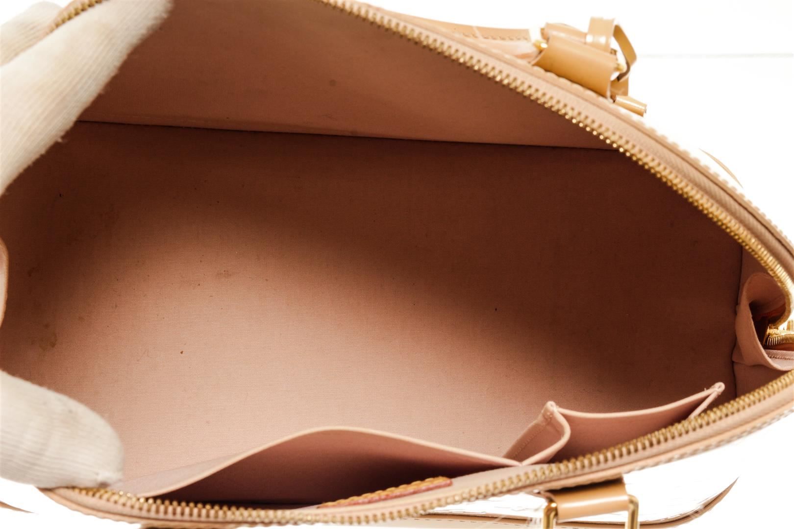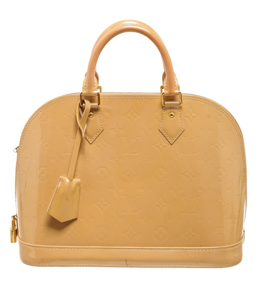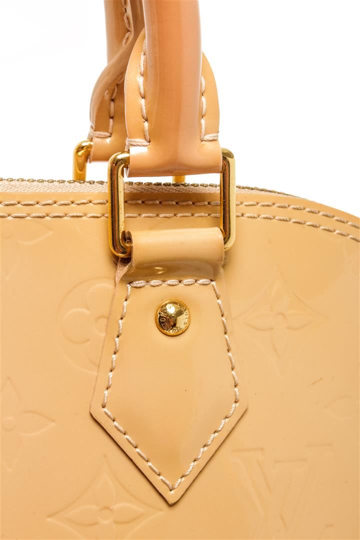 One Louis Vuitton Gold Monogram Vernis Alma PM Handbag. Item is sold AS-IS. All available information is listed in the description and shown in the photo. Louis Vuitton Gold Monogram Vernis Alma PM Handbag with monogram vernis, brass hardware, rolled handles, canvas lining & dual interior pockets,zip closure at top, protective feet at base, includes dust bag, lock & keys Height: 9.25" Width: 12.25" Depth: 6", Handle Drop: 3.5" / 23.49 x 31.1 x 15.24 Cm