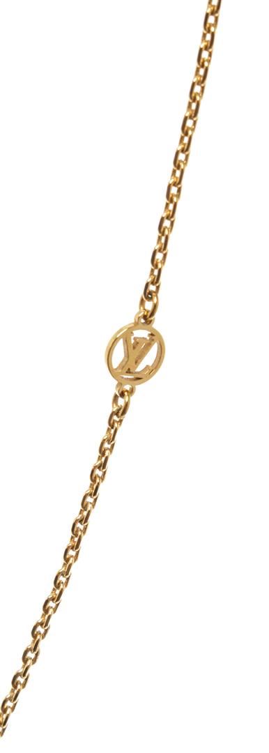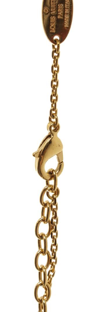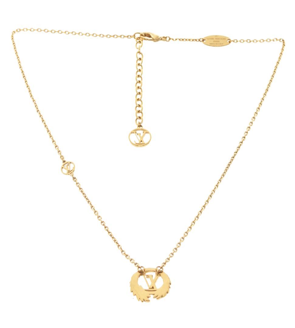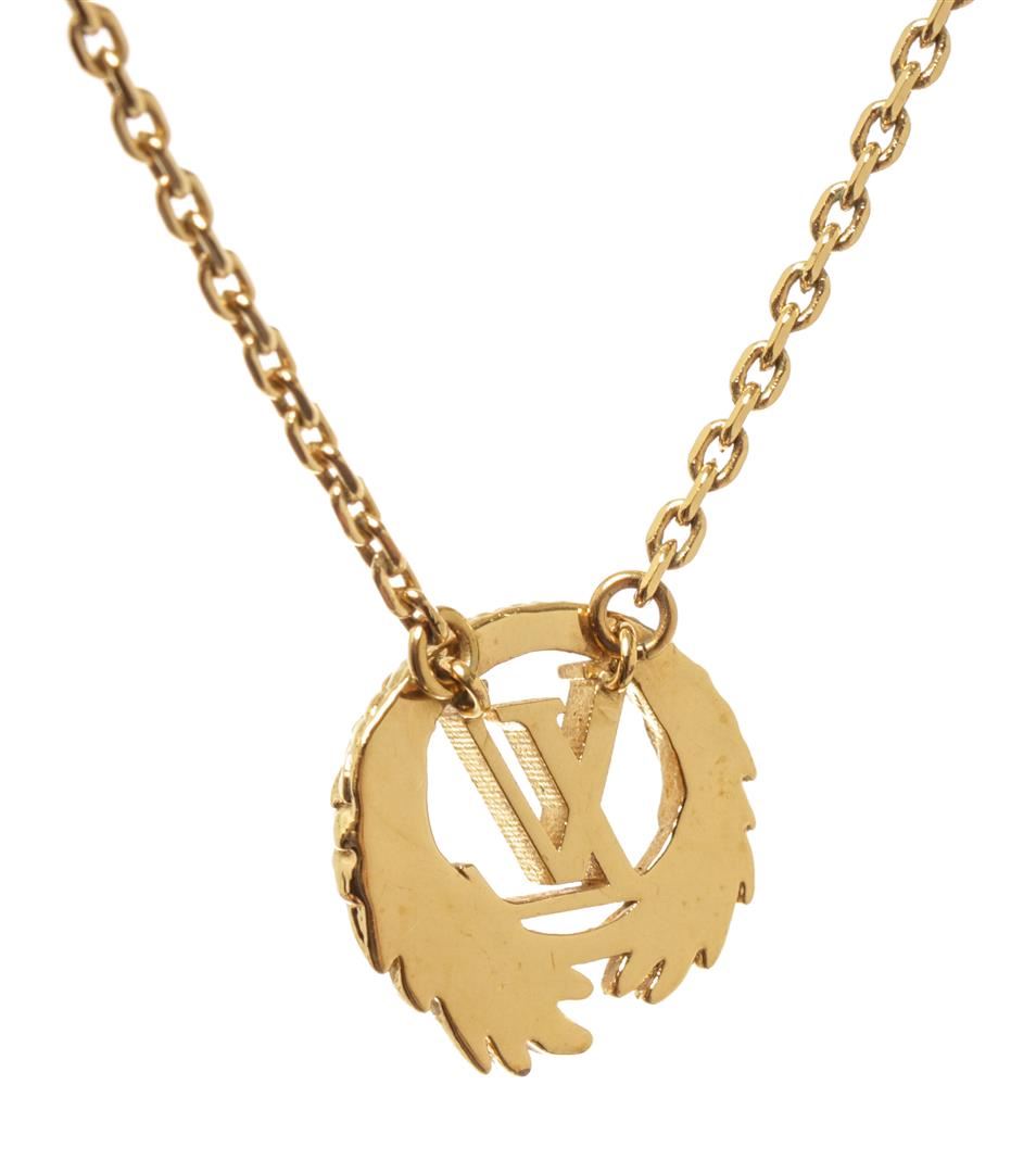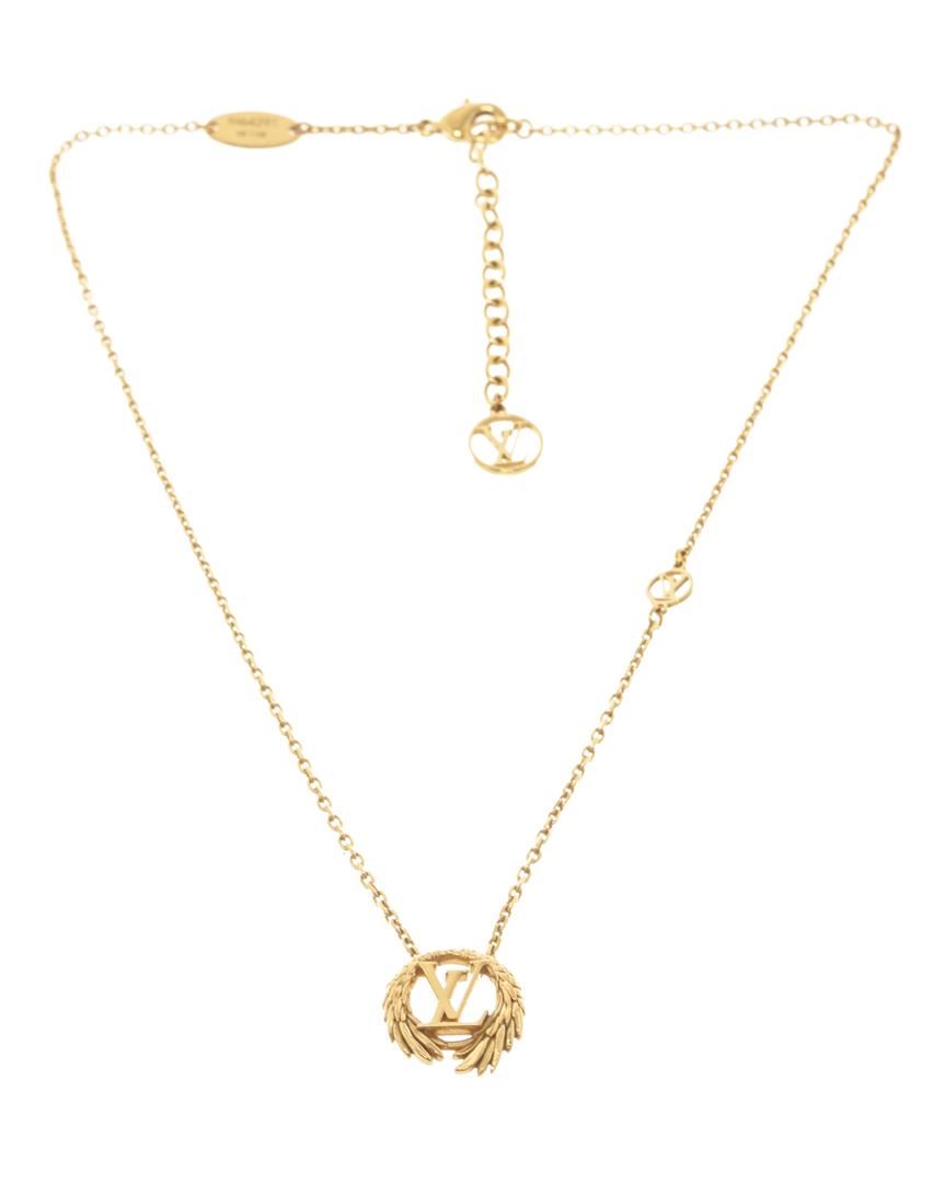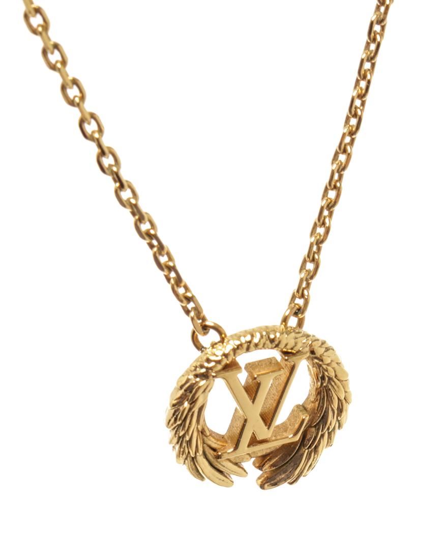 One Louis Vuitton Gold-tone Collier LV Angel Pendant Necklace. Item is sold AS-IS. All available information is listed in the description and shown in the photo. Louis Vuitton Gold-tone Collier LV Angel Pendant Necklace features several signature Louis Vuitton charms suspended from a cable chain that can be adjusted for a custom fit with lobster clasp closure.