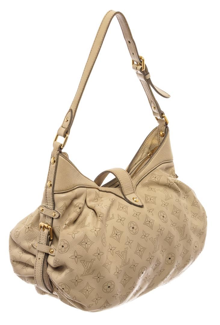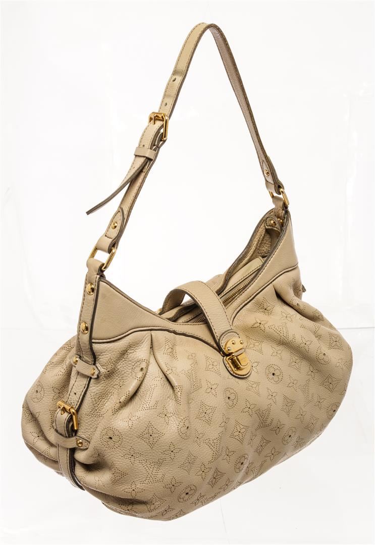 Louis Vuitton Gray Leather Mahina XS Shoulder Bag. All available information is listed in the description and shown in the photos. Louis Vuitton Gray Leather Mahina XS Shoulder Bag with neutrals leather, brass hardware, single adjustable shoulder strap, lasercut accents, alcantara lining & dual interior pockets, push-lock closure at front. Height: 9.75" Width: 15" Depth: 5.5", Shoulder Strap Drop: 21.75" / 24.76 x 38.1 x 13.97 Cm