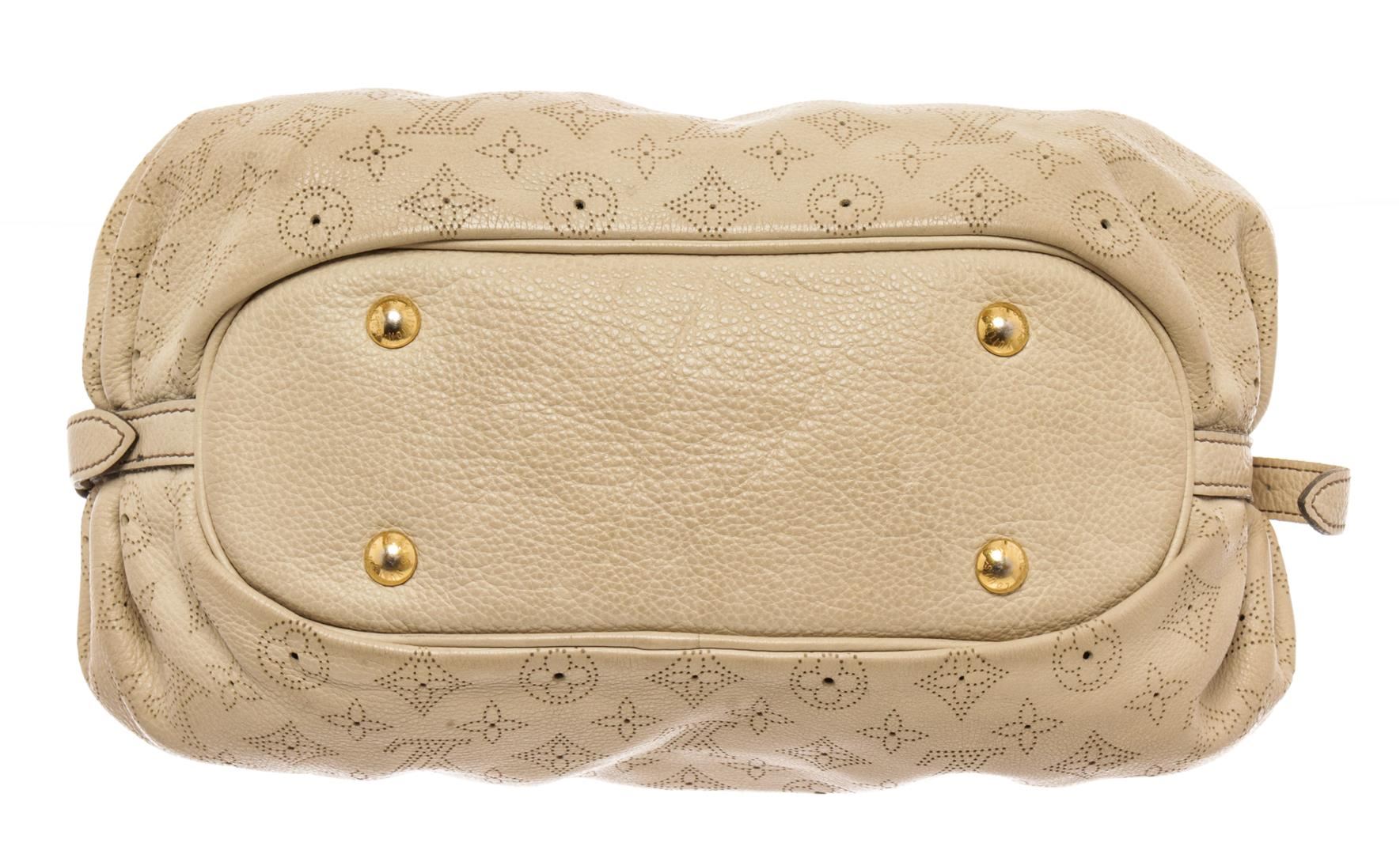 Louis Vuitton Gray Leather Mahina XS Shoulder Bag. All available information is listed in the description and shown in the photos. Louis Vuitton Gray Leather Mahina XS Shoulder Bag with neutrals leather, brass hardware, single adjustable shoulder strap, lasercut accents, alcantara lining & dual interior pockets, push-lock closure at front. Height: 9.75" Width: 15" Depth: 5.5", Shoulder Strap Drop: 21.75" / 24.76 x 38.1 x 13.97 Cm