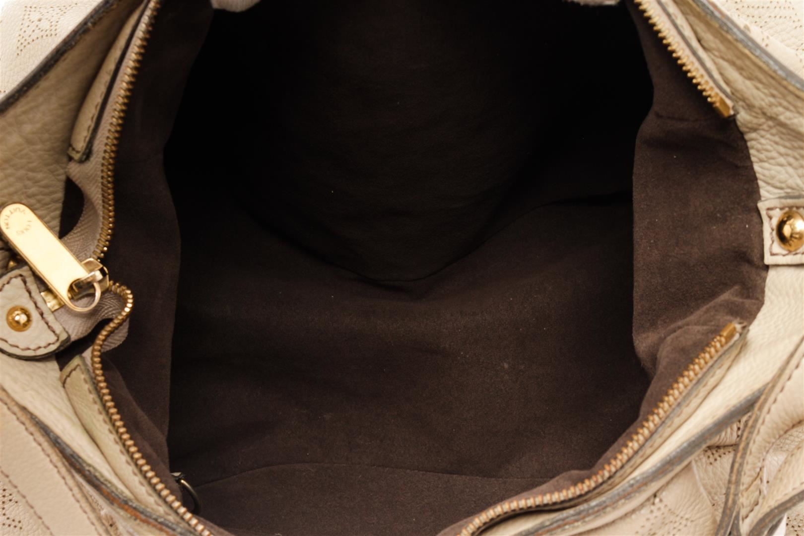 Louis Vuitton Gray Leather Mahina XS Shoulder Bag. All available information is listed in the description and shown in the photos. Louis Vuitton Gray Leather Mahina XS Shoulder Bag with neutrals leather, brass hardware, single adjustable shoulder strap, lasercut accents, alcantara lining & dual interior pockets, push-lock closure at front. Height: 9.75" Width: 15" Depth: 5.5", Shoulder Strap Drop: 21.75" / 24.76 x 38.1 x 13.97 Cm